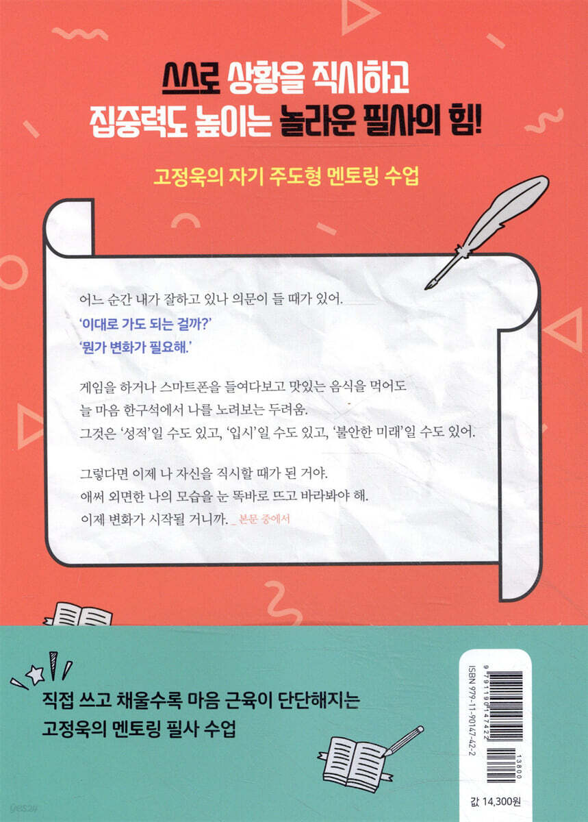 & 마음 근육이 단단해지는 명언 수업 고정욱 작가는 “명언은 우리 각자에게 용기를 주는 말”이며 “말의 힘을 느낄 수 있는 최고의 무기”라고 강조한다. 마음에 새긴 명언 한 마디는 삶에 큰 변화를 가져다줄 수 있다. 명언을 직접 써보는 과정을 통해 그냥 읽고 지나갈 때보다 집중력은 훨씬 높아지고, 내용은 더 오래 마음에 남으며 생각해볼 시간을 제공한다. 2. 각 명언에 대한 고 박사의 멘토링 수업, 〈고박사의 한마디〉 책장을 넘길 때마다 소개되는 명언과 함께 ‘고 박사의 한마디’를 읽는 재미 또한 쏠쏠하다. 전국 각지의 초중고교로 강연을 다니며 청소년과 밀접하게 소통해 온 저자는 그들에게 이야기를 들려주듯 인생의 지혜와 삶을 사는 태도를 이야기한다. 3. 하루 3분, 나만의 마음 성장 노트 《고정욱의 마인드 리셋 필사 수업》에는 필사 공간뿐 아니라 나만의 생각을 풀어갈 수 있는 다양한 장치가 마련되어 있다. 명언마다 나만의 ‘깨달음 지수’를 표시하며 현재 자신의 관심사, 고민이 무엇인지 생각해 볼 수 있다. 매 챕터가 끝나면 가장 기억에 남는 명언을 다시 떠올려보고, 왜 인상적이었는지 적어보는 공간도 있다. 명언을 통해 자신을 들여다보고 생각을 정리해 보는 좋은 기회가 될 것이며, 나아가 스스로에 대해 깊이 알아갈 수 있는 첫걸음이 될 것이다. 4. 명언에 관한 다양한 정보 수록 더 많은 정보를 원하는 학생들을 위해 명언을 남긴 사람에 대한 다양한 정보를 실었다. 해당 명언을 남긴 명사의 간략한 생애와 주요 업적, 흥미로운 일화 등이 소개되어 있다. 1장에서는 막연하게 느끼는 두려움과 마주하고 자신의 상황을 인식한다. 정체 모를 불안을 직시했다면 2장에서는 생각에 잠겨보는 시간을 가진다. 무엇이 문제인지, 어디서부터 어떻게 하면 좋을지 생각하는 과정을 통해 시행착오를 줄일 수 있다. 3장에는 생각한 것을 토대로 꿈을 향해 나아가며, 고통과 난관을 극복하는 데 도움 되는 명언이 수록되어 있다. 다음으로는 노력과 인내를 보상받는 성공에 이르는 길이다. 나에게 성공이란 무엇이며 성공하기 위한 비결은 무엇인지 생각하는 기회가 될 것이다. 마지막 장에서는 성공의 완성 단계로서 성공을 위해 함께 노력한 사람들과의 나눔을 생각해 본다. |