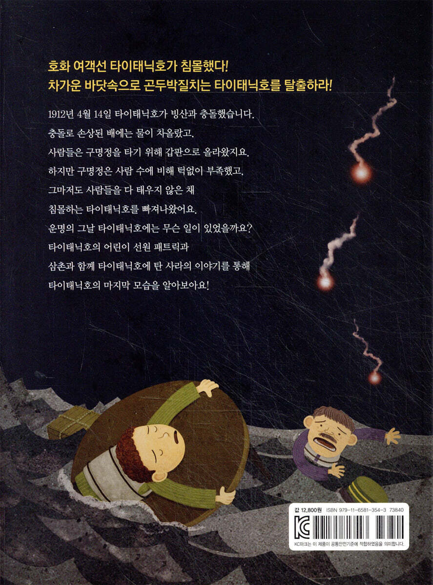 이 호화롭고 으리으리한 여객선은 1912년 4월 15일, 사상 최대의 해난 사고 중 하나라는 오명과 함께 역사 속으로 가라앉습니다. 대부분의 선박 사고가 그러하듯 타이태닉호 역시 재난을 막을 여러 번의 기회가 있었습니다. 빙산을 발견했을 때 배의 속도를 줄였다면 빙산과의 충돌을 피할 수 있었을 것이고, 사고 며칠 전 예정되었던 구명정 훈련을 제대로 했더라면 배가 침몰하는 상황에서 선원들이 우왕좌왕하지 않았을 것이고, 무엇보다도 구명정이 충분히 있었다면 더 많은 사람을 살릴 수 있었을 거예요. 하지만 안타깝게도 타이태닉호는 그 기회들을 모두 놓쳐 버렸습니다. 문제의 그날, 사라와 패트릭은 서로의 생일을 축하하고 있었어요. 두 사람이 따뜻한 수영장에서 헤엄치는 순간, 엔진이 멎었습니다. 천천히 배에 물이 차올랐고, 얼마 지나지 않아 악몽 같은 상황이 펼쳐지기 시작했습니다. “지금 아니면 영영 못 가요, 젊은 아가씨.” 갑판원이 말했다. 그는 바다로 내려가는 구명정을 향해 나를 잡아당겼다. “잠깐만요! 안 돼요!” 나는 패트릭을 돌아보며 소리쳤다. “갑판원 말이 맞아, 사라. 어서 타! 빨리!” 패트릭이 재촉했다. 나는 깨달았다. 패트릭은 구명정에 탈 수 없다는 것을……. 국적도, 자라온 환경도 다른 사라와 패트릭은 타이태닉호에서 처음 만나 깊은 우정을 나눕니다. 생사의 기로에서도 서로를 먼저 생각하며 이타심을 발휘하는 모습은 가슴이 뭉클해지지요. 그 외에도 가라앉는 배에서 객실 문을 걸어 잠그며 마지막을 준비하는 거동이 불편한 노부부, 흥분한 사람들을 진정시키기 위해 음악을 연주하는 음악가들, 동양인이라는 이유로 구조를 꺼리는 선원과 생판 모르는 타이태닉호의 생존자들에게 기꺼이 방을 내준 카르파티아호 승객들까지. 『타이태닉에서 탈출하기』에는 재난의 비극 속에서 펼쳐지는 여러 드라마를 통해 인간의 여러 모습을 보여주고, 안타까움과 슬픔, 감동을 선사합니다. 한편, 구명정을 내리는 과정에서 배가 크게 흔들리는 바람에 사라는 바다에 빠지고 맙니다! 패트릭 역시 살아남기 위해 바다로 몸을 던집니다. 한 치 앞을 알 수 없는 위험천만한 상황! 과연 사라와 패트릭은 무사히 타이태닉호를 탈출할 수 있을까요? 『타이태닉에서 탈출하기』를 통해 세계에서 가장 유명한 침몰선 속으로, 긴박감 넘치는 생생한 이야기 속으로 함께 떠나 보아요. |