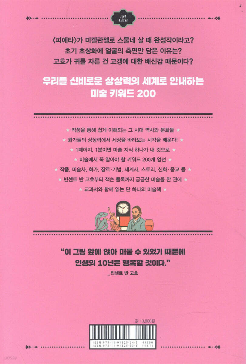 프롤로그 1. 작품 : 반드시 알아야 할 교양 필수 명화 진주 귀고리를 한 소녀 | 붉은색의 조화(후식) | 해바라기 | 오필리아 | 봄 | 아르놀피니 부부의 초상화 | 절규 | 유디트와 홀로페르네스 | 피에타 | 마라의 죽음 | 스케이트를 타는 목사 | 만종 | 요람 | 키스 | 올랭피아 | 밤의 카페 테라스 | 그랑자트섬의 일요일 오후 | 바느질하는 어부의 부인 | 폭풍 | 대사들 | 회색과 검은색의 배열 | 십자가에서 내려지는 예수 | 시녀들 | 부러진 기둥 | 거울을 보는 아프로디 테 | 최후의 심판 | 이젠하임 제단화 | 까마귀 나는 밀밭 2. 미술사 : 원시미술부터 근대미술까지 미술사의 결정적 명장면 원시미술Ⅰ | 원시미술Ⅱ | 이집트 미술 | 고대 그리스 미술 | 헬레니즘 미술 | 초기 기독교 미술 | 중세 미술 | 성상, 그림이 된 성서 | 초기 르네상스 | 전성기 르네상스Ⅰ | 전성기 르네상스Ⅱ | 전성기 르네상스Ⅲ | 플랑드르 르네상스, 장르화 | 매너리즘 미술 | 바로크 미술 | 네덜란드 바로크 | 신교국가의 미술 | 로코코 미술 | 신고전주의 | 아카데미 화풍 | 낭만주의 | 근대 풍경화 | 사실주의 | 낙선전 | 인상주의 | 일점 시점에서의 탈출 | 표현주의 | 추상으로 가는 풍경 | 야수파 | 신조형주의 | 다리파 | 뜨거운 추상 3. 화가 : 미술사에 한 획을 그었거나 인상적인 삶을 산 예술가 빈센트 반 고흐 | 클로드 모네 | 로사 보뇌르 | 에드가르 드가 | 비제 르브룅 | 얀 반 에이크 | 미켈란젤로 부오나로티 | 카라바조 | 산드로 보티첼리 | 베르트 모리조 | 자크 루이 다비드 | 앙리 드 툴루즈 로트레크 | 레오나르도 다빈치 | 폴 고갱 | 소포니스바 앙귀솔라 | 요하네스 페르메이르 | 렘브란트 판 레인 | 페테르 파울 루벤스 | 티치아노 베첼리오 | 귀스타브 쿠르베 | 디에고 벨라스케스 | 오귀스트 르누아르 | 앙겔리카 카우프만 | 베노초 고촐리 | 유딧 레이스테르 4. 장르·기법 : 거장들이 시행착오 끝에 완성한 회화 양식과 기술 소토 인 수 | 장례식용 초상 조각 | 드리핑과 액션 페인팅 | 우키요에 | 정물화 | 이콘화 | 데쿠파주 | 모노타이프 | 트롱프뢰유 | 조각의 인상주의자 | 클루아조니슴 | 석판화 | 바니타스 | 점묘법 | 숭고미 | 여성 누드 조각상 | 카메라오브스쿠라 | 단축법 | 아르누보 양식 | 메르츠 | 퇴폐 미술 | 프레스코화 | 템페라화 | 제단화 | 보데곤 | 원근법 | 페트 갈랑트 | 역사화 | 임파스토 | 초상화 5. 세계사 : 세계 역사의 주요 사건을 기록한 시대적 명화 고대 스파르타 | 이수스 대전의 승리 | 로마의 건국 | 카이사르의 죽음 | 로마 제정의 시작 | 기독교의 확산 | 콘스탄티누스 황제 집권 | 동로마제국의 발전 | 샤를마뉴와 신성 로마제국 | 십자군 전쟁 | 백년전쟁 | 피렌체 공의회와 르네상스 | 스페인의 국토회복운동 | 보름스 국회와 마르틴 루터 | 영국 국교회 창시 | 9일의 여왕 | 네덜란드 독립전쟁 | 미국 독립 전쟁 | 프랑스 대혁명 | 카를로스 4세의 몰락 | 나폴레옹 황제의 대관식 | 프랑스의 스페인 침략 | 프랑스 7월 혁명 | 오스만 남작의 파리 | 독일제국의 탄 생 | 제1차 세계대전 | 나치의 게르니카 폭격 | 홀로코스트의 시대 6. 스토리 : 걸작에 숨겨진 뒷이야기와 미술사 속 논란의 순간 저속하고 천박한 주제 | 사라진 가셰 박사 | 난 너를 원해 | 자존심으로 건진 1원 | 쌍둥이 모나리자의 발견 | 허름한 농가에 숨겨진 대작 | 고흐의 귀 | 나는 누구의 것인가 | 찢겨진 채 팔려나간 초상화 | 미라보 다리 아래 센강이 흐르듯 | 예수의 옆에 있는 이는 누구인가 | 전화 한 통이 바꾼 무하의 인생 | 영국이 반출을 막은 보물 | 베아트리체의 진실 | 6개월간의 왕비 | 말은 그렇게 달리지 않았다 | 파리를 뒤흔든 마담 X | 종교재판에 회부된 그림 | 왕의 여인이 된 마담 퐁파두르 | 교황의 사생활 | 속옷 차림의 오스트리아 여자 | 7만 원에서 5천억 원으로 | 걱정 속에 지워진 얼굴 | 애증의 모녀 | 그녀의 마지막 모습 | 넬슨 제독의 사랑 | 레오 10세, 삶 자체가 스캔들 | 구두 수선공 발판 속 비밀 7. 신화·종교 : 작품으로 만나는 그리스 신화와 성서, 그리고 전설 은하수의 기원 | 아프로디테의 탄생 | 팔라스와 켄타우로스 | 헤파이스토스의 대장간 | 자식을 잡아먹는 크로노스 | 디오니소스와 아리아드네 | 파리스의 선택 | 거미가 된 자만심 | 갈라테이아 | 라오콘 | 제우스와 테티스 | 또 다른 바벨탑의 시대 | 마리아의 결혼식 | 수태고지 | 마리아의 방문 | 예수 탄생 | 동방박사의 경배 | 황금방울새와 성모 | 세례 요한의 탄생 | 예수 세례 | 성 마태오의 소명 | 예수의 체포 | 베로니카의 수건 | 베드로의 십자가 처형 | 십자가 처형과 구원 | 엠마오의 식사 | 성모의 대관 | 산타클로스의 기원 | 성녀 헬레나 참고자료 INDEX |