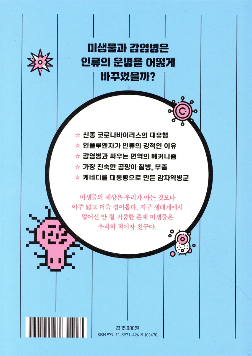 --- 「시작하며」중에서 (…) 1928년, 플레밍은 포도상구균을 배양하다가 부주의로 인해 배지에 푸른곰팡이가 생기게 했다. 그 배지를 관찰한 플레밍은 곰팡이 주위의 포도상구균이 녹아 있는 것을 발견했다. 푸른곰팡이즙에 포함된 물질은 푸른곰팡이의 속명 페니실륨(Penicillium)을 따서 ‘페니실린’이라는 이름이 붙었다. 이것이 인류 역사상 최초의 항생제다. --- 「03 항생제 덕분에 인류는 감염병을 이길 수 있게 되었다?」중에서 병원체와 싸운 면역세포는 다음에 같은 병원체가 침입할 것에 대비하며 우리 몸에서 잠들어 있다. 이것을 획득면역의 장기기억이라고 한다. 그런데 신종 코로나바이러스 감염 연구가 진행되면서 코로나에 확진되었다가 회복한 뒤에도 항체가 충분히 생성되지 않아 획득면역의 장기기억이 이루어지지 않는 경우가 있다는 것이 밝혀졌다. 몇몇 바이러스는 면역세포를 감염시켜 면역의 기억 작용을 방해하는 것으로 보인다. 그러면 불행히도 같은 바이러스에 여러 번 감염될 수 있다. --- 「04 우리가 감기에 걸리는 이유」중에서 1917년 존 F. 케네디가 태어났다. 그는 어머니에게 엄격한 교육을 받으며 자랐고 1961년 미합중국의 대통령이 되었다. 감자역병균이 일으킨 ‘의문의 병’이 없었다면 케네디가는 미국으로 이주하지 않고 지금까지 아일랜드에서 살고 있을지도 모른다. 이렇게 미생물은 때로 인생을 바꿀 만큼 큰 영향력을 발휘하기도 한다. --- 「07 케네디를 대통령으로 만든 감자역병균」중에서 우두는 천연두보다 훨씬 안전한 질병이었기 때문에 제너는 우두가 천연두 예방에 적용될 수 있는지에 대해 연구를 계속했다. 1796년 5월 14일 제너는 마침내 그의 집 하인의 아들인 8세 소년에게 우두 고름을 접종했다. 소년은 미열과 불편함을 호소했지만 심각한 증상은 보이지 않았다. 6주 후 제너는 그 소년에게 천연두 고름을 접종했다. 제너가 예측했듯이 그 소년은 천연두에 걸리지 않았다. --- 「19 역사상 가장 두려운 질병 - 천연두」중에서 (…) 바이러스에는 항상 해로운 이미지가 따라다녔다. 하지만 근래 들어 바이러스 중 상당수는 병원성이 없을 뿐 아니라 생물의 진화에 크게 기여했다는 사실이 서서히 밝혀지고 있다. (…) 바이러스에는 자신의 유전자를 숙주세포의 유전자에 집어넣는 성질을 가진 것이 있다. 인간의 유전정보를 해석한 결과, 놀랍게도 그중 절반 이상이 바이러스에서 유래했을 가능성이 있다는 것이 알려진 것이다. --- 「32 바이러스는 무엇일까?」중에서 |