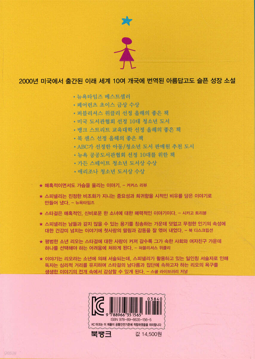 남들과 같지 않을 수 있는 용기를 칭송하는 가운데 마법과도 같은 첫사랑의 떨림을 순수하고 감동적으로 그려 낸 뉴베리상 수상 작가의 성장 소설. 다른 나라 이야기라고 하기에는 너무나도 친근하게 느껴지는 주인공들은 우리 고등학교 아이들의 공감을 불러일으키기에 충분하다. 작가는 주인공 리오의 심리를 생생하게 그려냄으로써, 청소년들 사이의 사랑과 우정 그리고 덧없고 무정한 인기의 속성과 집단 따돌림 문제까지 적확하면서도 아름답게 그려 내고 있다. 소설의 1인칭 화자이자 주인공의 남자친구인 리오 벌록은 그애 ‘스타걸’을 알게 되면서 새로운 세상에 눈을 뜬다. ‘아무것도 아닌 것’들로 차 있던 ‘회색빛 세상’은 이제 ‘많은 볼 것’들로 가득한 경이로운 세상이 되고, 이전까지 눈에 띄지 않던 작고 평범한 것들에 관심을 기울이며 마음으로 보는 법을 배운다. 제리 스피넬리, 『스타걸』 그리고 영화화…… 북뱅크 출판사가 뉴베리상 수상 작가 제리 스피넬리의 아름다운 성장 소설 『스타걸』을 발견하여 펴낸 것은 2002년이었습니다. 당시 제리 스피넬리는 국내에 알려지지 않은 작가였던 만큼 『스타걸』은 미국에서의 인기와 달리 주목받지 못했습니다. 게다가 미국과 일본에서 영어덜트(YA) 장르 문학 붐이 불고 있던 것과 달리 우리나라에 YA 장르 문학이 아직 자리를 잡기 전이어서 『스타걸』은 그다지 빛을 보지 못했습니다. 5년 동안 조용히 독자들의 입에서 입으로 전해지기는 하였으나, 5년 후 계약 연장을 하여 개정판을 낸 이후로 마니아층 이상으로 독자가 확대되지는 못했습니다. 그리하여 어쩔 수 없이 절판을 할 수밖에 없었고, 그 후 10년이 흐르는 사이 『스타걸』은 완전히 잊혔다고 생각하고 있었는데, 많은 분이 아쉬워하며 재출간 요청을 하였습니다. 또, 2020년에 미국에서 이미 영화화되었다는 사실도 알게 되었습니다. 저희는 고민 끝에 다시 한번 출간하기로 마음먹었습니다. 다행히 판권이 살아있었습니다. 마침 스타걸 영화를 제작한 디즈니 플러스 한국 진출과 맞물려 더욱 뜻깊은 출간이 되었습니다. 독자는 이 책을 읽고 나서 영화를 볼 수도 있고, 영화를 보고 책을 읽을 수도 있게 된 것이지요. 20년 후 번역을 여러 번 손보아 재출간하게 된 『스타걸』이 더 많은 독자의 가슴에 영원한 ‘별’로 남기를 기대해 봅니다. - 2022년 3월 도서출판 북뱅크 편집부 역자 후기 스타걸이 처음 마이카 고등학교에 나타났을 때 아무도 그애를 진짜 학생으로 믿지 않았을 정도로 그애는 다른 아이들과 달랐다. 청바지 대신 긴 치마를 즐겨 입는 아이. 역사 시간에 난쟁이 요정에 관한 질문을 하는 아이. 해바라기 무늬 천 가방 속에 애완용 쥐를 넣고 다니는 아이. 빗속에서 춤을 추는 아이. 그리고 점심시간마다 우쿨렐레를 치며 생일 축하 노래를 불러 주는 아이. 자의식 없는 스타걸의 순수한 행동들에 자극받은 마이카의 학생들은 마치 개구리가 잠에서 깨어나듯 각자의 개성을 찾아감과 동시에 진정한 공동체 의식을 갖게 된다. 하지만 ‘기적’은 오래가지 못하고 스타걸은 치어리더에 뽑힐 정도로 인기 있던 학생에서 모두가 미워하는 대상이 되고 마는데, 학교 대항 농구 경기에서 마이카 농구 팀의 득점을 기뻐하는 만큼 상대 팀의 득점에도 환호를 보내는 스타걸의 응원 태도가 그 원인이었다. 자아가 없는 듯 자신의 모든 관심을 남에게 쏟는 스타걸은 타인의 성공에 기뻐하고 모두를 응원함에 주저함이 없지만, 늘 승자이기만을 바라는 다른 학생들은 그런 스타걸을 이해하지 못하고 ‘따돌리기’의 대상으로 삼은 것이다. 하지만 스타걸은 학교를 떠나기 전 마지막 무도회에서 토끼춤으로 다시 한 번 학생들을 하나로 만드는 데 성공한다. 이 성공은 훗날 ‘내가 아닌 누군가를 위해 하루에 좋은 일 한 가지’를 하는 것이 약속인 해바라기란 이름의 학교 동아리와 상대 팀의 첫 득점에 환호를 보낼 줄 아는 학교 응원단의 존재로 이어진다. 십대들을 위한 좋은 작품을 여러 편 써온 뉴베리상 수상 작가 제리 스피넬리는 『스타걸』에서 청소년들 사이의 사랑과 우정, 미움과 갈등의 이야기를 적확하게 그러나 아름답게 그려 내고 있다. 스타걸은 자신의 이름처럼 가슴에 별을 품고 있는 아이이다. 자신을 지워 버리고 우주와 하나가 되어 별의 속삭임을 들을 수 있는 아이이고, 이제는 우리가 잃어버린 태초의 어떤 것과 연결되어 있는 그런 아이이다. 소설의 1인칭 화자이자 스타걸의 남자친구인 리오 벌록은 그러한 스타걸을 알게 되면서 새로운 세상에 눈을 뜬다. ‘아무것도 아닌 것’들로 차 있던 ‘회색빛 세상’은 이제 ‘많은 볼 것’으로 가득한 경이로운 세상이 되고, 이전까지 눈에 띄지 않던 작고 평범한 것들에 관심을 기울이며 마음으로 보는 법을 배운다. 너무나 달라 보였지만 ‘진정한 우리의 모습’ 또는 ‘잃어버린 우리의 옛 모습’에 다름없던 스타걸과의 만남은 독자들에게 사소한 것에의 관심과 타인에 대한 배려의 소중함을 생각하는 따뜻한 시간을 선사할 것이다. - 양원경 추천의 말 뉴욕타임즈 베스트셀러 페어런츠 초이스 금상 수상 퍼블리셔스