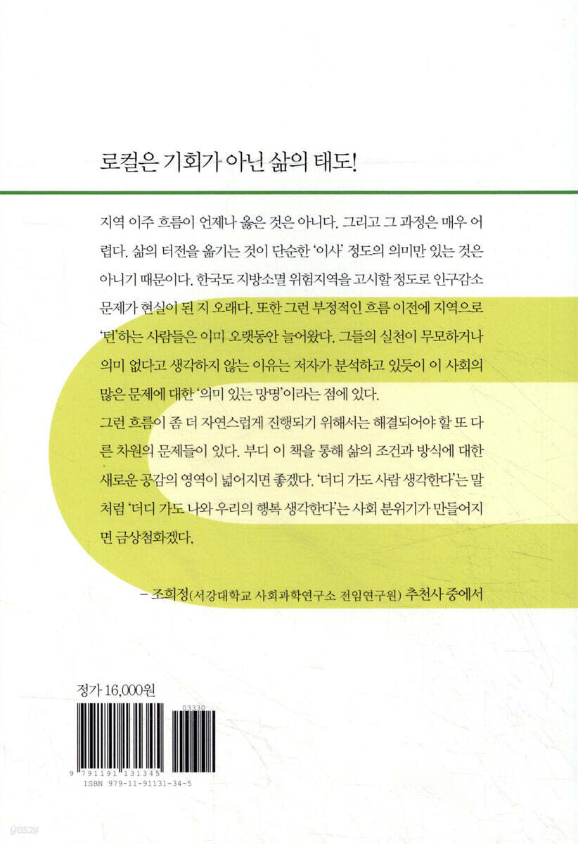 지역 이주 흐름이 언제나 옳은 것은 아니다. 그리고 그 과정은 매우 어렵다. 삶의 터전을 옮기는 것이 단순한 ‘이사’ 정도의 의미만 있는 것은 아니기 때문이다. 한국도 지방소멸 위험지역을 고시할 정도로 인구감소 문제가 현실이 된 지 오래다. 또한 그런 부정적인 흐름 이전에 지역으로 ‘턴’하는 사람들은 이미 오랫동안 늘어왔다. 그들의 실천이 무모하거나 의미 없다고 생각하지 않는 이유는 저자가 분석하고 있듯이 이 사회의 많은 문제에 대한 ‘의미 있는 망명’이라는 점에 있다.