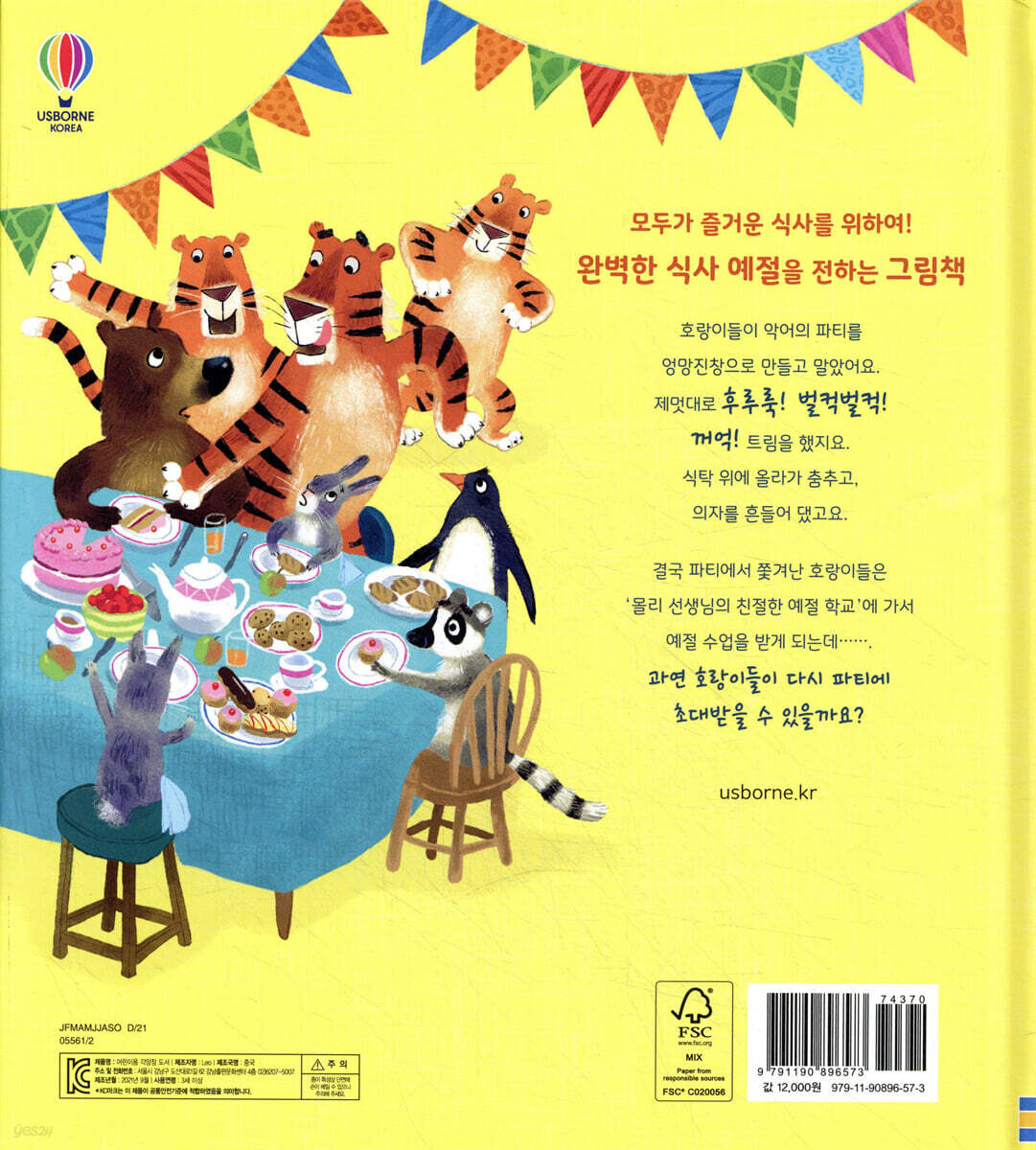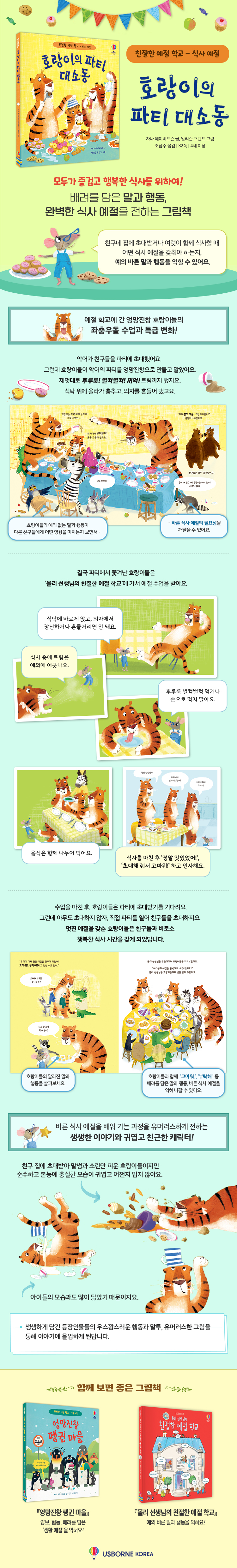 악어가 친구들을 파티에 초대했어요. 친구들은 맛있게 차려진 먹음직스러운 음식들을 보고 고맙다고 인사했지요. 그런데 갑자기 문이 벌컥 열리더니, 호랑이 세 마리 성큼성큼 들어왔어요. 그러더니 오렌지 주스를 후루룩후루룩! 들이켜고, 꺼억! 트림을 하고, 낄낄대다가 음식을 내뿜고 말았지요. 우유를 주전자째로 마시는가 하면, 식탁 위로 올라가고 의자에서 끄떡끄덕 몸을 흔들어 댔어요. 호랑이들의 소란에 파티는 엉망진창이 되었고 친구들은 하나둘 집으로 가 버렸어요. 화가 난 악어는 호랑이들을 쫓아냈지만 정작 호랑이들은 뭘 잘못했는지 알 수 없어 어리둥절했지요. 그리고 혹시 그곳에 가면 알 수 있을까 싶어서 호랑이들은 ‘몰리 선생님의 친절한 예절 학교’를 찾아가요. 몰리 선생님은 호랑이들에게 식탁에 바르게 앉는 법, 포크와 나이프를 쓰는 법, 무언가를 부탁하는 말부터 식사 자리에서 하지 말아야 하는 행동 등을 가르쳐 줘요. 사이좋게 음식을 나누어 먹는 것과 식사를 마친 후 ‘정말 맛있었어!’, ‘초대해 줘서 고마워!’ 같은 바른 인사말까지도요. 수업을 마친 후, 호랑이들은 파티를 열어 친구들을 초대해요. 멋진 예절을 갖춘 호랑이들은 친구들과 비로소 행복한 식사 시간을 갖게 되었답니다. * 바른 식사 예절을 배워 가는 과정을 유머러스하게 전하는 생생한 이야기와 귀엽고 친근한 캐릭터 친구 집에 초대받아 말썽과 소란만 피운 호랑이들이지만 순수하고 본능에 충실한 모습이 귀엽고 어쩐지 밉지 않아요. 아이들의 모습과도 많이 닮았기 때문이지요. 아이들은 생생하게 담긴 등장인물들의 우스꽝스러운 행동과 말투, 유머러스한 그림을 통해 이야기에 몰입하게 될 거예요. 그 과정에서 자신과 닮은 모습을 발견하기도 하고, 그런 모습을 객관적으로 바라보며 자신의 행동이 다른 사람들에게 어떤 불편을 끼칠 수 있는지 알고, 바른 식사 예절의 필요성을 깨달아가지요. 그리고 호랑이들과 함께 ‘고마워.’, ‘부탁해.’ 등 배려를 담은 말과 행동, 바른 식사 예절을 익혀 나갈 수 있어요. 이 모든 과정은 우리 모두의 식사가 즐겁고 행복하도록 이끌어 준답니다. |