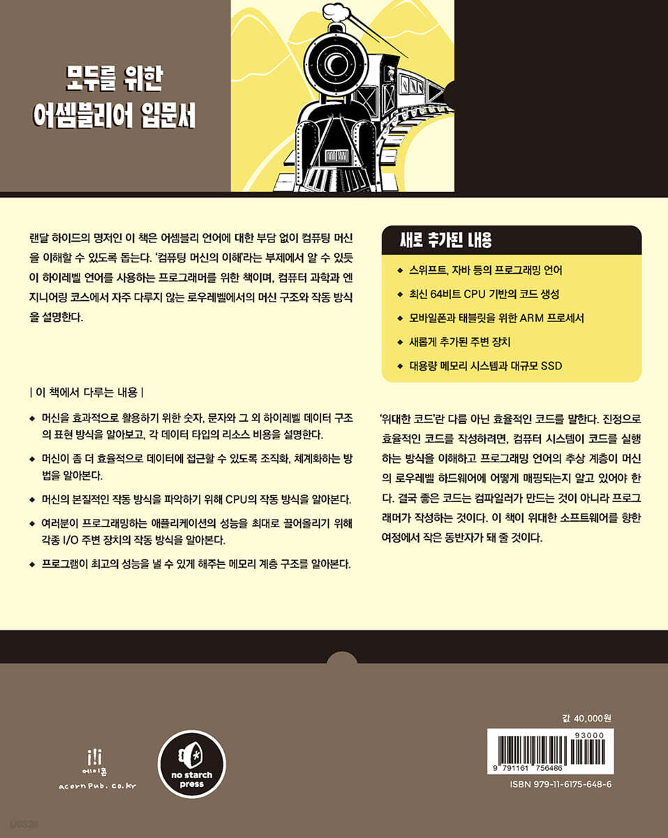 ◆ 효과적으로 머신을 활용하기 위한 숫자, 문자와 그 외 하이레벨 데이터 구조의 표현 방식을 알아보고, 각 데이터 타입의 리소스 비용 설명 ◆ 머신이 좀 더 효율적으로 데이터에 접근할 수 있도록 조직화, 체계화하는 방법 ◆ 머신의 본질적인 작동 방식을 파악하기 위한 CPU의 작동 방식 ◆ 애플리케이션의 성능을 최대로 끌어올리기 위한 각종 I/O 주변 장치의 작동 방식 ◆ 프로그램이 최고의 성능을 낼 수 있게 해주는 메모리 계층 구조 이 책의 대상 독자 특정 프로그램 언어에 맞춰 쓴 책이 아니기 때문에 설명하는 개념은 프로그래밍 언어의 종류와 관계없이 적용할 수 있다. 특정 언어를 사용하거나 알지 못해도 이 책을 읽는 데는 지장이 없도록 작성했으며, 이 책의 프로그램 예문은 이해의 폭을 넓히기 위해 몇 가지 언어를 교대로 사용한다. 예시를 설명할 때는 코드에 대한 정확한 설명을 덧붙일 것이므로, 해당 언어에 익숙하지 않더라도 프로그램의 동작 방식을 문제 없이 이해할 수 있을 것이다. 이 책의 구성 2장, 4장, 5장에서는 컴퓨터의 기본적인 데이터 표기법을 알아본다. 예를 들어 컴퓨터가 어떠한 방법으로 부호 있는 정수와 부호 없는 정수, 문자, 문자열, 문자 집합, 실수, 분수와 같은 값들을 표현하는지 알아본다. 컴퓨터가 다양한 자료를 어떻게 표현하는지 충분히 이해하지 못한다면, 특정 작업에서 왜 그렇게 많은 시간이 소요되는지 알 수 없을 것이다. 3장에서는 현대적인 컴퓨터 시스템에서 널리 사용하는 2진법의 계산과 비트 연산을 알아본다. 대부분의 프로그래밍 언어가 2진법과 비트 연산을 지원하므로, 이 책에서는 일반적인 프로그래밍 개론 과정에서 잘 다루지 않는 2진법과 논리 연산을 통해 코드의 성능을 향상시키는 방법을 소개한다. 탁월한 코드를 작성하는 프로그래머가 되기 위해서는 2진법 및 비트 연산을 능숙하게 활용할 수 있어야 할 것이다. 6장에서는 (컴퓨터가 메모리에 접근하는 방법과 메모리의 성능에 관련된 특징 등과 같은) 메모리에 대해 알아보며, CPU가 메모리에 있는 다양한 자료 구조에 접근할 때 사용하는 메모리 지정 모드도 살펴본다. 현대적인 애플리케이션의 성능 저하 문제 중 상당수는 프로그램이 메모리에 접근하는 방식을 잘못 지정해 발생하는 메모리 병목 현상과 관련이 있으며, 6장에서는 이러한 문제를 해결할 수 있는 기반 지식을 제공한다. 7장에서는 다시 데이터 표현으로 돌아가서 복합 데이터 타입과 메모리 객체를 다루며, 앞부분의 여러 장에서 다뤘던 내용과 달리 포인터, 배열 레코드, 구조체, 공용체 등과 같은 하이레벨 데이터 타입에 관해 설명한다. 적지 않은 프로그래머가 메모리나 성능상의 문제를 고려하지 않고 대용량의 복합 데이터 구조를 사용하는 경향이 있는데, 7장에서는 이런 하이레벨 복합 데이터 타입을 로우레벨의 관점으로 설명함으로써 프로그램에서 이 기법을 사용할 때 지불해야 할 비용이 얼마인지 알려준다. 이를 통해 이 기법을 좀 더 신중하고 현명하게 사용할 수 있게 될 것이다. 8장에서는 불리언 논리 연산과 디지털 설계를 다룬다. 8장에서는 CPU와 컴퓨터 시스템 요소를 이해하기 위해 필요한 수학적 토대와 논리 연산을 위한 기초 지식을 제공한다. 8장에서는 주로 불리언 표현식을 다루며, 그중에는 if, while 등 범용 하이레벨 언어에서 사용되는 불리언 식을 최적화하는 방법도 포함된다. 9장 역시 8장에 이어 하드웨어와 관련된 내용으로 CPU의 구조를 알아본다. 탁월한 코드를 작성하기 위해 프로그래머는 기본적인 CPU 설계와 연산 방식을 이해하고 있어야 한다. 여러분이 CPU가 코드를 실행하는 방식에 맞춰 코드를 작성할 수 있다면, 더 적은 시스템 자원을 사용해 더 좋은 성능을 얻을 수 있을 것이다. 10장에서는 CPU 명령어 집합 구조를 알아본다. 모든 CPU에서 명령어는 CPU 동작에 가장 기본이 되는 부분이고, 프로그램 수행 시간은 수행되는 명령어의 종류와 수에 직접적인 영향을 받는다. 컴퓨터 구조에서 명령어를 설계하는 방법을 이해하면 어떤 연산이 다른 연산보다 더 많은 시간이 걸리는 이유를 알 수 있다. 여러분이 명령어의 한계와 CPU가 명령어를 해석하는 방식을 이해하면, 형편없는 코드 시퀀스를 탁월한 코드로 탈바꿈시킬 수도 있다. 11장에서는 다시 메모리 주제로 돌아와서 메모리 아키텍처와 메모리 구조를 알아본다. 이 장은 코드의 실행 속도를 높이는 데 큰 도움이 될 것이다. 메모리의 계층 구조와 캐시의 성능을 극대화하는 방법, 다른 고속 메모리 구성 요소 등을 알아본다. 현대 애플리케이션의 일반적인 문제 중 하나인 스래싱(thrashing)을 알아보고, 저성능 메모리 접근 문제를 해결하는 방법도 살펴본다. 12장에서 15장까지는 컴퓨터 시스템과 외부 환경의 소통 방식을 알아본다. 컴퓨터 시스템과 연결된 다수의 입출력 주변 장치(peripheral device)는 CPU나 메모리에 비해 훨씬 느린 속도로 작동한다. 여러분이 작성한 개별 명령 시퀀스의 성능이 탁월하더라도, 이들 입출력 주변 장치의 한계 상황을 알지 못하면 애플리케이션의 전체 성능은 낮은 수준을 벗어날 수 없다. 따라서 책 후반의 네 개 