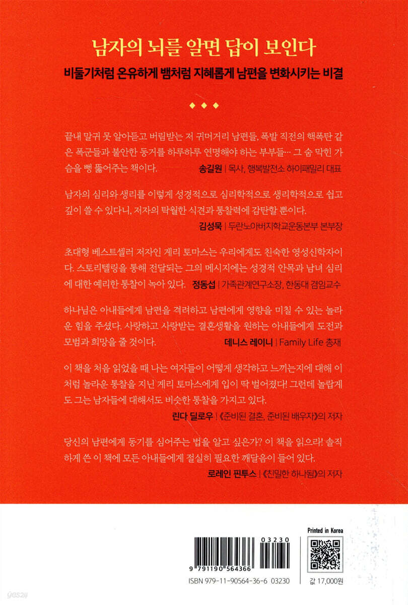 당신의 남편에게 동기를 심어주는 법을 알고 싶은가? 이 책을 읽으라! 솔직하게 쓴 이 책에 모든 아내들에게 절실히 필요한 깨달음이 들어 있다. - 로레인 핀투스 (《친밀한 하나됨》」의 저자)