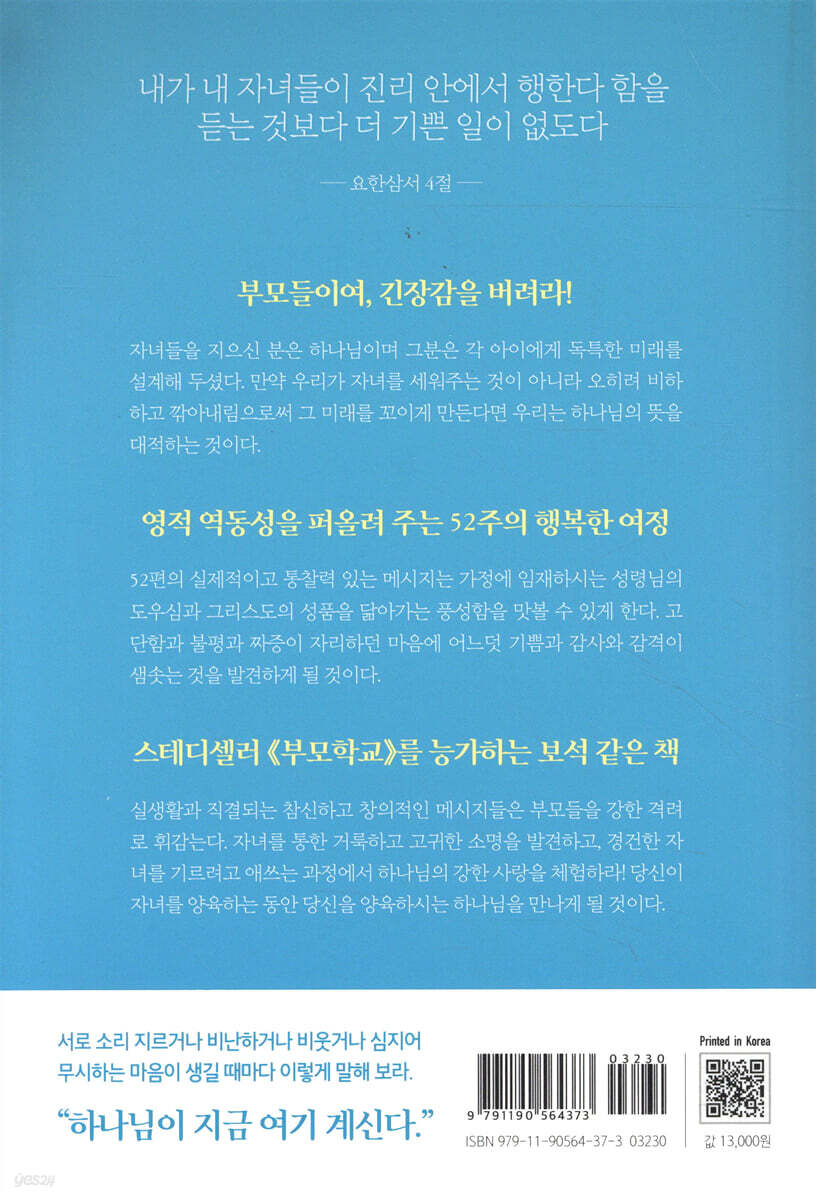 2 하나님이 이 일을 맡기셨음을 기억하라 3 자녀에게 삶의 본을 남기라 4 하나님 얼굴에 웃음을 드리라 5 자녀를 예수께로 데려가라 6 자녀들을 전능자의 그늘에 숨기라 7 희생의 계절을 즐거이 맞이하라 8 가장 중요한 것을 선택하라 9 무자한 여인의 노래를 기억하라 10 두려움에게 안녕을 고하라 11 자녀에게 함부로 대하지 말라 12 가장 소중한 사람에게 시간을 내라 13 자녀들이 자랑스러워하는 부모가 되라 14 자녀를 통해 겸손의 높은 경지를 경험하라 15 영적으로 강건한 부모가 되라 16 자녀에게 하나님의 마음을 품으라 17 까다로운 아이에게 감사하라 18 자녀에게 죄를 미워하는 본을 보이라 19 불평할 상황에서 감사의 조건을 찾으라 20 아이와 함께 자라가라 21 자녀로 인한 행복한 성숙의 길을 누리라 22 자녀에 대한 원시안적 안목을 가지라 23 자녀에게도 신앙의 매너를 보여 주라 24 하나님이 주신 지혜를 전수하라 25 판단을 멈추고 사랑을 시작하라 26 주의 교양과 훈계로 양육하라 27 신중하게 가꿔진 행동원리로 사랑하라 28 자녀를 통해 성품을 개발하라 29 애정을 가지고 진리를 말하라 30 둘이 힘을 합해 자녀를 양육하라 31 집에 잠시 들르는 사람이 되지 말라 32 날마다 십자가에 죽으라 33 자녀가 들춰내는 약점을 직시하라 34 강한 펀치를 받아넘기는 유머를 가지라 35 겸손과 자기 성찰의 모범을 보이라 36 자녀들을 옳은 길로 인도하라 37 뜨거운 영향력으로 기억되는 부모가 되라 38 수고를 몰라 줄 때 하나님 수고를 기억하라 39 지금 여기를 사는 희열을 누려 보라 40 자녀들을 위하여 결혼생활을 살리라 41 적극적인 사랑으로 자녀의 삶을 추적하라 42 예수님을 가리켜 보이는 삶을 살라 43 불멸의 존재를 존귀하게 기르라 44 아이처럼 겸손히 듣고 묻고 구하라 45 책임감 있는 진정한 행복을 추구하라 46 협력자이신 하나님의 음성을 들으라 47 하나님을 바라보고 힘을 얻으라 48 거룩한 환멸을 통과하여 사랑을 회복하라 49 우리의 약점을 통해 하나님께로 인도하라 50 삶 속에서 관용을 가르치라 51 오늘의 일상이 한 조각 천국임을 기억하라 52 예수님의 임재를 마음과 가정에 모시라 주 |