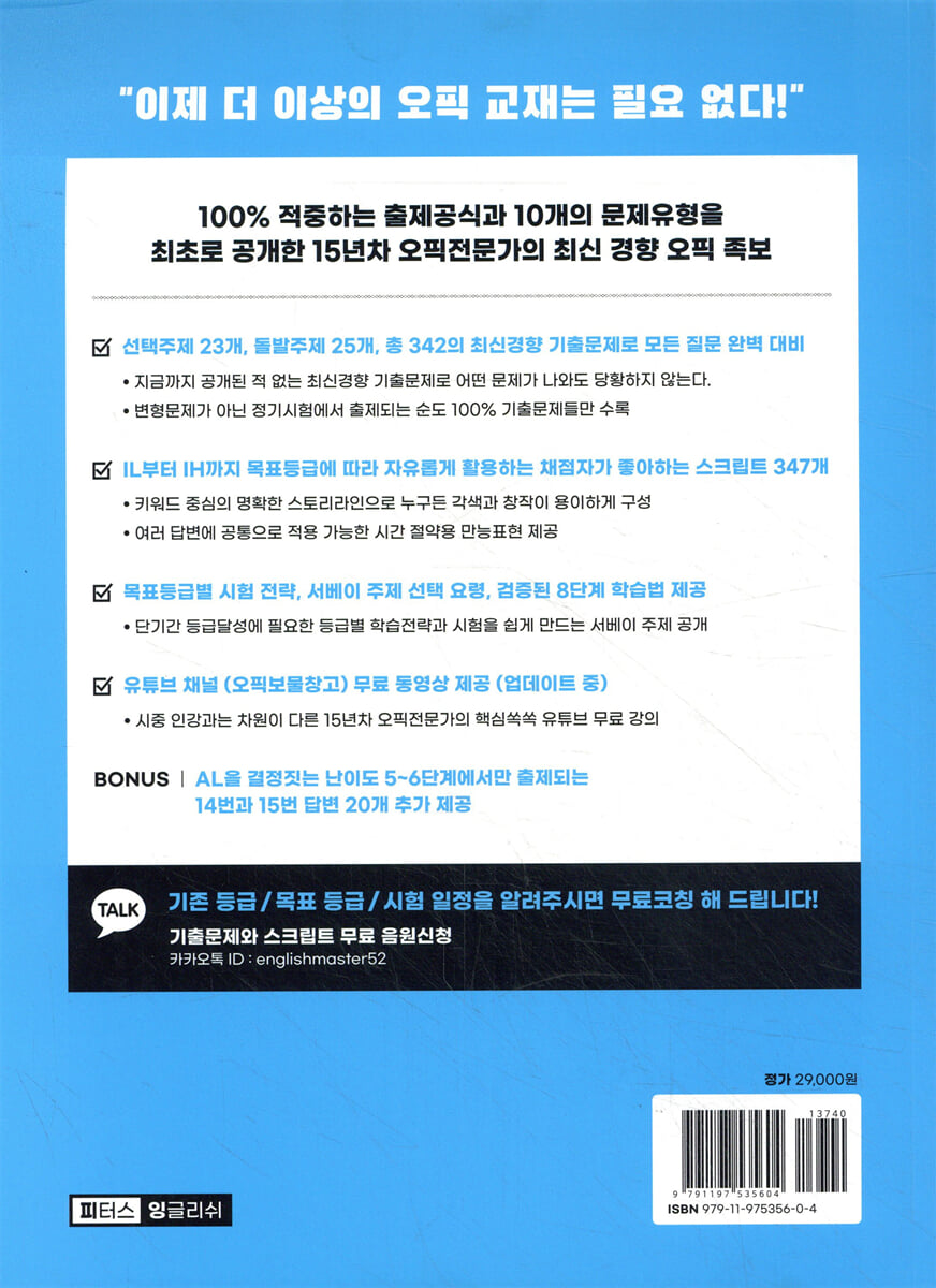 2. 국내 최초로 오픽서베이(Background Survey) 인기 주제에 대한 콤보공식과, 오픽 역사 17년간 아무도 알지 못했던 ‘주제별 문제 세트 수’를 최초로 공개합니다. 3. 실제 시험에 똑같이 출제되는 기출문제에 대한 청취훈련과, 스크립트를 활용한 쉐도잉 훈련을 할 수 있도록 MP3 파일을 무료로 제공합니다. 4. 저자인 윤석환 선생의 카톡으로 연락하면 목표 등급 달성에 필요한 꿀팁을 1:1로 무료 제공합니다. (저자의 카톡 아이디는 교재 페이지에 인쇄되어 있습니다.) |