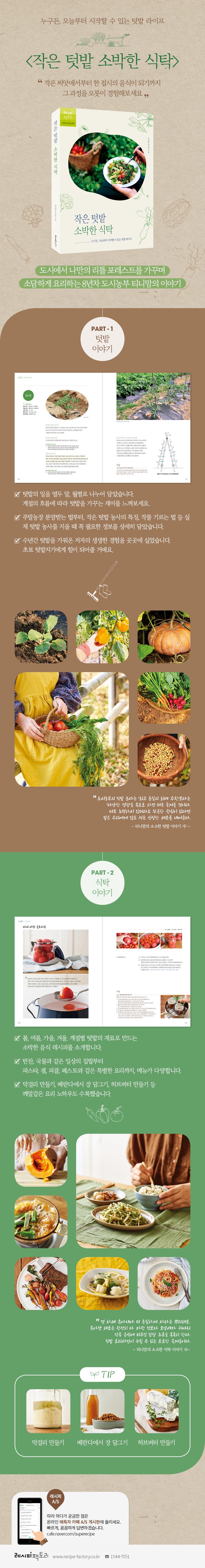 『작은 텃밭 소박한 식탁』 특징텃밭 이야기- 텃밭의 일을 열두 달, 월별로 담았습니다. 계절의 흐름에 따라 텃밭을 가꾸는 재미를 느껴보세요.- 주말농장 분양받는 법부터, 작은 텃밭 농사의 특징, 작물 기르는 법 등 실제 텃밭 농사를 지을 때 꼭 필요한 정보만을 상세히 담았습니다.- 수년간 텃밭을 가꿔온 저자의 생생한 경험을 담았어요. 초보 텃밭지기에게 위로, 공감, 응원이 될 거예요.식탁 이야기- 봄, 여름, 가을, 겨울. 계절별 텃밭의 재료로 만드는 소박한 음식 레시피를 소개합니다.- 반찬, 김치, 국물, 일품요리부터 잼, 피클, 수프, 파스타, 국수 등 다양한 메뉴를 담아 일상에서의 활용도를 높였습니다.- 막걸리 만들기, 베란다에서 장 담그기, 맛국물 만들기 등 요리가 더 즐거워지는 음식 노하우도 담았습니다.