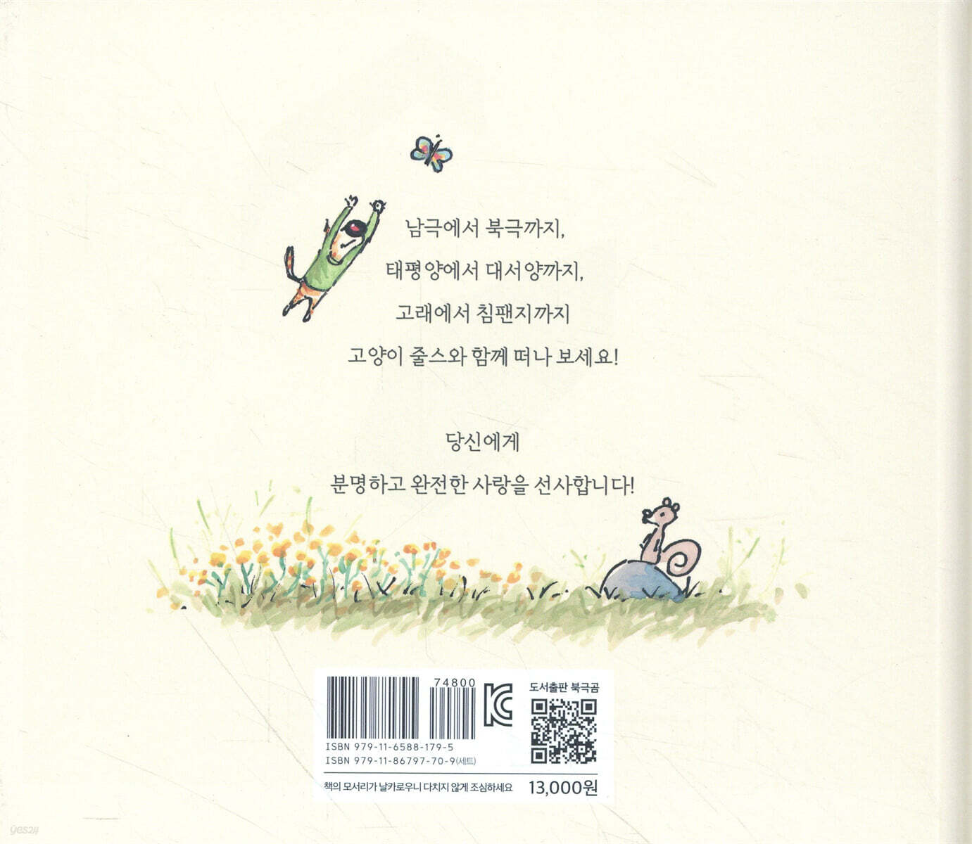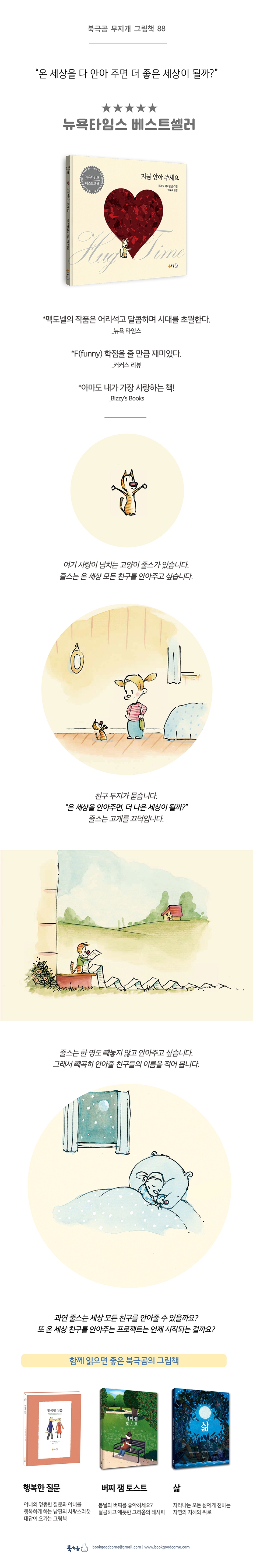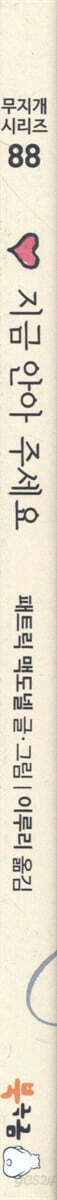 여기 사랑이 넘치는 고양이 줄스가 있습니다. 고양이 줄스는 온 세상 친구들을 모두 안아주고 싶습니다. 줄스는 자신이 온 세상 친구들을 안아주면 더 좋은 세상이 될 거라고 생각합니다. 정말 그럴까요? 우리 모두가 서로를 안아준다면 그것만으로 세상은 더 좋은 세상이 될 수 있을까요? 만약 그 결과가 궁금하다면 줄스를 따라 여행을 떠나 보세요! 『지금 안아주세요』는 사랑이 어떻게 세상을 변화시키는지를 분명히 보여주는 그림책입니다. 세상은 넓고 친구는 많다! 고양이 줄스는 여행을 떠나기 전에 만나서 안아 줘야할 친구들의 이름을 적어봅니다. 이 세상 모든 친구들의 이름을 적는다는 건 어쩌면 불가능한 일인지도 모릅니다. 아무리 길게 이름을 적어도, 그저 줄스가 아는 친구들의 이름이지요. 그래서 아주 기쁘게도 고양이 줄스는 새로운 친구들을 만나게 됩니다. 지구라는 세상은 넓고 함께 사는 동물과 식물은 너무나도 많기 때문입니다. 아주 작은 책으로 너무나도 커다란 세상을 보여주는 그림책, 『지금 안아주세요』입니다. 당장 사랑과 관심이 필요한, 멸종 위기의 동물들 하지만 우리와 고양이 줄스에겐 슬픈 일도 있습니다. 우리와 고양이 줄스가 알고 있던 아주 평범한 동물들조차 보기 어려워졌다는 사실입니다. 예컨대 커다란 고래나 무서운 호랑이 같은 친구들 말입니다. 지금 지구에는 멸종 위기에 처한 동물들이 많습니다. 그리고 동물들이 멸종되면 생태계가 무너지고 우리 인간도 멸종될 것입니다. 『지금 안아주세요』는 당장 누군가 아주 특별한 사랑과 관심과 보호가 필요하다는 사실을 알려주는 그림책입니다. 지금 안아주세요! 고양이 줄스는 바보 같습니다. 자신이 온 세상을 안아주면 더 좋은 세상이 된다고 생각하기 때문입니다. 고양이 줄스는 용감합니다. 온 세상 친구들을 안아주러 떠났기 때문입니다. 고양이 줄스는 위대합니다. 정말로 온 세상 친구들을 안아주었기 때문입니다. 마침내 고양이 줄스는 깨달았습니다. 사랑은 지금 여기 아주 가까이 있는 친구부터 안아주는 것을요. 고양이 줄스는 현재를 사는 우리에게 사랑과 행복의 의미와 방법을 일깨워줍니다. 『지금 안아주세요』는 21세기 지구에 사는 모든 친구에게 최고의 선물입니다. *뉴욕타임즈 베스트셀러 *맥도넬의 작품은 어리석고 달콤하며 시대를 초월한다. _뉴욕 타임스 *F(funny) 학점을 줄 만큼 재미있다. _커커스 리뷰 *맥도넬은 자신의 메시지를 가장 효율적으로 전달할 줄 아는 작가다. _퍼블리셔스 위클리 *아마도 내가 가장 사랑하는 책! _Bizzy's Books ★누리과정 및 교과연계★ 누리과정: 의사소통(책과 이야기 즐기기), 사회관계(더불어 생활하기) 교과연계: 1학년 2학기 국어 9. 겪은 일을 글로 써요 2학년 1학기 국어 11. 상상의 날개를 펴요 2학년 2학기 국어 1. 장면을 떠올려요 |