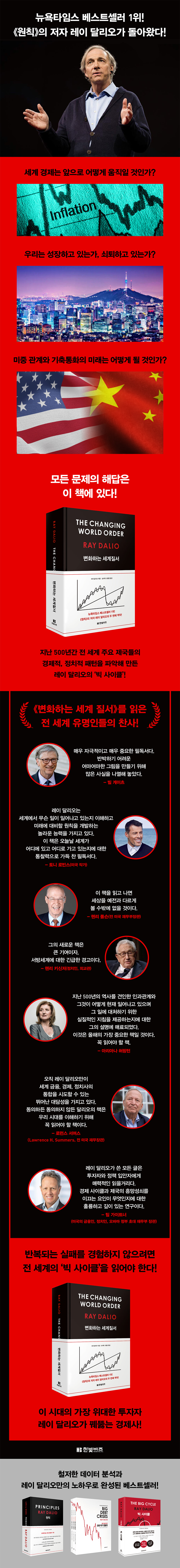 레이 달리오가 말할 때, 나는 경청한다. 그의 새 책은 세계 경제 및 정치 분야에서 국가가 승리하는 가장 큰 이유를 새롭게 조명하고, 그 이유를 오늘날의 중국과 미국에 적용하는 등 그 적용 범위가 놀라울 정도다. 이 책을 읽고 나면 세상을 예전과 다르게 볼 수밖에 없을 것이다. - 헨리 폴슨 주니어 (전 미국 재무부 장관)