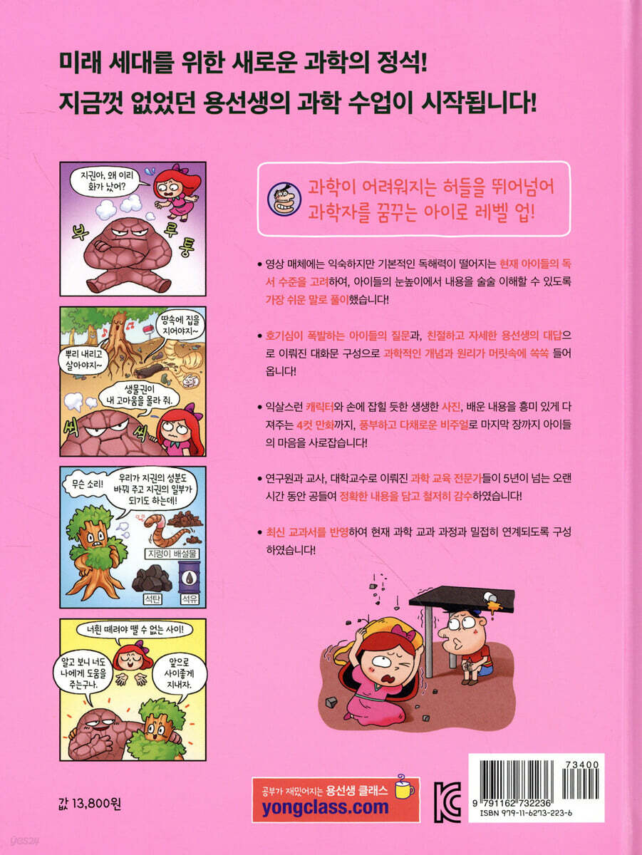 구름보다 높이 솟은 에베레스트산은 어떻게 생겨난 걸까? 지구의 겉 부분은 여러 개의 조각들로 이루어져 있으며, 그 조각들은 판이라고 부릅니다. 판은 서로 다른 방향으로 움직이면서 가까워지거나 멀어지며 수많은 자연 현상을 일으킵니다. 대륙과 해양에 다양한 지형이 생기고, 지진이 발생하고 화산이 분출하는 것도 모두 판이 움직이기 때문이지요. 《용선생의 시끌벅적 과학교실 - 34 땅의 움직임》 편에서는 지구의 겉 부분이 크고 작은 여러 개의 판으로 이루어져 있고, 판이 이동해 땅이 다양하게 변한다는 판 구조론에 대해 알아봅니다. 거대한 판을 움직이는 힘은 어디서 나올까요? 과거에 대륙들은 어떤 모양이었고 미래에는 어떤 모양이 될까요? 지진은 왜 일어나는 걸까요? 화산이 정말 우리에게 피해만 주는 걸까요? 땅은 지구를 이루는 다른 요소들과 어떤 영향을 주고받을까요? 이 책은 땅에서 일어나는 여러 가지 현상들을 과학적인 시각으로 자세히 탐구합니다. 지구의 겉 부분을 이루는 판의 움직임과 그 원인을 알아보고, 대륙 이동과 해저 확장의 증거, 판의 이동으로 일어나는 현상인 지진과 화산에 대해서도 자세히 배웁니다. 또 지구는 땅뿐만 아니라 강과 바다, 동물과 식물, 공기, 태양 등이 서로 영향을 주고받기에 존재할 수 있다는 것도 알게 되지요. 독자 어린이들은 이 책을 통해 땅이 끊임없이 변화하며, 지구의 여러 구성 요소가 상호작용하고 있기에 우리가 존재할 수 있음을 스스로 깨닫고, 지구를 더욱 사랑하는 마음을 갖게 될 것입니다. 재미있게 술술 읽다 보면 어느새 과학 지식이 머리에 쏙쏙! 영상 매체에는 익숙하지만 기본적인 독해력이 떨어지는 현재 아이들의 독서 수준을 고려하여, 아이들의 눈높이에서 가장 쉬운 말로 내용을 전달하였습니다. 캐릭터들의 대화문으로 구성된 친절한 서술 방식으로 줄글을 읽는 것에 익숙하지 않은 아이들도 술술 읽을 수 있습니다. 또한 다양한 시각 자료를 활용해 쉽게 읽히면서도 정확히 이해할 수 있도록 구성을 최적화하였습니다. 실생활 속 호기심을 해결하며 과학적 사고력도 쑥쑥! 단순한 과학 개념뿐 아니라 현상이나 문제를 과학의 시선으로 바라보는 틀을 마련해 줍니다. 실생활 속 소재로부터 과학적 호기심을 끌어내 개념과 원리에 접근하는 이 책은 독자 아이들의 공감대를 이끌어내며 자연스럽게 책에 몰입하게 해 줍니다. 독자들은 과학적 호기심을 해결하며 지식을 쌓을 뿐 아니라 과학적 사고방식과 태도까지 기를 수 있습니다. 눈길을 사로잡는 다채로운 비주얼 구성! 실감나고 생생한 사진과 명쾌한 삽화, 유머러스한 캐릭터 등 다양한 시각 자료를 통해 내용을 직관적으로 전달해 줍니다. 또한 소단원마다 핵심 내용을 정리해 주는 4컷 만화를 통해 학습에 대한 부담을 낮추고 과학이 즐거운 과목이 되도록 구성했습니다. 최신 과학 교과서를 바탕으로 한 초등 과학의 새로운 정석! 가장 최근에 개정된 초등학교와 중학교 교과서의 내용을 충실히 반영했습니다. 주제별로 구성된 각 권은 초등학교 교과는 물론, 중학교에서 배우는 개념까지 초등 수준에 맞춰 풀어냈습니다. 또한 개정 교과서에서 사용하는 과학 용어를 반영하여 교과 연계성을 한층 높였습니다. 믿을 수 있는 과학 교육 전문가들이 심혈을 기울여 개발한 책! 대학에서 오랫동안 과학을 연구하고 교육 현장에서 직접 아이들을 가르쳐 온 과학 교육 전문가들이 기획부터 편집까지 개발 전 과정에 참여하며 공들여 만든 책입니다. 정확한 과학 개념을 초등학생 수준에 맞게 전달하기 위해 초중고 교과서는 물론 다양한 국내외 전문 자료를 연구하며 아이들 눈높이에 맞는 신선한 소재와 설명 방식을 개발했습니다. 또, 교육대학교에서 과학을 가르치는 권위 있는 교수님들의 감수를 거치며 거듭 내용의 정확성을 기하여 시리즈의 신뢰도를 높였습니다. |
