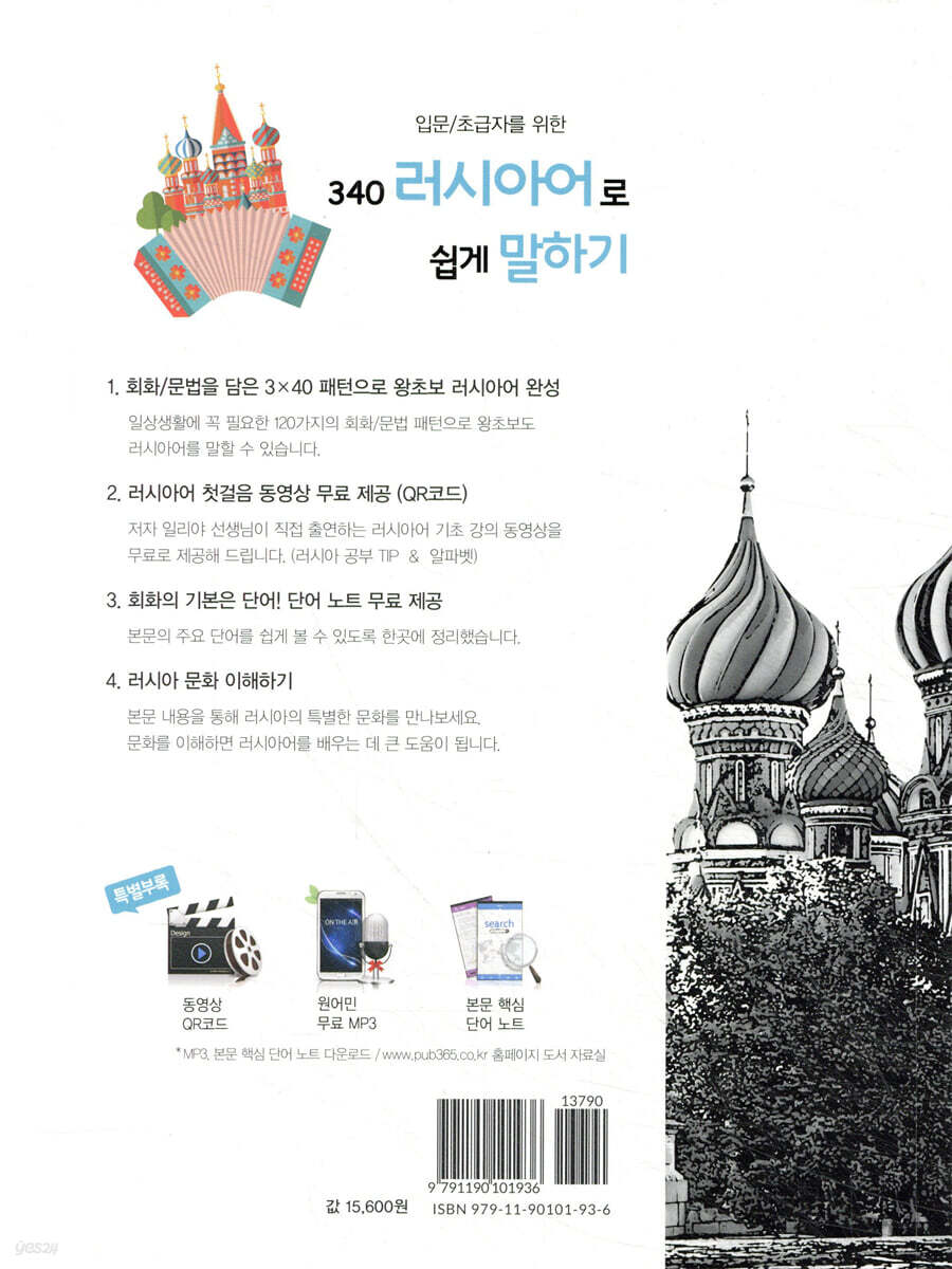 생생한 러시아어 표현을 익히고 왕초보도 술술 말할 수 있어요! 『340 러시아어로 쉽게 말하기』는 기초 외국어 학습서 ‘나도 말하길 원해(나말해)’ 시리즈의 9번째 도서입니다. 러시아어 교육자이자, 인플루언서, 방송인으로도 활동 중인 저자 일리야 선생님의 러시아어 수업을 생생하게 듣는 것처럼, 러시아어 쉽게 말하기 학습서를 통하면 누구나 어렵지 않게 러시아어에 흥미를 느낄 수 있게 되고, 쉽게 따라 말할 수 있게 될 것입니다. 러시아 문화에서 흔히 접할 수 있는 120가지 상황 주제와 주제에 맞는 대화문을 제시하여 러시아어 초보 표현을 풍부하게 배울 수 있도록 내용이 구성되었으며, 이를 통해 초보자도 러시아어의 기초를 거부감 없이 학습할 수 있게 됩니다. 부가 자료로는 일리야 선생님이 직접 강의하는 러시아어 공부 TIP과 알파벳 그리고 본문 중에 특히 중요하게 학습해야 할 여섯 가지 챕터의 영상이 있습니다. 또한 일리야 선생님과 러시아어 원어민이 직접 녹음한 다양한 표현들을 청취할 수 있는 MP3 학습페이지도 함께 제공해드리고 있습니다. 부가 자료들은 본문 내의 QR코드를 통해 만날 수 있습니다. 이제 여러분도 러시아어 쉽게 말하기의 풍부한 구성과 다양한 학습 자료들을 활용하여 러시아어의 튼튼한 기초를 완성해보세요! |