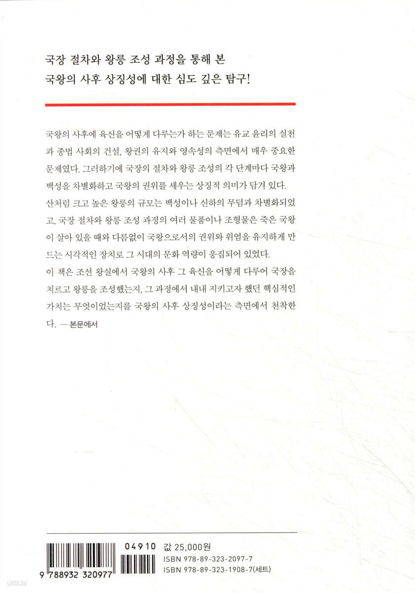 --- p.13 국상(國喪)은 국가의 큰 슬픔이란 의미에서 국휼(國恤)이라고도 불렀다. 국장 중 국왕의 경우는 대상(大喪)으로, 왕비의 경우는 내상(內喪)으로 구분하였다. 왕세자와 세자빈은 예장(禮葬)으로 등급을 낮춰 불렀고, 왕세자는 소상(小喪)으로, 왕세자빈은 소내상(小內喪)으로 구분하였다. 대한제국을 선포한 뒤 황제가 되었지만 나라를 잃은 뒤 치러진 고종 황제와 순종 황제의 장례는 일제에 의해 격하되어 어장(御葬)이라고 불렀다. 이렇게 왕실의 신분에 따라 의식의 명칭이 달라지듯이 격식이나 의물도 차이를 두어 구별하였다. --- p.83 국왕이 즉위하면 곧바로 여러 개의 재궁을 수기(壽器)로서 만들었으며, 이후 재위 기간 내내 해마다 옻칠을 하는 것이 관례였다. 이렇게 생전에 미리 관을 짜두면 장수한다는 믿음을 가지고 있었던 것이다. 이것은 시신에 입힐 수의를 미리 만들어두면 오래 산다는 민간 속설과 마찬가지이다. --- p.137 인산일에 발인할 때 각종 의장물 중 국왕을 상징하는 대표적인 의물은 책보(冊寶)이다. 대행왕의 혼을 모신 신연 앞에는 세자로 책봉될 때, 국왕으로서 존숭을 받을 때, 특히 승하하고 시호를 받을 때 받은 시책(諡冊)과 시보(諡寶)를 함께 실은 채여를 앞세웠다. --- p.187 조선 시대에 임금이 즉위하자마자 하는 가장 중요한 첫 번째 임무는 선왕의 장례를 치르는 일이었다. 국왕으로서 대행왕의 시신이 영원히 묻힐 왕릉을 5개월간 조영해야 한다는 중대한 과제가 있었던 것이다. 검소하면서도 절제하여 국왕의 국장을 치르려는 유교적인 명분은 돌아가신 부모를 살아생전과 다름없이 극진하게 모시려는 인정(人情)이나 왕실의 위엄을 드러내고자 했던 것과 서로 충돌하기 마련이었다. --- p.227 현궁은 승하한 국왕의 시신을 모신 내재궁(內梓宮)과 외재궁(外梓宮)을 영원히 안치하는 지하 궁전이다. 조선 초기에는 현궁을 석실로 조성하여 문종의 현릉까지 이어졌다. 그러나 세조의 유언에 따라 예종은 기존처럼 석실로 현궁을 만들자는 대신들의 반대를 물리치고 세조의 광릉을 회격(灰隔)으로 바꾸도록 한 이후에는 그대로 따랐다. --- p.239 조선 왕릉에 모신 망자가 누구인지 밝히고, 그를 추모하기 위해 세운 상징물이 바로 비석이다. 조선 시대 왕릉 앞에 세운 비석은 신도비(神道碑)와 표석(表石)으로 구분된다. 신도비는 비주(碑主)의 일생과 업적을 기록하여 능에 이르는 입구에 세우는 비석이다. 표석은 왕릉에 모신 피장자가 누구인지 ‘묘호’와 ‘능호’를 간략하게 기록하여 피장자의 명복을 기리고 생전 삶을 기억하는 보조 수단이다. --- p.289 조선은 유교적 질서를 중요하게 여겨, 망자를 모신 능묘의 석물조차 신분적 차서에 따라 형태와 크기를 구분하여 법제화하였다. 왕과 왕비의 왕릉을 비롯하여 세자와 세자빈의 원, 그리고 대군 이하 왕실과 관련된 인물들의 분묘에 설치된 석물의 종별 수량 및 규격 등을 철저하게 규제하였다. --- p.327 조선 후기에 왕릉의 석물을 재활용한 것은 왕릉 조성이 겹쳐 재정적 어려움을 극복하기 위해서였다. 19세기 들어서는 국가적으로 재정적인 어려움이 많아 왕릉의 석물을 재활용한다고 하였지만, 안동 김씨의 세도정치가 있었던 시기여서 왕권이 위축된 결과였음을 웅변으로 증명하는 것이라 할 수 있다. --- p.373 |