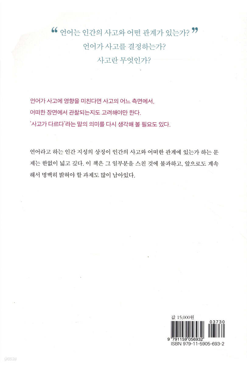 어떠한 장면에서 관찰되는지도 고려해야만 한다. ‘사고가 다르다’라는 말의 의미를 다시 생각해 볼 필요도 있다. 언어라고 하는 인간 지성의 상징이 인간의 사고와 어떠한 관계에 있는가 하는 문제는 한없이 넓고 깊다. 이 책은 그 일부분에 불과하고, 앞으로도 밝혀야 할 과제가 많다. 언어는 인간의 사고와 어떤 관계가 있는가? 우리가 너무도 당연시하는 ‘전, 후, 좌, 우’라는 개념이 아예 존재하지 않는 언어가 있고, 자연에 존재하는 색을 표현하는 말이 아예 없거나 극소수인 언어도 있으며, 애초에 숫자라는 개념이 없는 언어도 존재한다. 그렇다면 그러한 사람들은 위치관계를 어떤 식으로 표현하고, 색을 가리킬 때 어떤 방법을 취하고, 수를 전달함에 있어서 어떤 방식을 취하는 것일까. 또한 언어를 학습하기 이전의 유아나 언어를 가지고 있지 않는 동물들의 사고는 인간 성인의 사고와 어떻게 다르고, 그 차이는 역시 언어에서 오는 것일까. 나아가 각각 구사하는 언어자체는 다르지만 언어를 사용하는 환경이라는 그 자체만으로 보편성을 발견하는 것은 가능한가. 이 책 ‘언어와 사고’ 는 심리학자인 이마이 무쓰미(今井むすみ) 교수의 『ことばと思考』(岩波新書, 2010)를 한국어로 옮긴 것으로, 언어심리학자의 관점에서 언어와 사고에 관하여 다양한 시점과 질문을 제시하고 있다. 저자는 지구상에 존재하는 수많은 언어의 다양성과 이질성 안에서 사고의 보편성을 찾고, 또 그 보편성 안에서 다시 다양성으로 넓혀지는 과정을 여러 실험과 실제 사례들을 들어 소개하고, 이를 통해 가장 주관적이고 추상적일 것 같은 언어가 실은 매우 객관적이고 과학적일 수 있다는 사실을 독자 스스로 깨닫게 해준다. 이 책은 평소 언어에 흥미를 가지고 있던 독자는 물론, 공기처럼 너무나 당연해서 언어나 사고자체에 특별히 관심을 갖지 않았던 독자라도 한 번 쯤은 궁금해 했을 법한 언어와 사고의 상관관계라는 주제에 쉽고 흥미롭게 접근할 수 있도록 안내하는 충실한 길잡이 역할을 해 줄 것이다 |