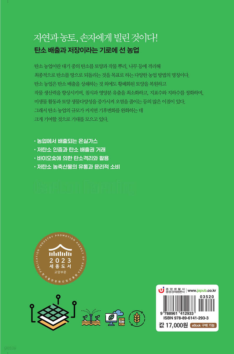 * 자연과 농토, 손자에게 빌린 것이다! 지구온난화로 인해 전 세계적으로 기록적인 폭염과 그에 따른 환경 변화가 연일 화제에 오르내리고 있다. 기후변화 관련 단체에서는 지구온난화가 50℃ 폭염을 발생시켰으며 앞으로도 더 자주 발생할 것이란 연구결과를 발표했다. 이러한 이상 기후변화는 산업화 이후 30배 이상 늘었으며 전 세계가 온실가스 배출량을 적극적으로 줄여나가지 않는다면 폭염을 겪게 될 것을 전망하고 있다. 기후변화에 관한 정부 간 패널(IPCC)에서도 20세기 후반부터는 지구온난화가 인류의 활동으로 인해 발생한다고 말한다. 지금은 인류의 생존까지도 위협할 수 있는, 기후변화를 일으키는 온난화의 주범 이산화탄소를 줄여나가기 위한 관심과 노력이 그 어느 때보다 절실하다. 자연 친화적인 이미지와 달리 전 세계 온실가스의 3분의 1을 배출할 정도로 농업은 온실가스의 주요 배출원이다. 지구온난화의 원인 물질은 온실가스인 만큼 이제는 농업 과정에서 발생하는 대기 중 탄소를 격리하거나 줄여나갈 방안을 모색할 때이다. 탄소 농업을 통해 온실가스 배출을 줄여나가는 동시에 양질의 농축산물 생산을 목표로 삼아야 한다. 다시 말해 기후변화를 완화하기 위해서는 탄소 농업을 빼놓고 이야기할 수 없는 시대가 되었다. 기후변화와 함께 최근 탄소 농업, 기후중립, 탄소 배출권이란 이야기를 심심치 않게 접할 수 있는데 이제는 농업에서도 그만큼 탄소 농업의 중요성이 부각되고 있다는 방증이다. 탄소 농업이란 대기 중의 탄소를 토양과 작물 뿌리, 나무 등에 격리해 최종적으로 탄소를 땅에 오래, 그리고 신속하게 되돌리는 것을 목표로 하는 다양한 농업 방법의 명칭이다. 즉 농축산물의 재배, 관리 과정에서 토양의 파괴를 최소화하는 모든 방법을 탄소 농업이라 말할 수 있다. 저자는 이러한 사회적 문제의 이해와 대응을 위해 탄소 농업의 정의에서부터 높은 생산성과 유통, 판매에 이를 수 있는 온실가스 배출 감축과 지속 가능한 농업, 환경 문제를 폭넓게 다루고 있다. 이 책은 지금의 환경 문제와 변화하고 있는 농업의 탄소중립 관련 여러 정보와 흐름, 대응 방안은 물론 저탄소 상품을 구매하고자 하는 독자들을 위해 만들어졌다. 결국 이 책은 우리의 농업이 더 나은 방향으로 나아갈 수 있도록 이정표를 제시함과 동시에 실천 가능한 방안을 함께 고민할 계기도 마련하고 있다. * 탄소 배출과 저장이라는 갈림길에 선 농업의 미래는? * 지속 가능한 환경 재생형 농업이 답이다! 1장에서는 지구온난화 시대에 지속 가능한 농업이란 무엇인지 이야기하며 탄소 농업의 정의는 물론 온실가스에 대처하는 전 세계적인 흐름과 패러다임을 설명한다. 이로써 탄소 배출과 저장이라는 갈림길에 선 우리 농업이 어떻게 지속 가능한 농업 수준으로 발전할 수 있을지에 대한 방향성도 제시한다. 2장에서는 우리나라 농업에서의 온실가스 배출량 추이 등을 여러 표와 인용을 통해 설명하며 온실가스의 주범인 이산화탄소를 감축하기 위한 실제적인 이야기를 전한다. 이로써 독자들은 우리나라 농업 분야에서의 온실가스 배출 현실을 직시할 수 있게 된다. 3장에서는 최근 연일 뉴스에서 오르내리는 온실가스와 지속 가능한 농업 관련 용어들을 알기 쉽게 정리해 전한다. 탄소 가격제, 탄소상쇄와 탄소 크레딧 등의 용어는 물론 온실가스의 사회적 비용, 생태발자국, 어스 오버슛 데이의 설명을 통해 독자들은 온실가스의 심각성을 다시 한번 깨닫게 된다. 4장에서는 온실가스 배출 감축 방법은 물론 배출된 이산화탄소를 농업이나 축산업 등에서 적극적으로 활용해 수익을 올릴 방법을 제시한다. 농경에서는 토양에 탄소를 오래, 많은 양을 저장할 수 있는 농경법과 지역의 산업 폐열을 이용한 트리제네레이션과 시설원예법, 축산업에서는 아산화질소 억제 가축 사료 개발 등의 이야기들을 사례를 들어 설명해 이해를 돕는다. 5장에서는 국가 간, 또는 각 나라들의 저탄소 인증과 탄소 배출권 거래제를 이야기하며 온실가스 감축을 위한 여러 방안과 전 세계적인 노력을 전한다. 일본의 탄소 농법의 발전과 J-크레딧 제도, 탄소격리 농산물 인증제를 설명하며 국가 주도로 시행하고 있는 탄소 농업을 전한다. 이를 통해 우리의 탄소 농법이 가야 할 방향과 제도 구성, 농민과 소비자들의 인식 전환의 필요성을 강조한다. 6장에서는 탄소격리 활용을 위한 바이오숯이 어떻게 온실가스 배출을 막고 탄소중립을 만들 수 있는지를 이야기한다. 아마존의 문화유산인 바이오숯이 다량으로 포함된 토양은 미생물의 분해가 활발해 비옥해진다. 탄소격리가 가능한 이러한 사례의 연구를 시작으로 바이오숯은 오늘날 농업용 토양에 희망을 전한다. 그뿐만 아니라 일본의 복숭아와 포도, 나주 배나무, 광양 매실나무, 담양 딸기 등은 모두 바이오숯을 이용한 탄소 농법으로 재배된다. 이를 통해 바이오숯을 이용한 농법이 환경 보호와 질 좋은 농산물을 수확할 수 있다는 차별점으로 수출 판로를 확대하고 소비자들의 환영을 받을 수 있음을 이야기한다. 7장에서는 저탄소 농축산물 가공과 저장법을 이야기하며 발전된