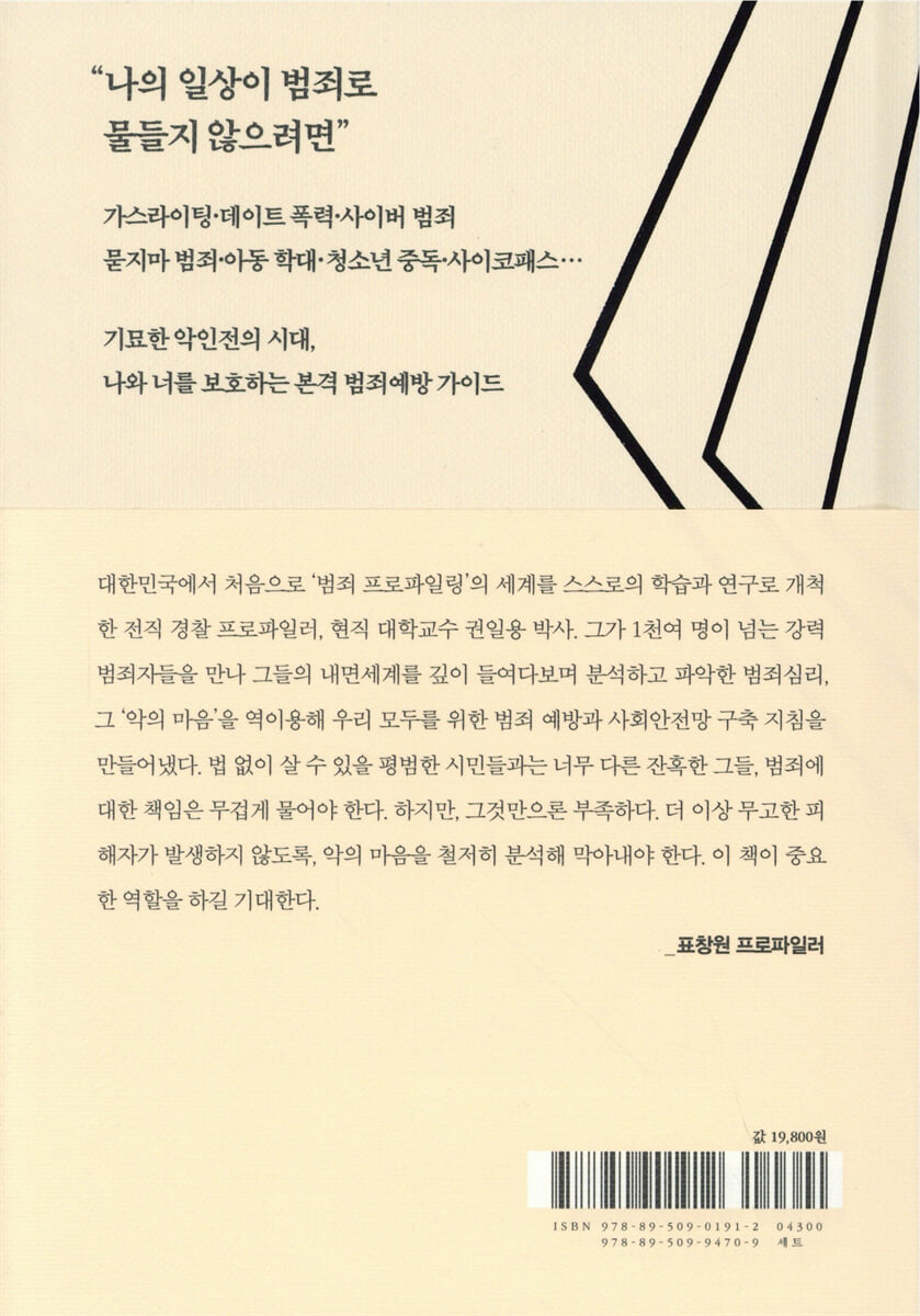 대한민국에서 처음으로 ‘범죄 프로파일링’의 세계를 스스로의 학습과 연구로 개척한 전직 경찰 프로파일러, 현직 교수 권일용 박사. 그가 1,000여 명이 넘는 강력 범죄자들을 만나 그들의 내면세계를 깊이 들여다보며 분석하고 파악한 범죄심리, 악의 마음을 역이용해 우리 모두를 위한 범죄예방과 사회안전망 구축 지침과 대안으로 만들었다. 법 없이 살 수 있을 평범한 시민들과는 너무 다른 잔혹한 그들, 범죄에 대한 책임은 무겁게 물어야 한다. 하지만, 그것만으론 부족하다. 더 이상 무고한 피해자가 발생하지 않도록, 악의 마음을 철저히 분석해 막아내야 한다. 이 책이 중요한 역할을 하길 기대한다. - 표창원 (프로파일러)