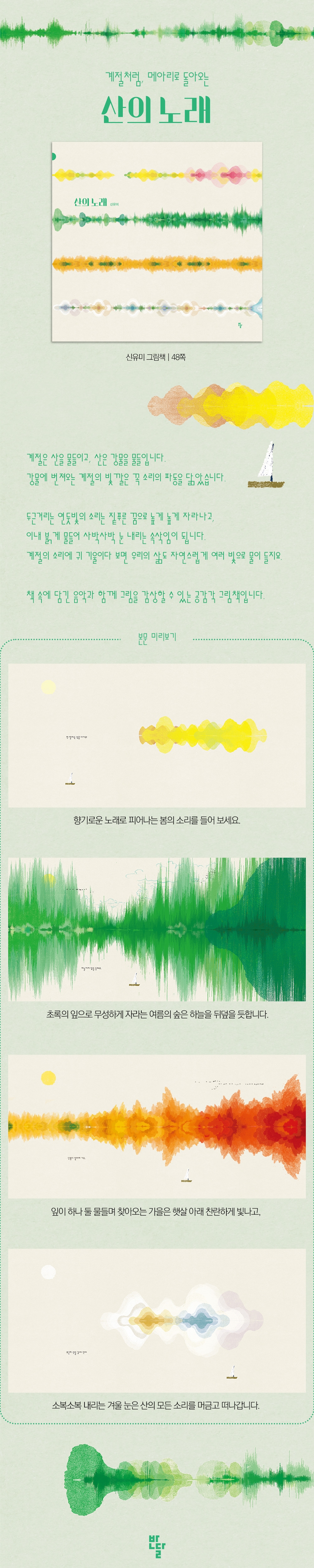 작가는 사계절 산의 모습이 변화하는 걸 보며 시간의 흐름을 느끼고 그런 변화가 인생의 모습처럼 느껴졌다고 해요. 봄, 여름, 가을, 겨울이 각각 시작과 꿈, 사랑과 이별 같다고요. 긴 인생을 두고 보았을 때, 그것들은 꼭 한 번만 찾아오는 것은 아니지요. 우리에게는 다시 시작하는 때가 오기도 하고 새로 꿈꾸는 일을 만나기도 합니다. 사랑과 이별을 반복하기도 하지요. 마치 봄, 여름, 가을, 겨울. 기다리면 반복해서 돌아오는 계절처럼 말이에요. 시각적 이미지인 철새들의 몸짓을 청각인 자연의 노랫소리로 표현한 『너는 소리』 때부터 작가는 그림책과 음악을 연결하는 작업을 계속해 왔습니다. 『산의 노래』 또한 자연의 풍광을 색과 파동, 소리. 노래로 표현해 감각의 조화를 이루는 작업의 연장선에 있습니다. 계절처럼 다시 돌아온다는 말 사계절이 뚜렷하던 우리나라에서 계절이 돌아오는 일은 당연했어요. 하지만 지금은 절기 이름도 무색해졌고 봄, 여름, 가을, 겨울 계절의 경계도 모호해졌지요. 겨울에 눈을 볼 수 없는 지역도 늘어났죠. 봄가을은 언제 지나갔는지도 모를 만큼 짧아졌어요. 어쩌면 봄이 다시 돌아온다는 말은 벌써 유효 기간이 끝나 가는지도 모릅니다. 우리는 무엇을 할 수 있을까요? 또, 우리가 무엇을 멈추어야 계절이 조금이라도 더 자신의 고유한 시간에 머물 수 있을까요? 영영 떠나갈 계절을 붙들고 싶어집니다. 교과 연계 〈누리과정〉 사회관계 - 사회에 관심 가지기 예술경험 - 아름다움 찾아보기 자연탐구 - 자연과 더불어 살기 〈초등교육과정〉 1학년 1학기 봄 02. 도란도란 봄 동산 1학년 1학기 여름 02. 여름 나라 2학년 2학기 가을 02. 가을아 어디 있니 1학년 2학기 겨울 02. 우리의 겨울 |