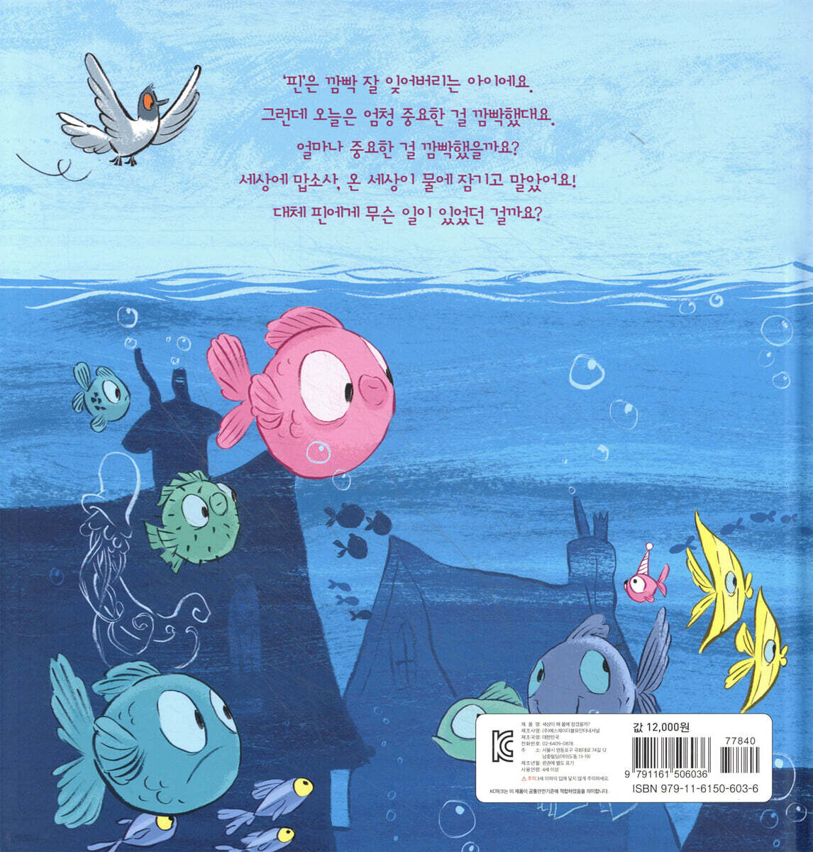 그 아이의 이름은 ‘핀’이에요! 핀은 이불 정리도 깜빡, 머리 빗기도 깜빡, 불 끄는 것도 깜빡했어요. 그런데 어느 날 밤, 핀은 세수하는 걸 기억했어요. 이를 이쪽저쪽 깨끗이 닦고 금붕어 ‘쥘’에게 먹이도 주었어요. 기막히게 잘했답니다. 세면대 구멍의 마개를 뽑고 수도꼭지 잠그는 일을 깜빡 잊기 전까지는 말이지요. 아침이 되자 온 세상이 물에 잠겼어요! “넌 우리의 영웅이야!” 물고기 왕이 말했어요. “이제 우리는 어디든 갈 수 있어! 우리는 무엇이든 할 수 있어!” 물고기들은 순식간에 물 밖 세상으로 헤엄쳐 올라갔어요. “나는 새의 여왕이다!” 여왕이 꽥꽥거리며 말했어요. “네가 온 세상을 물바다로 만들었지, 그렇지?” 새의 여왕이 물었어요. “맞아요!” 핀이 활짝 웃으며 대답했어요. “그게 바로 저예요.” “음,” 새의 여왕이 말했어요… “그럼 이제 어떻게 할 거지?” 온 세상이 물로 가득 찬 날, 하늘도 세상 모든 것들로 가득 찼어요! 새들은 날아갈 곳이 없었어요. 핀은 끔찍했어요. 핀은 숨을 깊이 들이마시고서… 물속으로 풍덩 뛰어들었어요. 핀은 문제를 바로잡아야 한다는 걸 알았어요. 온 힘을 다해 검고 푸른 바닷속을 헤엄쳤지요. 반짝이는 작은 불빛을 따라 동네를 찾았어요. 집으로 가는 길도 찾았지요. 핀은 집에 도착해서 창문으로 쏙 들어갔어요. … 핀은 세면대 구멍을 막고 있던 마개를 뽑았어요. 펑! --- 본문 중에서 |
