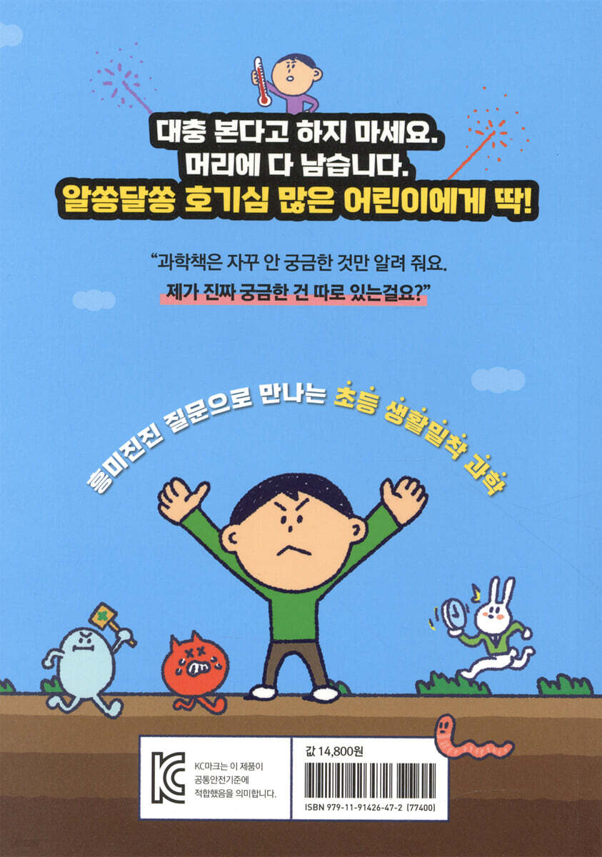 새똥은 왜 흰색이에요? 입안에서 톡톡 튀는 사탕은 어떤 원리예요? 아이들이 좋아하는 입안에서 톡톡 튀는 사탕, 그 속에는 어떤 비밀이 숨어 있을까요? 설탕물에 이산화탄소를 듬뿍 넣고 재빨리 굳혔기 때문에 이렇게 재미있는 사탕을 먹을 수 있는 거예요. 차가운 물을 담은 컵에 물방울이 맺히는 이유는 무엇일까요? 컵 주변의 차가운 온도로 인해 공기 속 수증기가 액체로 변했기 때문이에요. 이처럼 기체와 액체가 뭔지, 물질이 뭔지 어려운 말로 설명하지 않아도 아이들은 이 책을 통해 자연스럽게 그 뜻과 원리를 이해하게 됩니다. 과학은 호기심이 사그라들지 않는 것이 가장 중요합니다. 어린이들이 일상 속에서 한 번쯤 궁금해했던 100가지의 질문으로 물질과 물체, 우리의 몸, 빛과 열 그리고 힘에 대해 알려 줍니다. 과학은 우리 생활 속 곳곳에 숨어 쓸모 있게 쓰이고 있다는 사실을 알게 될 거예요. 이렇게 쉽고 무해한 학습만화는 처음이야! 유쾌한 그림과 친절한 설명부터 꼭 알아야 할 과학 어휘까지 “처음 과학책을 보는 아이가 읽을 만한 책 없을까요?” “과학책은 손도 안 대요” 등 초등 과학 교과목의 시작을 앞둔 엄마의 마음은 불안합니다. 동시에 쉽지만 쓸데없는 말장난이 없는 학습만화책은 없을까 고민하죠. 이 책은 그런 부모님들과 아이들을 위해 만든 책이에요. 이크종 그림 작가의 무해하고 유쾌한 그림과 이동훈 글 작가의 친절한 설명을 따라가다 보면 저절로 과학 원리를 깨치게 됩니다. ‘더 알아보기’ 코너를 통해 미처 해결하지 못한 궁금증을 풀어 주고, 일상 속으로 연결해 과학적 사고를 해 보는 연습을 하게 합니다. ‘아는 만큼 재미있는 과학 어휘’에서도 딱딱한 설명으로 개념을 알려 주지 않아요. 어린이의 머릿속 물음표를 느낌표로 만들어 주는 이 책으로 우리 아이 과학 공부 걱정을 덜어 보세요. |
