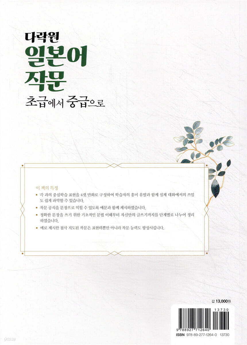 이 책의 구성과 특징 작문시 주의 사항 01 가장 좋아하는 것은 뭐예요?〔비교 표현〕 ~より(も)~の方が/~と同じぐらい/~の中で(のうちで)~一番/~と~とどちら(の方)が/~と~と~の中でどれが一番 02 열쇠는 누가 가지고 있어요?〔진행과 상태 표현〕 ~ている/~てある 03 감기로 입원했었기 때문에요〔이유와 원인 표현〕 ~から/~ので/~て(で)/~ため(に)/~せい 04 예뻐져서 놀랐어요〔변화 표현〕 ~になる/~ようになる/~くなる 05 여배우가 되고 싶어 했어요〔희망 표현〕 ~がほしい/~をほしがる/~が~たい/~を~たがる/~を~てほしい 06 쇼핑하러 가지 않을래요?〔의뢰와 요청 표현〕 ~てください/~てくれませんか/~てくださいませんか/~てもらえませんか/~ていただけませんか 07 이 노트북 써도 됩니까?〔허가 표현〕 ~てもいい/~でもいい/~なくてもいい/~で(は)はくてもいい 08 함부로 보면 안 돼요〔금지 표현〕 ~てはいけない/~ではいけない 09 캐나다로 유학가려고 합니다〔의지와 결정 표현〕 ~つもりだ/~ないつもりだ/~(よ)うと思う/~ことにする 10 함께 가지 않을래요?〔권유, 제안 표현〕 ~(よ)う(か)/~ましょう(か)/~ませんか/~方がいい/~た方がいい 11 일본에 유학한 적이 있을 거예요〔판단 표현〕 ~はず/~かもしれない/~にちがいない 12 슬슬 돌아가야만 해요〔의무 표현〕 ~なければならない/~なければいけない/~なくてはならない/~なくてはいけない 13 크게 싸운 것 같아요〔추측 표현〕 ~だろう(~でしょう)/~ようだ(~みたいだ)/~そうだ/~らしい 14 다음에 사줄래요?〔수수 표현〕 ~あげる/~くれる/~もらう 15 지진이 일어나면 어떻게 해야 되죠?〔조건과 가정 표현〕 ~と/~たら/~ば/~なら 16 결혼했냐고 질문받았어요〔수동 표현〕 ~(ら)れる 17 자동차를 달리게 하겠습니다〔사역과 사역수동 표현〕 ~(さ)せる/~(さ)せられる/~される 18 요시모토 선생님이십니까?〔존경 표현〕 존경 특별 동사/お(ご)~になる/お(ご)~なさる/~(ら)れる 19 주로 유럽으로 갑니다〔겸양 표현〕 겸양 특별 동사/お(ご)~する/お(ご)~いたす -부록- 분야별 단어 정리 혼동하기 쉬운 접속사 비교 활용 문장 원고지 쓰기 편지 쓰기 연하장 쓰기 복중 문안 쓰기 전자 메일 쓰기 이력서 쓰기 자기소개 엽서 쓰기 봉투 쓰기 해답 예(STEP1~STEP4) |