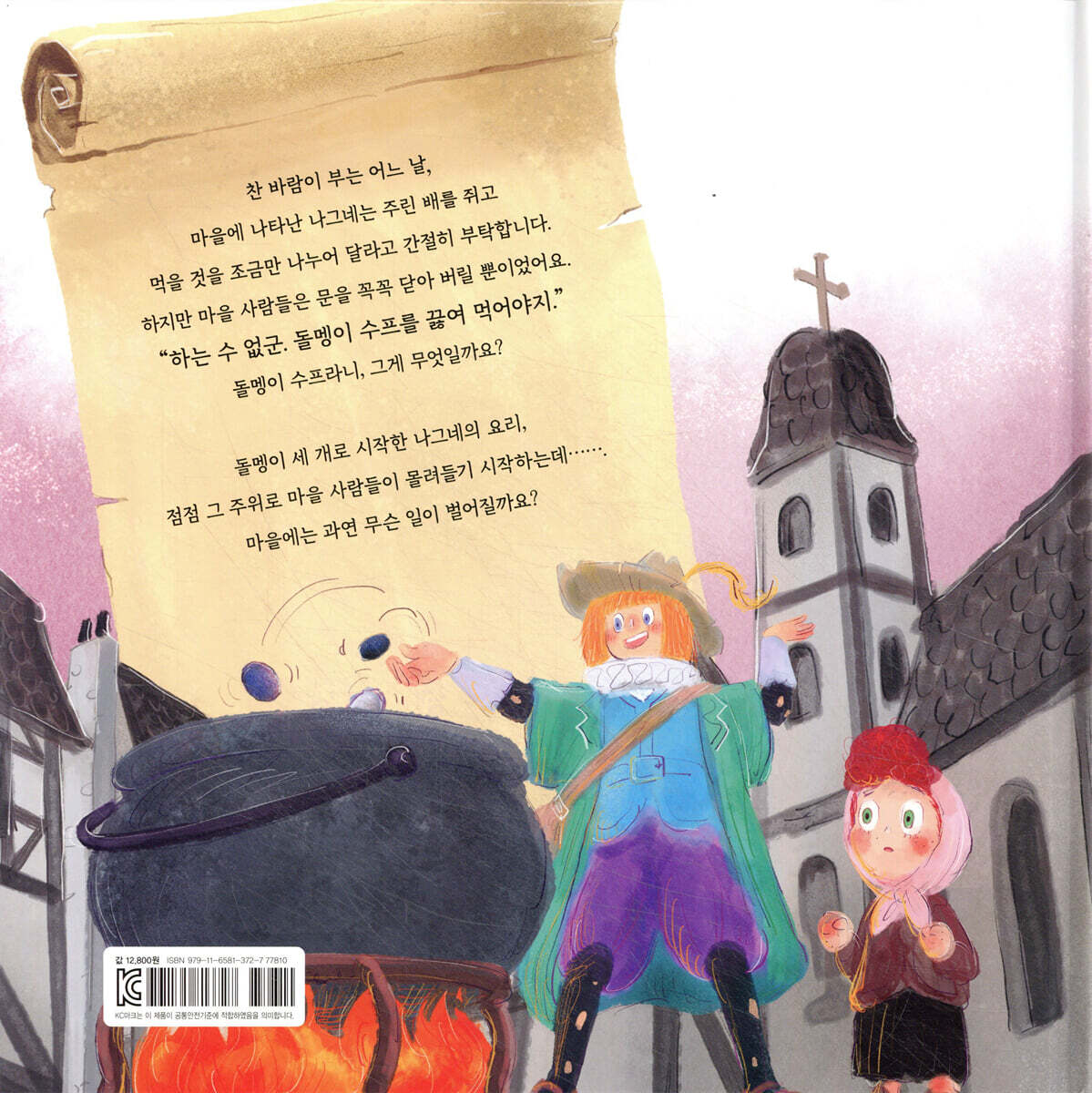 “우리 식구 먹을 것도 넉넉하지 않은데…….” 추운 겨울, 가난한 마을. 마을 사람들은 낯선 이방인의 방문이 별로 달갑지 않습니다. 배고픈 나그네는 먹을 것을 나누어 달라고 부탁하지만 마을 사람들은 냉랭하기만 하지요. 나그네와 눈이라도 마주칠세라 얼른 집으로 들어가 문을 꼭꼭 닫아 버렸어요. 너무한 것 같다고요? ‘곳간에서 인심 난다.’라는 말도 있잖아요. 당장 이번 겨우내 가족들과 먹을 음식도 부족한데 낯선 사람에게 선뜻 음식을 내어 줄 수 있는 사람이 얼마나 있을까요? 나그네를 외면한 마을 사람들을 나쁘다고만 말할 수는 없다는 뜻이에요. 아무튼, 마을 사람들의 냉대에 나그네는 직접 돌멩이 수프를 끓이기로 합니다. “돌멩이로 수프를 끓인다고? 말도 안 돼.” “돌멩이 수프를 먹어 보지 못했구나? 아주 맛있는 수프란다.” 돌멩이 수프의 레시피는 아주 간단합니다. 커다란 솥에 물을 붓고, 반질반질하게 예쁜 돌멩이 세 개를 넣고 팔팔 끓입니다! 국자로 솥 안을 휘휘 젓던 나그네는 나지막하게 말했습니다. “양배추를 넣으면 더 맛있어질 텐데…….” 나그네의 말을 들은 할머니가 양배추를 가져다줍니다. 그러자 근처에서 기웃거리던 사람들이 한마디씩 건넵니다. “우리 집에 감자가 좀 있어요.” “당근은 필요 없나요?” 재료를 보태면 수프를 얻어먹을 수 있겠다는 기대 때문일까요? 아니면 정체불명의 요리에 대한 궁금증 때문일까요? 이유야 어찌 됐든 사람들은 하나둘 자기가 가진 재료를 꺼내기 시작합니다. 사람들의 나누어 준 재료를 넣어 완성되어 가는 돌멩이 수프! 과연 어떤 음식이 만들어질지 정말 기대되지 않나요? “돌멩이 수프는 처음 먹어 봐요. 정말 맛있어요.” “이렇게 푸짐한 마을 잔치는 정말 오랜만이군.” 바람만 휑하니 불던 텅 빈 마을 광장은 어느새 마을 사람들로 가득 찼고, 저마다 조금씩 가져온 음식들과 사람들의 웃음소리로 복작거렸어요. 돌멩이 수프를 끓이는 데 가장 중요한 재료는 다름 아닌 나누는 마음이랍니다. 마을 사람들은 이제 긴 겨울이 와도 두렵지 않아요. 자신이 가진 것을 조금씩 나누면 모두가 행복해질 수 있다는 사실을 깨달았거든요. 이제 돌멩이 없이도 아주 맛있는 돌멩이 수프를 끓일 수 있게 된 거예요. 귀여운 그림과 따뜻한 이야기로 채워진 『돌멩이 수프』를 통해 베풂의 아름다움과 함께 살아가는 삶의 즐거움을 배워보아요! |