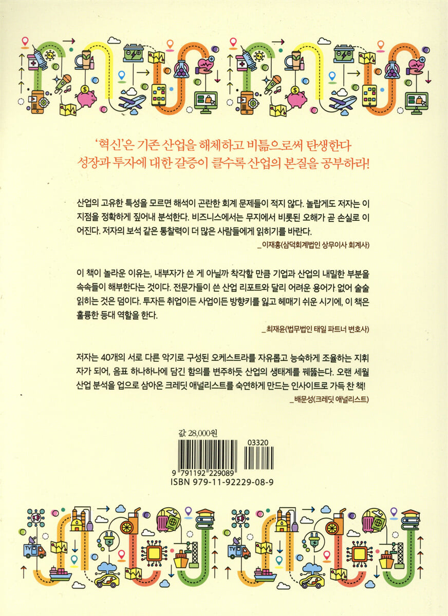 저자는 40개의 서로 다른 악기로 구성된 오케스트라를 자유롭고 능숙하게 조율하는 지휘자가 되어, 음표 하나하나에 담긴 함의를 변주하듯 산업의 생태계를 꿰뚫는다. 오랜 세월 산업 분석을 업으로 삼아온 크레딧 애널리스트를 숙연하게 만드는 인사이트로 가득 찬 책! - 배문성 (크레딧 애널리스트)