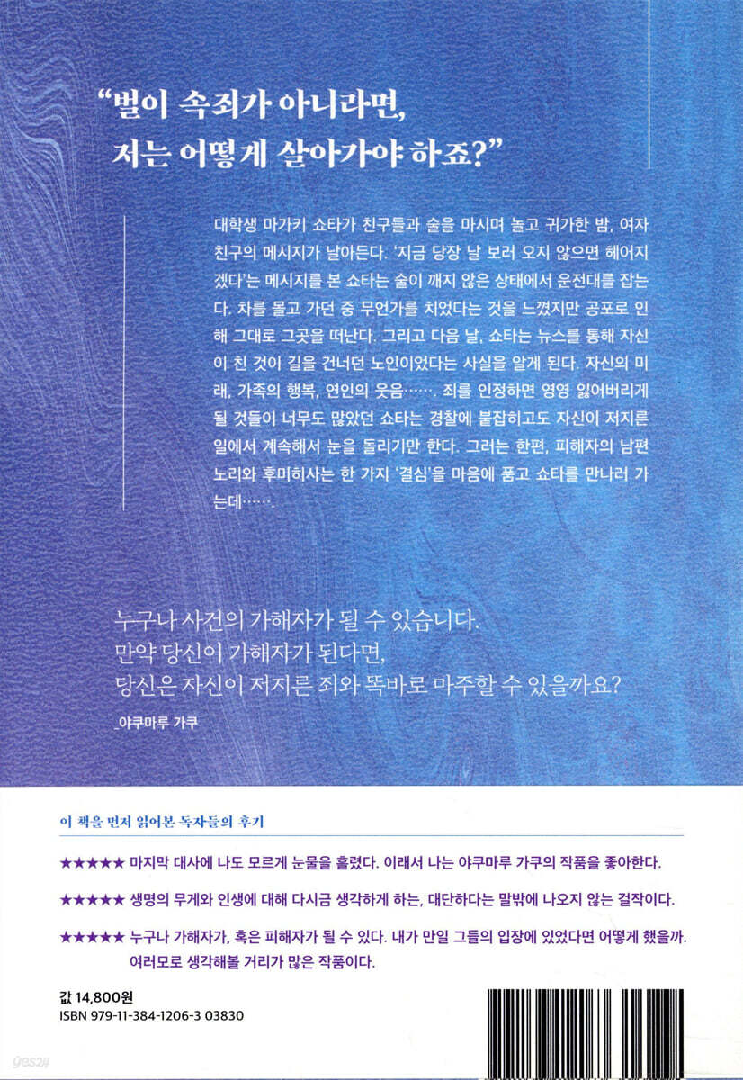 --- pp.13-14 차 안에 나나의 울음소리가 울렸다. 처음에는 신경 쓰지 않았지만, 평상시와 다른 소리로 울고 있었다. 왜 그럴까 싶어 조수석을 쳐다보며 이동 장에 왼손을 뻗은 순간, 엄청난 충격이 일어 앞 유리를 봤다. 칠흑 같은 어둠 속에서 세찬 빗방울이 부딪히는 가운데, 뭔가에 올라탄 듯한 감촉이 핸들을 쥔 손에 전해지고 빗소리를 지우는 듯한 ‘끄아악’ 하는 기괴한 소리가 귀에 울렸다. 순간 브레이크에 발을 옮기려 했지만, 백미러에 비친 붉은 빛이 눈에 들어와 그대로 액셀을 밟았다. 온몸의 털이 곤두서는 절규가 몇 초 만에 들리지 않게 되고, 그 대신 심장이 쿵쾅대는 소리가 들렸다. 차내 온도가 단숨에 10도쯤 내려간 듯한 냉기를 등으로 느끼며 다음 적색 신호등이 나타날 때까지 계속 액셀을 밟았다. --- p.15 개찰구를 지나 역을 나오자 눈앞에 파출소가 보여 쇼타는 저도 모르게 그 자리에 멈춰 섰다. 이대로 자수해야 하는 것이 아닐까. 나는 사람을 죽이고 말았다. 그것이 변하지 않는 현실이라는 것을 알게 된 이상, 이대로 양심의 가책을 견딜 수 있을 리가 없다. 아니. 술을 마신 상태로 운전해서 사람을 치어 죽이고 달아났다. 붙잡히면 상당한 중죄로 다스려질 것이다. 수년간 교도소에 갇히고, 사회에 나온 뒤에도 사람들에게 범죄자라는 뒷손가락질을 받고 평생을 살아야 할 것이다. 내 인생은 끝난 것이나 마찬가지다. 그뿐만이 아니다. 부모님과 누나도 범죄자의 가족으로서 떳떳지 못한 삶을 강요받게 된다. 항상 TV에서 엄격한 발언을 하는 아버지는 세상 사람들로부터 지탄받을 것이다. 그리고 결혼을 앞둔 누나는 파혼을 당할지도 모른다. 그렇다 해도. 파출소로 빨려 들어갈 것 같은 마음을 어떻게든 거부하려 애썼다. 그리고…… 아야카는 어떻게 생각할까. 만약 자신이 보낸 문자 때문에 남자 친구가 운전을 하다 사고를 냈다는 것을 알면 그녀도 자책감에 사로잡힐지도 모른다. 그렇다. 이 일은 나 혼자만의 문제가 아니다. 붙잡혀서는 안 된다. --- pp.37-38 “아버지, 알아보시겠어요? 마사키예요.” 그 말을 듣고서야 눈앞에 있는 사람이 아들임을 깨달았다. 그 옆에 있는 사람은 필시 딸인 구미일 것이다. 고개를 천천히 돌리자 침대 곁에 처음 보는 기구가 놓여 있었다. “여기는……?” 그렇게 묻자 마사키가 얼굴을 가까이 가져왔다. “병원이에요. 인플루엔자에 걸려서 이틀 전에 입원하셨어요.” “그렇구나……. 네 어머니는?” 두 사람이 서로 얼굴을 마주했다. 아무런 대답도 없었다. “기미코는 어디 있느냐?” 불안한 마음에 다시 묻자 두 사람이 이으로 시선을 되돌렸다. “아버지……” 하고 구미가 손을 잡아주었다. “상황이 이런데 말씀드려야 할지 많이 고민했는데요…….” 마사키가 이을 바라보며 머뭇거렸다. “대체 무슨 일이냐?” “어머니가 돌아가셨습니다.” 그 말뜻을 이해하지 못해 마사키의 눈을 빤히 바라보았다. “사흘 전 밤중에 차에 치이셔서……. 아버지가 퇴원하실 때까지 장례를 치르지 않고 기다리고 싶지만 시신이 워낙 심하게 손상되어서…… 장례를 최대한 빨리 치르는 게 좋겠다고 하더군요…….” 차에 치여서…… 시신이 심하게 손상되어서……. 도대체 무슨 소리를 하는 걸까. “장례는 저희가 잘 치를 테니 아버지는 여기서 어머니 명복을 빌어주세요.” “어, 어째서…… 기미코가 밤중에…….” 쥐어짜듯 말하자 이을 보고 있던 마사키가 시선을 피했다. “아버지가 고열을 앓으셔서 편의점에 얼음을 사러 갔다가 돌아오시는 길에…….” 그 말에 심장이 격하게 요동쳤다. 내 탓이라는 걸까. “범인은 아직 잡히지 않았지만 경찰이 반드시 잡아줄 겁니다. 그러니…….” 마사키가 그렇게 말하며 손으로 눈물을 닦았다. 내 손을 잡은 구미의 손도 떨리고 있다. 두 사람에게서 시선을 거두어 천장을 쳐다보았다. 후미코뿐만 아니라 기미코까지 빼앗아갔다는 건가. 게다가 이제는 얼굴을 볼 수조차 없다니. 너무 가혹하다……. --- pp.40-42 “마가키가 경찰에 체포되었대.” 그 말뜻을 바로 알아듣지는 못했다. 경찰? 체포? “뺑소니 사건을 일으켜서 체포되었어. 어젯밤부터 뉴스에 나오던데.” 저도 모르게 웃음이 나왔다. “사야마 씨도 그런 농담을 하네요.” “농담 아니야!” 사야마가 소리치더니 책상 위에 있던 휴대전화를 집어 들었다. 조작해서 이으로 내밀었다. 수상쩍어하며 사야마에게 다가가 휴대전화를 받아 화면을 보았다. 포털 사이트에 ‘음주 운전 뺑소니 혐의, 게이호쿠대생 체포, 사이타마’라는 제목의 기사가 떠 있었다. 화면을 스크롤했다. 심장 박동이 빨라지고 호흡이 거칠어졌다. (…) “그날 밤에 구보도 껴서 마가키랑 술을 마셨는데, 녀석은 꽤 취한 상태였어……. 도대체 운전은 왜 한 거야. 바보 같은 녀석…….” 그 말에 아야카는 휴대전화 화면에서 사야마를 향해 시선을 옮겼다. 사야마가 씁쓸한 표정으로 이을 바라보았다. 21일 오전 1시경, 아게오시 스가야 도로를 주행……. 그 문자를 보낸 직후였다. --- pp.62-63 “재판에서는 사람인 줄 몰랐다고 하던데, 사실이라고 생각하느냐?” 그렇게 묻자, 마사키가 눈을 뜨고 이으로 