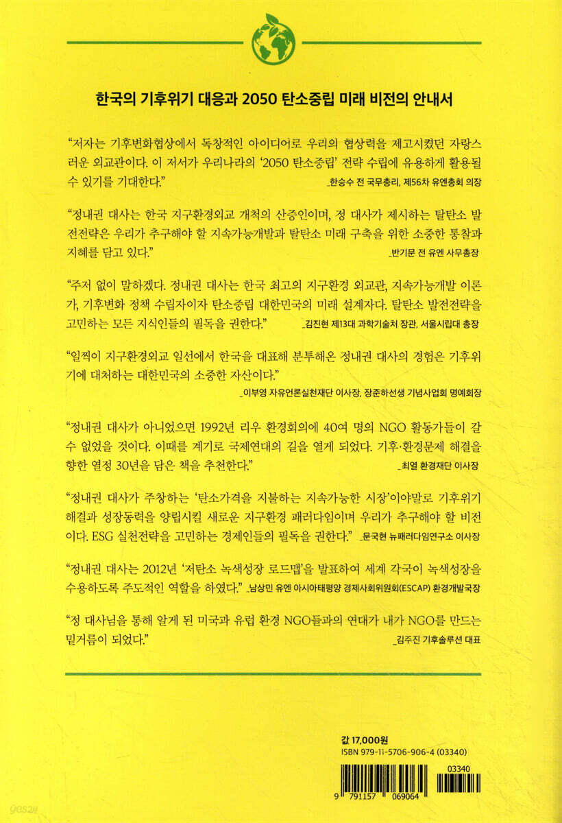 머리말 나의 기후담판 분투기: 격동의 지구환경외교 1부 선진국과 개도국 사이, 대한민국의 자리 만들기 1. 지구를 위한 환경기술의 이전을 꿈꾸다: 특허의 강제실시 조항 관철 담판 1 1992년 6월, 브라질 리우 지구정상회의 본회의장 2. 지구 미래를 위한 어젠다, 공공소유기술 이전: IPCC의 노벨평화상 수상과 개인 사본 수령 담판 2 1992년 3월, 뉴욕 유엔 본부 제4차 리우 지구정상회의 준비회의장 3. 한국의 선진국 의무 부담을 둘러싼 공방: 일본의 ‘진주만 공습’과 싱가포르의 분노 담판 3 2008년 8월 26일, 가나 아크라 기후변화 협상 회의장 [외교 막전막후 1] ‘명단’이냐 ‘행동’이냐?: 선진국 명단 ‘부속서 1Annex1’ 가입 문제 4. 선진국 의무 수락 문제와 감축행동 국제등록부: 우리 방식의 온실가스 감축 제안 담판 4 2009년 4월 27일, 미국 워싱턴DC 국무성 대회의실 주요 경제국 기후변화포럼 개회식 5. 기후목장의 결투, 웅변보다 힘든 침묵: 한국의 감축 의무 수락을 요구한 미국의 압박을 버텨내다 담판 5 2008년 6월 21~22일, 서울 신라호텔 회의실 주요 경제국 회의 6. 최빈국 소말리아에 패널티를?: 개도국 온실가스 감축 목표치의 법적 구속력과 회의장의 야유 담판 6 1999년 10월, 독일 본 제5차 기후변화총회 [외교 막전막후 2] 협상 그룹 결성의 정치학: 우리만의 기후변화 협상그룹 ‘EIG’ 2부 우리가 제안한 미래 7. 개도국도 온실가스 감축에 주도적으로 나서게 하자: ‘개도국 주도 탄소 배출권 사업’ 대격돌 담판 7 2000년 12월, 헤이그 제6차 기후변화총회 회의장 8. 지역 협력의 필요성을 설득하다: 정부 간의 공식 협력, 동북아환경협의체 설립 담판 8 1993년 2월 7일, 서울 소공동 롯데호텔 동북아환경협의체 사전 준비회의 9. 한국의 소프트파워 ‘녹색성장’의 탄생: 지구환경보호와 경제성장의 새로운 기회 담판 9 2005년 3월, 서울 롯데호텔 제5차 아시아태평양 환경·개발 각료회의 10. 전통문화와 생활양식에서 찾은 대안: 현대의 과소비 라이프스타일에 대한 해법 담판 10 1992년 10월, 파리 OECD 환경정책위원회 회의장 [외교 막전막후 3] 누가 더 낭비를 하는가: 서로를 악당시하는 선진국과 개도국 3부 기후변화체제의 결정적 장면들 11. 미완에 그친 코펜하겐 합의: 구속력 있는 기후체제의 무산 장면 1 2009년 12월, 코펜하겐 기후변화총회 회의장 12. 기후위기를 막아낼 최후의 보루 파리기후협정: 더욱 절실해진 각국의 정치적 의지 장면 2 2015년 12월, 파리기후협상 회의장 [외교 막전막후 4] 총성 없는 전쟁터, 유엔 본부 회의장: ‘동해’ 명칭이 없는, 한일 간 ‘동해 결전’ 4부 새로운 지구 환경 패러다임: 탈탄소를 넘어 지속가능 경제-사회-환경 선순환 발전 모델을 향하여 13. ‘자유 시장’에서 ’지속가능 시장’으로: 녹색성장과 포용성장의 경제학 14. 기후변화의 경제학이 아닌 ‘기후경제학’: 경제학의 공포 마케팅에서 벗어나기 15. 탄소 비용을 시장가격에 반영하기: 탄소세 생태세제개혁과 탄소잠재가격 [지구환경 탐구생활] 지속가능개발목표: 경제개발과 환경보호, 사회발전의 균형 16. 탈탄소 미래 인프라 구축: 녹색교통, 쓰레기 에너지 회수, 슈퍼그리드 17. 대한민국의 미래: 탈탄소를 넘어 지속가능 선순환 발전 모델 선도를 후기 지구환경외교 30년에 붙이는 소회와 감사의 말 |