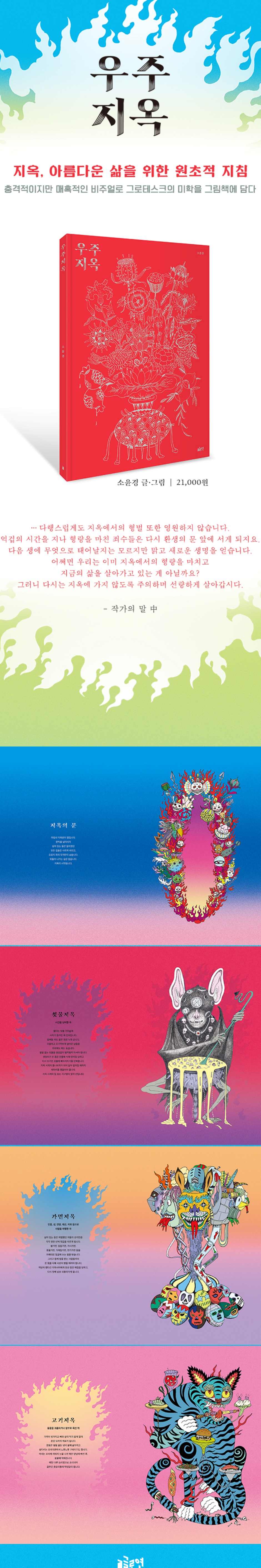 동서고금을 막론하고 화가들은 기상천외하고 살벌한 지옥 풍경을 그려왔습니다. 끔찍한 형벌들을 보여주며 현재의 삶을 성찰하고 교화하는 것이 지옥의 역할이기도 했지요. 무엇보다 화가에게 지옥은 재현의 틀을 벗어나 상상의 나래를 맘껏 펼칠 수 있는 흥미진진하고 매력적인 판타지세계가 아닐 수 없습니다. 지옥에 온 인간들은 포박된 채 무시무시한 괴물들에게 사지가 뜯기거나, 펄펄 끓는 기름에 빠뜨려지기도 하며, 끝도 없이 오물을 먹어야 합니다. 그런데 이런 노골적인 묘사가 오히려 유머러스하게 느껴지곤 해요. 마치 온갖 형벌이 가득한 테마파크처럼. 지옥을 상상하며 지옥에 가게 되는 원인을 크게 세 가지로 분류했습니다. 첫째는 자신을 돌보지 않은 죄예요. 시간을 낭비한 자(쇳물지옥), 게으른 자(사막지옥), 몸을 청결히 하지 않은 자(파리지옥) 등입니다. 삶의 기본은 자신으로부터 시작된다고 여기기에, 몸과 마음을 잘 다스리는 일상생활의 중요함을 보여주고자 했습니다. 두 번째는 나쁜 마음으로 인간관계를 망친 죄입니다. ‘악플지옥’, ‘울음지옥’, ‘구슬지옥’ 등 서로를 헐뜯고 질투하고 싸움을 일으키는 자들이 만들어가는 불화의 지옥입니다. 누구나 살아가면서 흔하게 겪게 되는 현생의 고통이기도 하지요. 세 번째는 주변 환경을 오염시킨 죄입니다. 음식을 낭비하고(구토지옥), 동물들을 학대하고(고기지옥), 물을 오염시킨 자(기름바다지옥)들의 지옥이지요. 그러나 다행스럽게도 지옥에서의 형벌 또한 영원하지 않습니다. 억겁의 시간을 지나 형량을 마친 죄수들은 다시 환생의 문 앞에 서게 되지요. 다음 생에 무엇으로 태어날지는 모르지만 맑고 새로운 생명을 얻습니다. 어쩌면 우리는 이미 지옥에서의 형량을 마치고 지금의 삶을 살아가고 있는 게 아닐까요? 그러니 다시는 지옥에 가지 않도록 주의하며 선량하게 살아갑시다. 충격적이지만 매혹적인 비주얼로 그로테스크의 미학을 그림책에 담다 인류가 선과 악을 구분하게 된 이후 ‘지옥’은 감정적 DNA에 대를 이어오며 차곡차곡 쌓여 원초적인 두려움을 불러일으키게 된 ‘낱말’이 아닐까요? 작가는 우주 그 어디인가에 있다고 상정한 지옥별을 구체적이고 세밀하게 상상하여 글과 그림에 담았습니다. 거침없는 과장과 묘사로 표현된 글 원고의 지옥과 형벌은 무시무시한 지옥을 투영시키고 있어 고전문학에서 만나온 지옥을 21세기 버전으로 다시 맛보는 듯합니다. 시각적으로 표현된 지옥의 모습은 그로테스크하여, 공포스럽고 충격적인 비주얼이지만 해학적이며 매혹적인 양가성으로 시선을 사로잡습니다. 지옥의 풍경을 꼼꼼히 바라보면 벌을 받으며 발버둥치는 이들이 외치는 형형색색의 비명이 들리는 듯해 오싹해지지만 그림이 뿜어내는 아름다움에 매료되어 쉽게 시선을 놓기가 어려운 이유일 것입니다. 탐욕과 이기심에 찌든 현대인들을 향한 응징이자 계도 소윤경 작가는 그동안 펴낸 『레스토랑 Sal』, 『콤비』, 『호텔 파라다이스』 등을 통해 인간의 위선과 이기적인 문명에 대해 지속적으로 경고했다면, 이번 『우주지옥』에서는 현대인들이 저지르는 잘못을 세분하여 지옥이라는 장치 안에서 형벌을 내립니다. 그 형벌은 아주 구체적으로 묘사되어 있는데, 인터넷에서 타인을 비방하고 모독한 자들이 가는 ‘악플지옥’을 예로 들면 죄인들은 서로의 과녁이 되어 화살과 표창을 상대방 심장에 꽂으면 점수가 올라가고, 점수가 높은 자는 구멍 난 심장이 메워진 후 다음 과녁으로 이동하는데, 무려 구억 이천만 개의 과녁을 통과해야만 형벌이 끝납니다. 그런데 이런 세밀하고도 과장된 표현으로 굽이굽이 이어지는 형벌의 전개는 매혹적인 지옥 그림과 함께 한편으로는 해학적이기도 합니다. 생전에 온갖 악행을 저질렀던 자들이 비현실적인 세계 속에서 지독한 형별을 마주하게 하는 상황이 인간에 대한 작가의 연민과 기대를 역설적으로 담은 극단적인 유머의 장치로 보이기 때문입니다. 마치 지옥을 담은 단테의 『신곡』, 그 원 제목이 『단테 알리기에리의 코미디』인 것처럼요. 우리의 삶에서 지옥을 바라보게 하는 진정한 의미는 현생에서의 반성과 계도일 것입니다. 작가가 건네는 오싹하면서도 화려하고 버라이어티한 지옥은 독자로 하여금 욕심과 이기심을 버리고 자신에 대한 성찰, 지구에서 더불어 사는 타자와 타인에 대한 배려와 사랑으로 우리의 오늘을 마주하게 이끌 것이라 기대됩니다. |