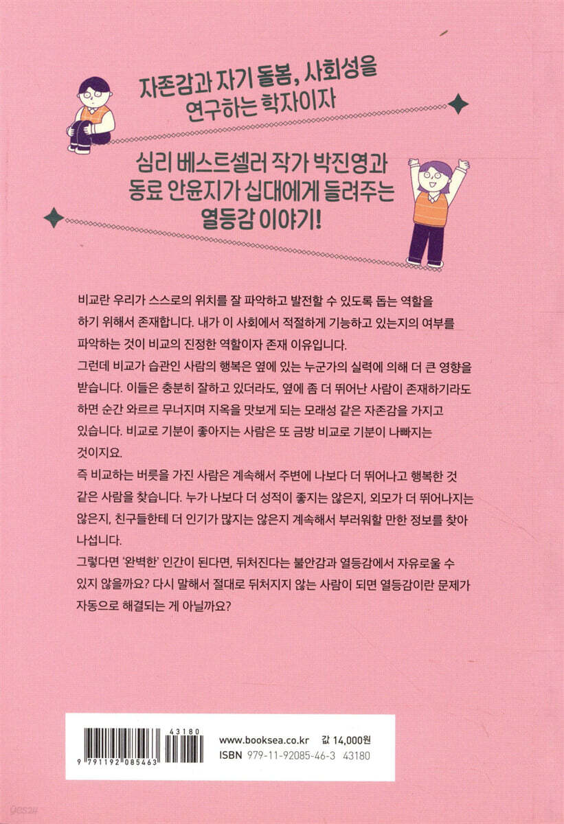 -나에게 동기를 부여하는 비교라도 이미 그 기능을 누렸다면 멈추어야 해! 비교란 우리가 자신의 위치를 파악하고 스스로 발전할 수 있도록 돕는 데 필요합니다. 내가 이 사회에서 적절하게 기능하고 있는지 어떤지 살피는 것이 비교의 진정한 역할이자 존재 이유입니다. 그런데 비교가 습관인 사람의 행복은 옆에 있는 누군가의 실력에 더 큰 영향을 받습니다. 이들은 충분히 잘하고 있더라도, 자신 옆에 조금이라도 더 뛰어난 사람이 존재하면 순간 와르르 무너지며 지옥을 맛보게 되는 모래성 같은 자존감을 가지고 있습니다. 비교로 기분이 좋아지는 사람은 또 금방 비교로 기분이 나빠지는 것이지요. 습관적인 비교는 불만족을 끌어들이는 ‘불만족 자석’과 같아서, 비교하는 버릇을 가진 사람은 계속해서 주변에 나보다 더 뛰어나고 행복한 것 같은 사람을 찾습니다. 누가 나보다 더 성적이 좋지는 않은지, 외모가 더 뛰어나지는 않은지, 친구들한테 더 인기가 많지는 않은지 계속해서 부러워할 만한 정보를 찾아 나섭니다. 그렇다면 ‘완벽한’ 인간이 된다면, 뒤처진다는 불안감과 열등감에서 자유로울 수 있지 않을까요? 다시 말해서 절대로 뒤처지지 않는 사람이 되면 열등감이란 문제가 자동으로 해결되는 게 아닐까요? 이렇게 묻는다면, 모두 답을 알고 있을 거예요. 뻔한 답이라고 생각할 겁니다. 그렇다면 그 ‘완벽함’을 대신할 그 무엇은 무엇일까요? 책은 그 답을 찾아가는 과정을 천천히, 급하지 않게, 작가 개인의 경험을 들어가며 친근하게 안내해줍니다. 그러면서 아무리 좋은 동기를 부여하는 비교라도 그 기능을 다했다면 비교를 멈춰야 한다고 단호히 말합니다. 냉정과 열정 사이에서 열등감을 만나다 -심리학 관련 전문 지식과 개인적 경험을 잘 녹여낸 고품격 비교 안내서 다양한 통계 자료와 심리학 분야 학자들(마리오 미쿨린케르Mario Mikulincer, 소냐 류보머스키Sonja Lyubomirsky, 마크 리어리Mark R. Leary, 안나 벨러Anna Behler, 빌코 판데이크Wilco van Dijk)의 연구 결과를 근거로, 열등감과 관련한 흥미로운 학문적 접근들을 친절히 설명해줍니다. 심리학자로서의 저자가 가진 여러 장점도 책 속에서 만날 수 있습니다. 또한 자상한 멘토로서, 때로는 엄한 선생님으로서 열등감과 습관적 비교에서 자유로울 수 있는 길을 안내해줍니다. ‘열등감 안아주기’라는 이름을 단, 책 속 10개의 실천 팁들도 그 길을 함께합니다. “친절한 마음이 우리 모두를 구할 거야”라는 작가의 생각은 비단 한 챕터의 제목에 머물지 않고, 완결된 책 전반을 감싸줍니다. 청소년기에서 비교적 가까이 있는 두 젊은 심리학자가 쓴, ‘행복한 삶을 위해 열등감을 묻는’ 십 대를 위한, 진정성 있는 손 편지와 같은 책입니다. |