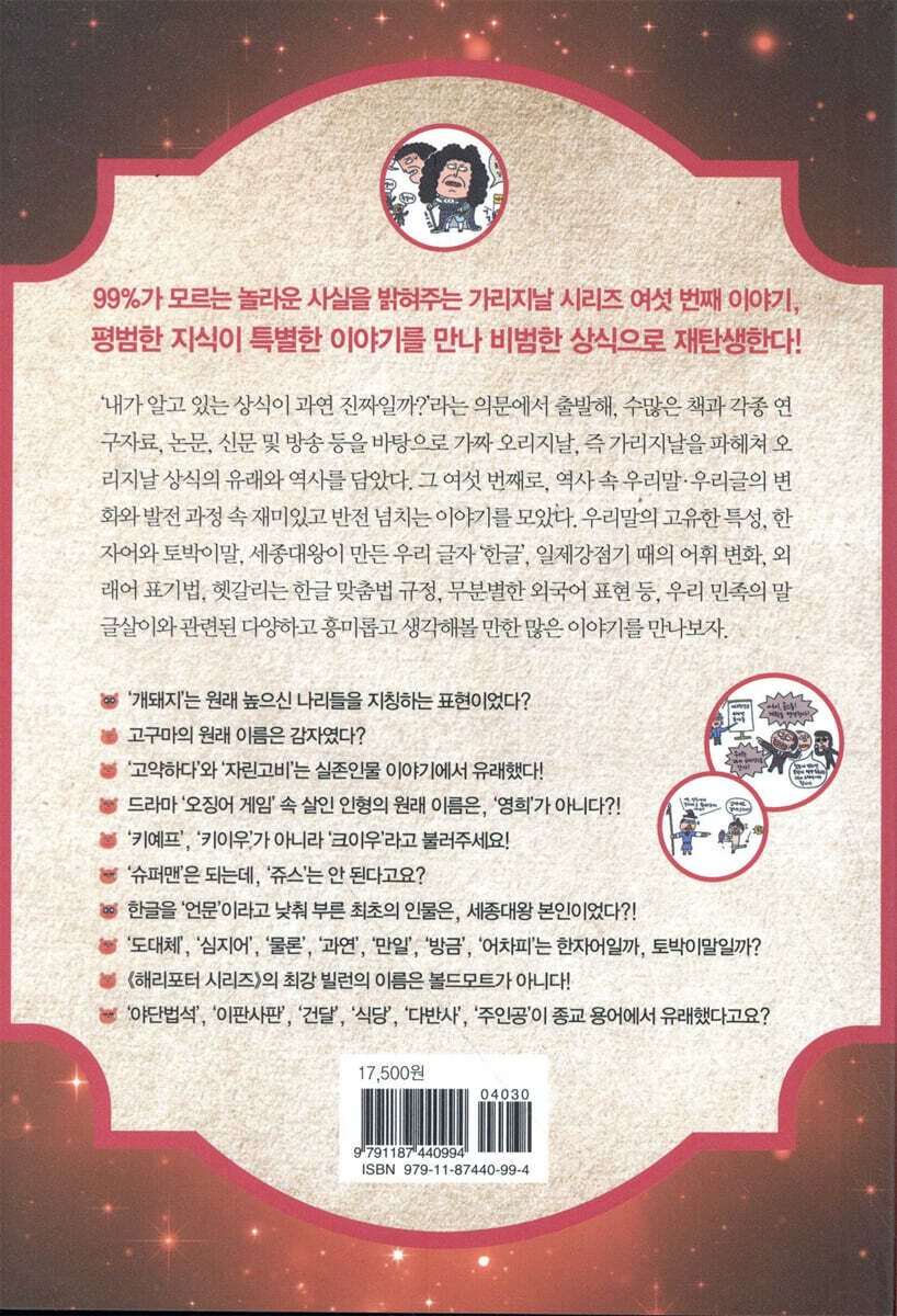 1905년 을사늑약이 체결된 후 장지연(張志淵) 선생은 ‘시일야방성대곡(是日也放聲大哭)’이라는 명 사설을 통해, “저 개, 돼지만도 못한 외무대신 박제순과 각 대신들……”이라고 일갈하신 바 있는 거지요. ---「1부. 고대부터 조선 말기까지 역사 속 우리말?우리글 01. 대중은 ‘개돼지’라고요?」중에서 천둥의 토박이말인 ‘우레’를 한동안 ‘우뢰(雨雷)’라고 썼지요. 원래 ‘우레’였는데 하필이면 ‘비 우(雨)’, ‘번개 뢰(雷)’와 발음이 비슷하다 보니, 우뢰를 우레로 잘못 쓴 것이라 여겨 1938년 《조선어사전》 정리 당시에는 ‘우뢰’를 표준어로 표기했는데, 이후 국어학자들이 옛 문헌을 찾아보니 당초 15세기 문헌부터 ‘울에’ 또는 ‘우레’라는 표현이 있음을 알게 되어 이제는 다시금 ‘우레’가 표준어가 되었습니다. 예전 심형래 감독의 영화 ‘우뢰매’를 기억하는 분들이라면 깜짝 놀랄 일이긴 하네요. 그런데 이 우레라는 단어의 유래를 찾아보면 재미있는 사실을 알 수 있어요. 우레는 조상님들이 ‘하늘이 운다’고 여겨 만든 조합형 단어예요. 즉, ‘울다’에 명사형 접미사 ‘게’가 합쳐져 ‘울게 → 울에 → 우레’로 바뀐 것이지요. 번개도 유사한 형태로 만들어진 단어입니다. 하늘이 번쩍 빛나는 것을 의미하여 ‘번쩍이다’에 명사형 접미사 ‘게’가 합쳐져 ‘번게’ → ‘번개’로 바뀐 것이지요. 하지만 번개와 함께 쓰이는 ‘천둥’은 토박이말이 아니라 ‘천동(天動)’이라는 한자어가 변한 말이에요. 예전에는 땅이 크게 흔들리는 지진(地震)을 ‘지동(地動)’이라고 표현했는데, 하늘에서 큰 소리가 나니 땅처럼 하늘도 지진이 났다고 여겨 지동에 대응하여 천동이라고 한 것이죠. ---「1부. 고대부터 조선 말기까지 역사 속 우리말?우리글 04. 하늘에 걸린 물로 만든 문, 무지개」중에서 이 당시에도 전기 중세국어와 큰 차이는 없었지만, 1446년 ‘훈민정음(訓民正音)’이 반포된 후 발간된 여러 한글 문서에서 14세기에 이중모음, 겹자음이 증가하는 등의 음운 체계에 변화가 생긴 것이 발견된다고 하네요. 인류 역사상 특정 목적을 갖고 한 인물에 의해 창조된 글자는 우리 한글밖에 없다고 자랑하지만, 그건 가리지날이에요. 군주가 백성들을 위해 새로 만든 문자는 제법 존재했지요. 발해를 멸망시킨 거란(요) 태조 야율아보기와 동생 야율질라가 만든 ‘거란 문자’가 존재했고, 이 거란 문자를 본떠 1100년대 금나라 태조 완안아골타가 만든 ‘여진 문자’, 1200년대 원나라 쿠빌라이 칸의 명령을 받은 티벳 불교승 파스파가 전 세계의 언어를 한 문자로 표기하겠다고 만든 ‘파스파 문자’, 1623년 청나라 시조 누르하치가 명령해 만든 ‘만주 문자’ 등이 존재했지만, 막강한 중국 한자 문화에 녹아 모두 사라졌지요. 이에 반해, 오직 한글만이 현재까지 국가 표준문자로 당당히 사용되는 인공 글자로서, 창제 원리와 연도까지 명확히 밝혀진 유일한 문자라고 해야 정확하답니다. 이에 UN 국제기구 ‘유네스코(UNESCO)’에서 1990년부터 매년 9월 8일이면 세계 문맹 퇴치를 위해 애쓴 개인이나 단체에게 주는 상 이름을 다름 아닌 ‘유네스코 세종대왕 문해상(UNESCO King Sejong Literacy Prize)’으로 명명한 것은, 우리 겨레가 세계에 자랑할 수 있는 엄청난 지식 유산이 아닐 수 없습니다. ---「[지식창고 1] 19세기까지의 우리말?우리글의 변화 _ 훈민정음을 언문이라 낮춰 부른 최초의 인물은 누구?」중에서 앞서 우리말을 지키기 위한 노력을 설명했는데, 시기가 시기인 만큼 전체적으로는 일본식 한자어의 침투가 두드러진 시기였습니다. 우리나라 단어 중 60% 가까이가 한자어인데, 대다수 단어가 중국에서 유래한 것으로 여기지만 실제 상당수는 일본에서 만든 한자 용어들입니다. 현재도 여전히 각종 법률, 의학, 건축 등 전문 집단 용어에서 일반인이 언뜻 이해하기 힘든 한자어가 사용되는 것은 다 일본식 한자어 표현을 그대로 가져다 써서 그렇습니다. 민주주의(民主主義), 공화(共和), 정치(政治), 경제(經濟), 문화(文化), 현대(現代), 자유(自由) 등 사회학 관련 용어는 물론, 기각(棄却), 인용(認容) 등 어려운 법률용어, 각종 의학용어, 과학(科學), 지구(地球), 물리(物理), 화학(化學) 등 과학용어를 비롯한 전문 분야 용어 중 대다수는, 19세기에 일본인들이 서양 학술지를 번역하면서 옛 한문 경전에서 단어를 따와서 새롭게 정의 내린 신조어들입니다. ---「[지식창고 2] 개항기부터 일제 해방까지 우리말?우리글의 변화 _ 국가문자 위상 정립부터 소멸 위기까지 롤러코스터를 탄 우리말?우리글」중에서 하지만 이번 글의 주제는 오징어가 아니라, 바로 ‘영희’라는 캐릭터 이름 때문입니다. 다들 ‘철수와 영희’라고 알고 있는데……, ‘영희’는 가리지날입니다. 실제 그 여학생 캐릭터 이름은 ‘영이’입니다. 그게 정말이냐고요? 그럼요~. 이건 분명히 짚고 넘어가야 할 내용이에요. ‘철수와 영이’라는 캐릭터는 일제 지배가 끝나고 대한민국이 탄생하자마자 ‘한글학회’ 선생님들이 고심 끝에 만들어낸 우리나라 남녀 어린이 대표 이름인데, 무심한 후손들이 이걸 어느 순간 스리슬쩍 