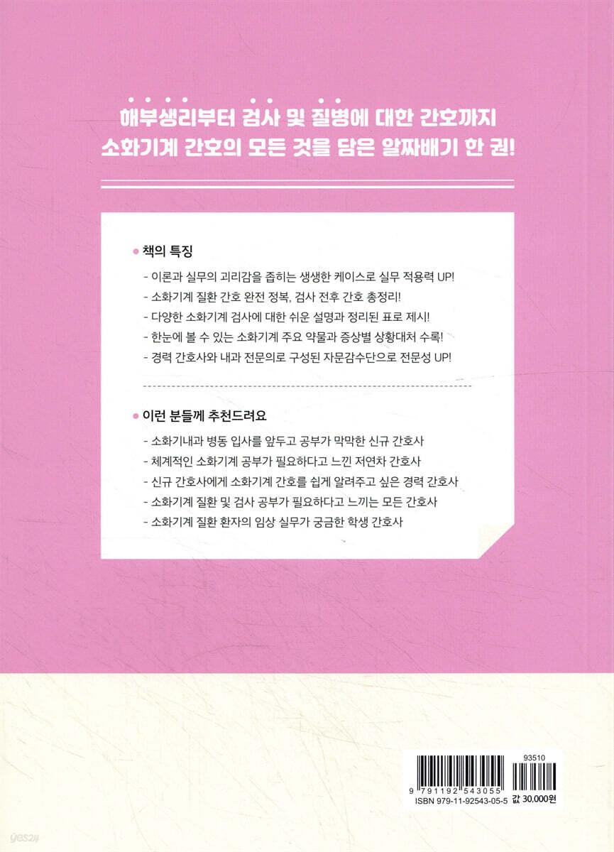 전공의 시절 소화기 내과 병동에서 환자 진료에 힘썼던 날들이 기억납니다. 이 책에는 소화기 간호 업무를 수행하는데 필수인 의학지식과 실제 임상에 실질적 도움이 되는 Tip들이 알차게 담겨있어 곁에 두고 필요할 때마다 찾아보시면 많은 도움을 받을 수 있을 것입니다. 처음에는 모든 것이 두렵고 또 어렵겠지만, “아는 만큼 보이고, 보이는 만큼 알아간다”라는 말처럼 이 책을 든든한 길잡이 삼아 단단하고 훌륭한 간호사로 성장하시길 기원합니다. - 홍주언 (서울아산병원 내과 전문의)