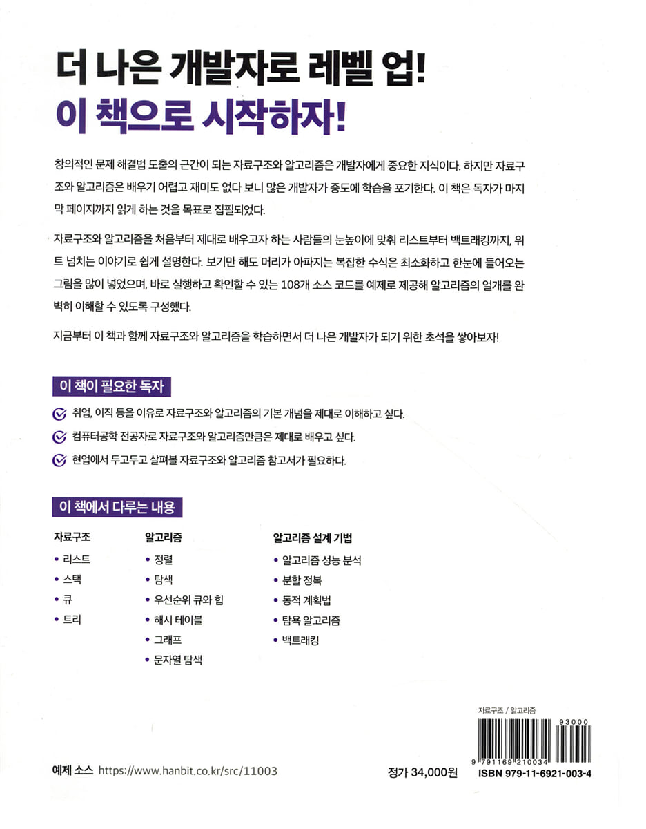 자료구조+알고리즘, 더 나은 개발자가 되기 위한 최고의 Level Up 루트! 자료구조와 알고리즘을 배우면 좋은 개발자가 되는 데 큰 도움이 됩니다. 사실 요즘은 표준 라이브러리에서 여러 알고리즘을 기본으로 제공하고 있으므로 표준 라이브러리만 사용해도 프로그램을 만들기에는 충분합니다. 하지만 아무리 좋은 도구라도 상황에 맞지 않는다면 쓸모가 없습니다. 표준 라이브러리는 개발자에게 있어 도구함과 같습니다. 좋은 개발자라면 상황에 맞는 도구를 잘 꺼내어 쓸 줄도 알아야 합니다. 그렇다면 “상황에 맞는 자료구조와 알고리즘을 어떻게 선택할 수 있을까요?” 자료구조와 알고리즘이 어떤 원리와 구조로 작동하는지 정확하게 이해하고 있어야 합니다. 작동 원리를 알고 있으므로 이것저것 적용해 보면서 허송세월하는, “‘왜 안 되지?’의 시간”을 줄여 더 좋은 프로그램을 만드는 시간에 더 많은 시간을 투자할 수 있습니다. 심지어 문제가 발생했을 때는 상황에 맞게 알고리즘을 개선할 수도 있습니다. 하지만 자료구조와 알고리즘은 배우면 배울수록 더욱 복잡한 수식이 등장하고, 코드마저 점점 길어집니다. 개발자에게는 자료구조와 알고리즘은 레이드 퀘스트와 같습니다. 더 높은 전투력을 가지기 위해 도전하고 또 도전하지만, 클리어는 절대 만만치 않죠. 마찬가지로 더 좋은 개발자가 되기 위해서 자료구조와 알고리즘을 배워야 하지만, 끝까지 배우기는 절대 쉽지 않습니다. 어쩌면 자료구조와 알고리즘은 개발자에게 ‘최종 보스’일지도 모릅니다. 그동안 자료구조와 알고리즘을 끝까지 배우지 못했다면 그건 아직 『이것이 자료구조+알고리즘이다』를 만나지 못했기 때문일 것입니다. 재미는 학습을 계속할 큰 동력이 됩니다. 좋은 동료가 있으면 즐겁게 게임(캠핑, 등산, 운동, 독서 모임 등)을 이어갈 수 있는 것처럼, 좋은 참고서가 옆에 있으면 자료구조와 알고리즘을 끝까지 즐겁게 배울 수 있습니다. 그래서 『이것이 자료구조+알고리즘이다』가 동료로 삼을 만큼 좋은 책이냐고요? 지금부터 『이것이 자료구조+알고리즘이다』의 특징과 다루는 내용을 소개하겠습니다. ● 『이것이 자료구조+알고리즘이다』의 특징 》 자료구조+알고리즘 개념에 위트 넘치는 이야기를 담았다! 》 복잡한 수식은 최소화하고 이해에 꼭 필요한 수식만 담았다! 》 작동 원리를 쉽게 이해할 수 있게 도와주는 다양한 그림을 담았다! 》 배운 내용을 곧바로 점검할 수 있는, 퀘스트처럼 재미있는 다양한 연습문제를 담았다! 》 배운 알고리즘을 바로바로 테스트할 수 있는 108개의 예제 소스를 제공한다! 》 자료구조와 알고리즘 공략을 위한 저자 Q&A 카페를 운영한다! ● 『이것이 자료구조+알고리즘이다』에서 다루는 내용 》 알고리즘의 기반이자 그 자체로도 아주 유용한 4가지 자료구조 → 리스트, 스택, 큐, 트리 》 프로그래밍 실력 향상에 도움되는 6가지 알고리즘 → 정렬, 탐색, 우선순위 큐와 힙, 해시 테이블, 그래프 》 더 좋은 프로그램을 만드는데 도움이 되는 알고리즘 성능 분석법과 4가지 설계 기법 → 알고리즘 성능 분석, 분할 정복, 동적 계획법, 탐욕 알고리즘, 백트래킹 ● 『이것이 자료구조+알고리즘이다』를 읽어야 하는 당신 》 C 언어는 완벽! 그렇지만 취업에 알고리즘이 필요하다던데? → 취업 등을 위해 자료구조와 알고리즘의 기본 개념을 제대로 이해하고 싶은 취업준비생! 》 컴퓨터공학 전공 학점은 완벽! 그렇지만 더 좋은 개발자가 되고 싶은데? → 컴퓨터공학 전공자로 자료구조와 알고리즘만큼은 제대로 배우고 싶은 학생! 》 실무 능력은 거의 완벽! 그렇지만 헷갈릴 수 있는 내용을 그때그때 확인하고 싶은데? → 개발하면 두고두고 살펴볼 자료구조와 알고리즘 참고서가 필요한 개발자! ● 예제 파일 다운로드 → https://www.hanbit.co.kr/src/11003 ● 관련 도서 『혼자 공부하는 C 언어』(한빛미디어, 2019) 『이것이 취업을 위한 코딩 테스트다』(한빛미디어, 2020) |