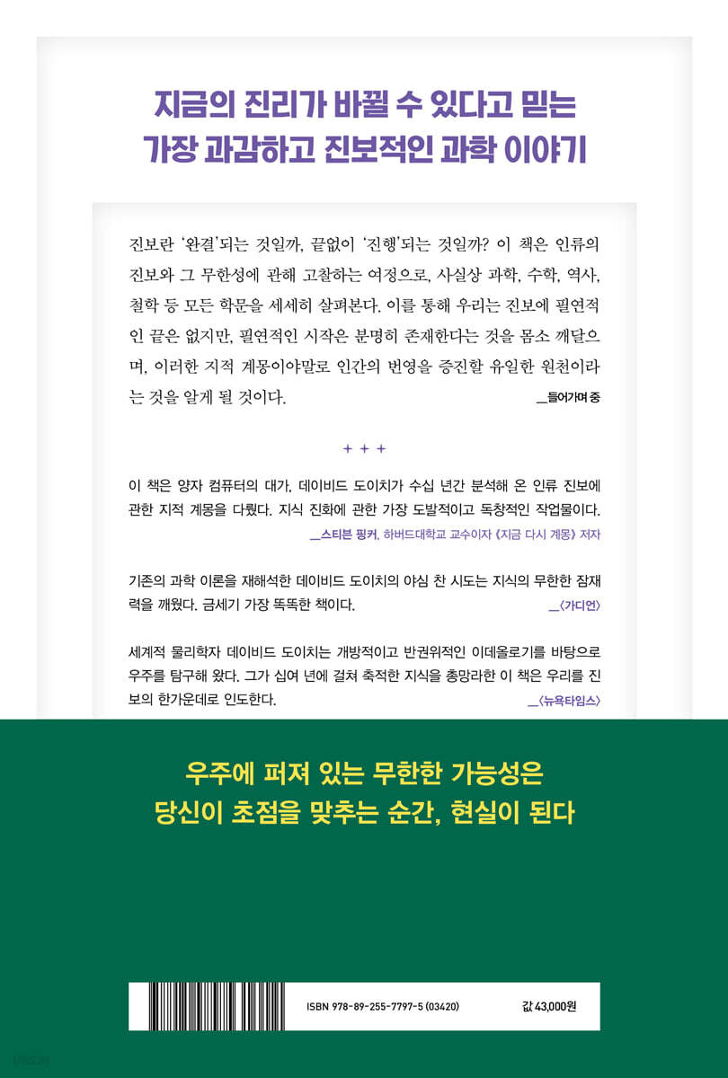 기존의 과학 이론을 재해석한 데이비드 도이치의 야심 찬 시도는 지식의 무한한 잠재력을 깨웠다. 금세기 가장 똑똑한 책이다. - [가디언]