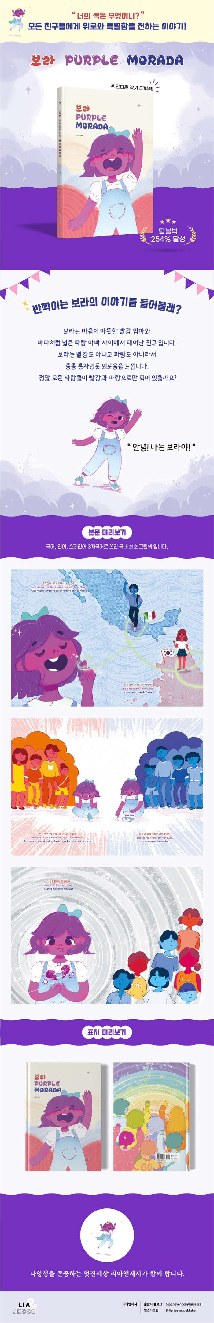 주변 친구들과 똑같은 말을 쓰고, 행동하는 나를 다르게 보인다는 이유로, 어느 나라에서 왔는지, 한국말은 잘 하는지 길을 가다 세워 물어보는 모든 이들에게 이해를 받고 싶어 만든 그림책입니다. 주인공 보라는 따뜻한 마음을 가진 빨강 엄마와 넓은 바다와 같은 파랑 아빠 사이에서 태어난 친구입니다. 보라의 친구들은 보라를 향해 다문화, 외국인 이라고 부르지만, 보라는 자신은 그냥 보라라 소개하며 자신의 이야기를 전하고자 합니다다. 보라와 엄마, 아빠가 쓰는 한국어, 영어, 스페인어인 3가지 언어로 만들어진 보라 그림책입니다.