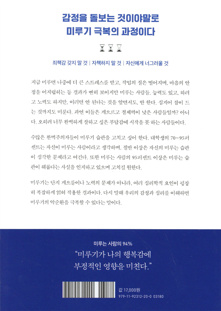 ---「미루기는 감정의 문제다」중에서 완벽주의자들은 대개 능력이 출중하다. 하지만 얼토당토않은 기준을 세워 놓고 일을 미루기 때문에 자신이 설정한 기준을 충족하는 능력이 떨어진다. 이들의 경우 미루기는 ‘더 일찍 시작했어야 했는데’, ‘난 항상 일을 망쳐’ 등 자기비판을 부른다. 또한 완벽주의자는 종종 의도치 않게자 신을 향한 압박 강도를 주변 사람에게도 투영한다. 다른 사람들 역시 자신이 세운 기준을 맞추지 못하면 비판 받아야 한다고 생각한다. ---「완벽주의, 일을 성공적으로 끝내도 만족하지 못한다」중에서 다른 이의 동기를 끌어올리기 위해 상냥하고 자비로운 형태의 언어를 쓰는 데에는 이유가 있다. 이유는 단순하다. 비판보다 훨씬 더 효과적이기 때문이다. 자신과 나누는 대화에도 같은 접근법을 취해 보자. 자기자비(self-compassion)를 연습해야 한다. 일을 시작하지 못해서, 끝내지 못해서, 충분히 빠르게 처리하지 못해서 스스로를 비판하는 바로 그 순간, 당신의 친구나 자녀, 심지어 반려견이 같은 문제를 겪을 때 이들에게 어떤 식으로 말하고 싶을지 떠올려 보라. 명심하자. 벌어진 일은 어쩔 수 없다. 과거에 하지 않은 일에 집착하는 대신 지금부터 할 수 있는 일에 집중하도록 노력하자. ---「나에게 맞는 미루기 극복 전략은?」중에서 일을 시작할 수 있는 비결은 그것이 쉽지 않을 것임을 인정하는 것이다. 운이 좋게도 침실을 만드는 일 외에 아무런 할 일도 없는 날은 오지 않는다. 솔직하게 인정하자. 그리고 어려운 일을 할 때 떠오르는 생각과 감정을 통제할 수 있는 전략을 짜자. 시작을 어려워하는 이유는 힘든 감정과 생각에 대응할 전략을 구상하는 대신 이를 무시하고 아예 없는 척하기 때문이다. 감정을 무시하는 행동은 거실을 날아다니는 모기를 무시하는 것과 같다. 조용히 숨어 있다가 결국 우리를 물고 만다. ---「그냥 시작 자체가 어렵다」중에서 우유부단은 독특한 형태의 회피로, 이 경우 회피의 대상은 결정을 내리는 일이다. 물론 전략적으로 신중을 기해 결정을 연기하는 때도 있다. 그 사이에 정보를 얻어 더 만족할 만한 선택을 할 수도 있고, 시간을 끌어 적극적으로 물건을 팔려는 영업 사원에게 더 좋은 할인 혜택을 얻어낼 수도 있다. 하지만 모든 정보를 얻었음에도 결정을 내리지 않는다면 이는 단순히 결정 지연행동(decisional procrastination)일뿐이다. 우유부단에는 회피 경향이 깊게 뿌리박혀 있다. 결정을 미루면 책임지지 않아도 되고 결정의 여파도 피할 수 있다. 게다가 ‘잘못된’ 선택을 할 경우 겪을 수 있는 후회나 두려움도 피할 수 있다. ---「회피란 무엇인가」중에서 꾸준히 노력하는 게 어려운 이유 중 하나는 당초 과업을 완수하고자 했던 이유를 우리 뇌가 잘 기억하지 못하기 때문이다. 에너지 보존을 가장 중요시하는 뇌는 에너지 소모가 필요한 일을 그만두라며 우리를 열심히 설득한다. 어떠한 과업의 중요성을 상기한 순간 노력이나 다짐, 생산성이 폭발하듯 솟구쳤다가 이내 의욕을 잃고 오랜 시간 무기력해지는 이유가 바로 여기에 있다. 노력을 일정하게 유지하려면 (건강한 음식 섭취, 운동, 휴식 시간 갖기 등의 활동을 통해) 뇌에 에너지를 계속 공급해줘야 하며, 이 과업에 에너지를 쏟는 게 중요하다는 사실을 스스로 되새겨야 한다. ---「시작은 했는데 끈기 있게 해내려면」중에서 |