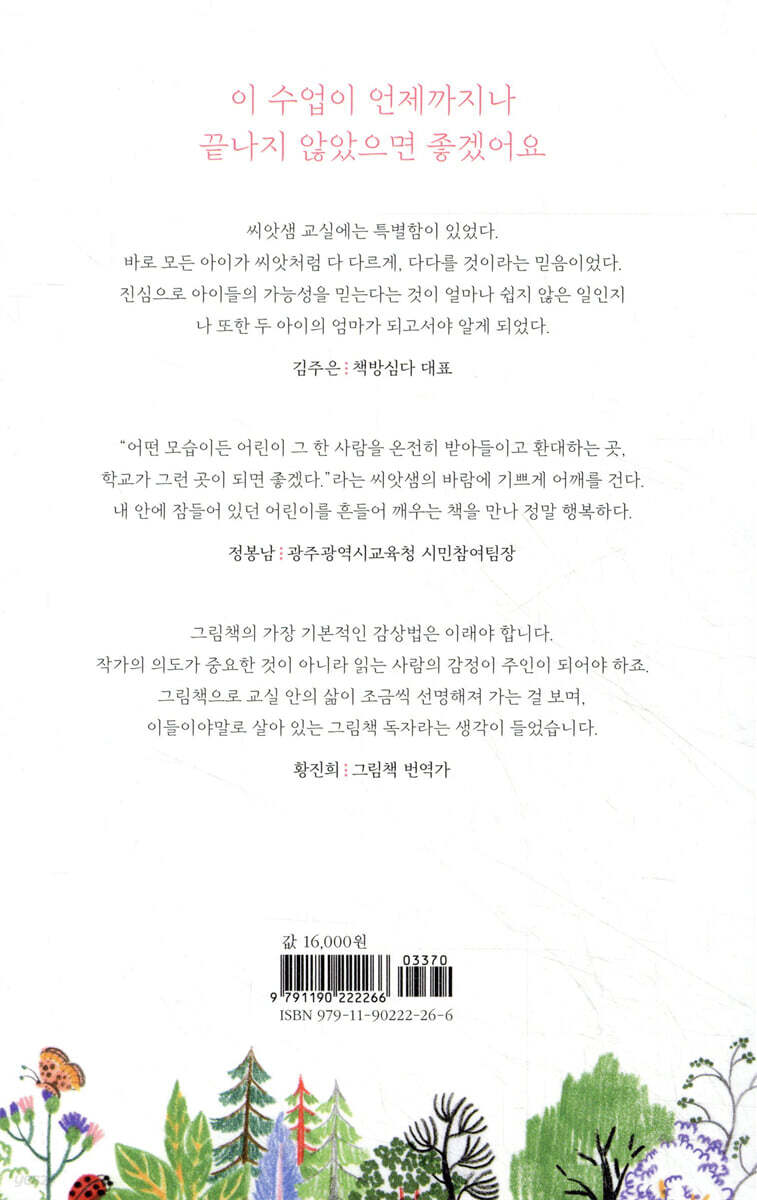 씨앗샘 교실에는 특별함이 있었다. 바로 모든 아이가 씨앗처럼 다 다르게, 다다를 것이라는 믿음이었다. 진심으로 아이들의 가능성을 믿는다는 것이 얼마나 쉽지 않은 일인지 나 또한 두 아이의 엄마가 되고서야 알게 되었다. - 김주은 (책방심다 대표)