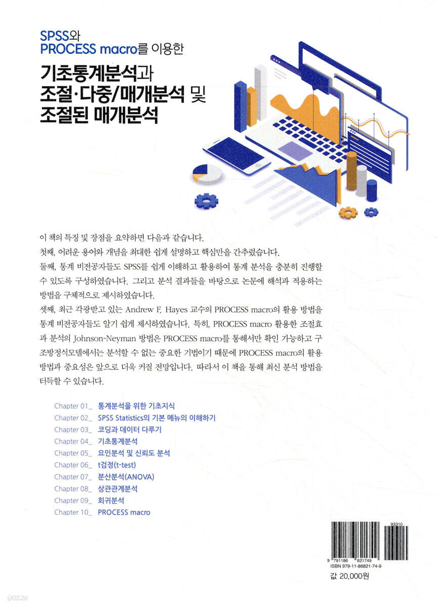 Chapter 01 통계분석을 위한 기초지식 1. 변수의 주요 개념 2. 척도의 이해 3. 가설과 유의수준 Chapter 02 SPSS Statistics의 기본 메뉴의 이해하기 1. SPSS Statistics 기본화면 2. SPSS Statistics 기본메뉴 Chapter 03 코딩과 데이터 다루기 1. 데이터의 코딩 2. 코딩 변경하기 3. 변수계산 Chapter 04 기초통계분석 1. 빈도분석 2. 교차분석 3. 다중응답 4. 기술통계 Chapter 05 요인분석 및 신뢰도 분석 1. 요인분석 2. 신뢰도 분석 Chapter 06 t검정(t-test) 1. 대응표본 t검정 2. 독립표본 t검정 Chapter 07 분산분석(ANOVA) 1. 일원분산분석(One-way-ANOVA) 2. 이원분산분석(Two-way-ANOVA) 3. 반복측정 분산분석(repeated measures ANOVA) Chapter 08 상관관계분석 1. Pearson 상관관계분석 Chapter 09 회귀분석 1. 단순회귀분석 2. 다중회귀분석 3. 더미회귀분석 4. 통제회귀분석 5. 위계적 회귀분석 6. 매개회귀분석 7. 조절회귀분석 Chapter 10 PROCESS macro 1. 매개효과분석 2. 조절효과분석 3. 직렬 다중매개분석 4. 조건부 과정분석·조절된 매개와 매개된 조절분석 |