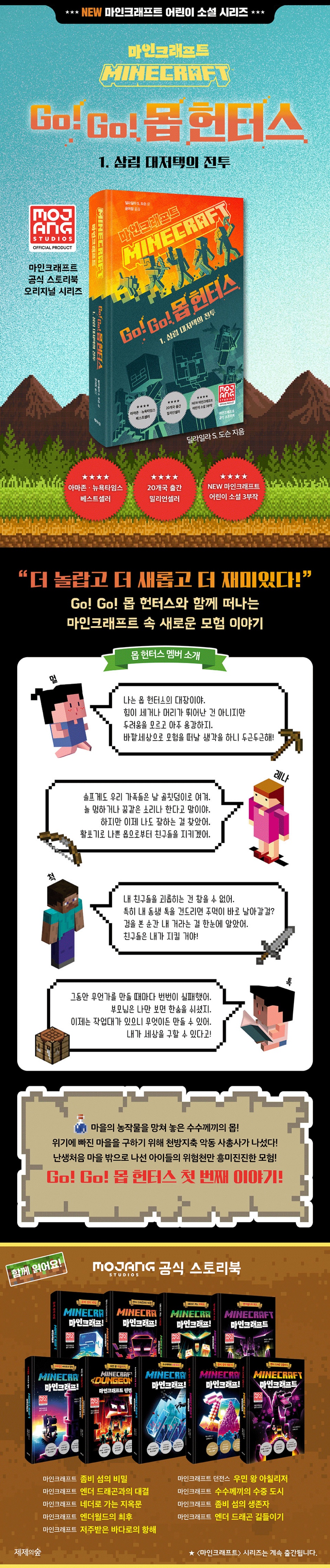 마인크래프트 공식 어린이 소설 NEW 시리즈 ★ 마인크래프트 공식 어린이 소설 시리즈 ★ ★ 아마존·뉴욕 타임스 베스트셀러! ★ ★ 독일·일본·폴란드·중국 등 20개국 출간! ★ 또 다시 마인크래프트 열풍이 불어온다! 게임 그 이상의 재미와 감동! 1억 2천 명이 넘는 유저를 보유한 마인크래프트는 이제 단순한 게임을 넘어서 전 세계 사람들이 사랑하는 문화 콘텐츠로 거듭났다. 특히 마인크래프트 제작사인 모장에서 출간한 마인크래프트 어린이 소설 시리즈는 열광적인 지지와 인기를 얻으며 믿고 보는 시리즈가 되었다. 그리고 마침내 모장에서 새롭게 선보이는 시리즈 『마인크래프트 Go! Go! 몹 헌터스』가 출간되었다. 총 3부로 이루어진 이 시리즈는 역대 마인크래프트 소설 중 최고라는 호평과 함께 게임 이상의 재미와 감동을 준다는 찬사를 받으며, 벌써부터 다음 권에 대한 기대를 불러 모은다. 한층 깊이 있는 세계관과 입체적인 캐릭터들, 흡입력 있는 이야기와 빠른 전개로 그림 없이 300쪽이 훌쩍 넘는 분량임에도 마지막 장까지 술술 읽힌다. 다시 전 세계에 마인크래프트 열풍을 일으킬 『마인크래프트 Go! Go! 몹 헌터스』 시리즈를 지금 만나 보자. 천방지축 악동들, 마을을 구할 영웅이 되다?! 난생처음 벽 너머의 세계로 떠나는 모험! 멀, 레나, 척, 톡, 이 네 명은 가장 친한 친구다. 넷은 높은 벽으로 둘러싸인 코르누코피아 마을에 살고 있는데, 마을에서 사고뭉치 악동으로 불린다. 어느 날, 레나는 날개가 달린 회색의 정체를 알 수 없는 몹이 코르누코피아의 벽을 통과하여 호박 밭에 물약을 뿌리는 모습을 본다. 다음 날 마을 밭의 농작물은 모두 썩고 물러 엉망이 된다. 아이들은 자신이 본 걸 이야기하지만 어른들은 아무도 믿지 않고, 결국 아이들은 마을에서 가장 나이가 많은 멀의 고조할머니를 찾아간다. 고조할머니는 아이들에게 벽 너머의 세상에 대해 들려주며 마을을 구할 방법 역시 벽 너머 바깥세상에 있다고 이야기한다. 마을을 구하기 위해 난생처음 벽 너머의 세상으로 나온 아이들. 상상도 하지 못했던 위험과 맞닥뜨리는데……. 『마인크래프트 Go! Go! 몹 헌터스』 시리즈의 첫 번째 권인 『삼림 대저택의 전투』는 ‘몹 헌터스’가 어떻게 탄생했는지를 보여 준다. 높은 벽으로 둘러싸인 마을에 살며 벽 너머의 세상에 대해 모른 채 살아가던 멀, 레나, 척, 톡 이 네 명의 아이들이 마을을 구하기 위해 벽 바깥의 세상으로 모험을 떠나는 이야기다. 고립된 마을에서 살던 아이들은 벽 너머의 드넓은 오버월드를 경험하면서 자신도 미처 몰랐던 숨겨져 있던 재능을 깨닫고 자아를 찾으며 점차 성장해 나간다. 각각 개성 넘치면서 입체적인 캐릭터들과 흥미진진한 스토리는 한편의 애니메이션을 보는 듯하다. 특히 마인크래프트 세계 속 생생한 묘사는 마치 게임 속에 직접 들어간 것 같은 즐거움을 준다. 갖은 시련을 겪으며 서로에게 자신의 진실한 모습을 드러내고 속 깊은 이야기를 나누며 우정을 쌓는 주인공들의 모습은 마인크래프트 게임을 잘 모르는 독자들에게도 큰 울림을 줄 것이다. |