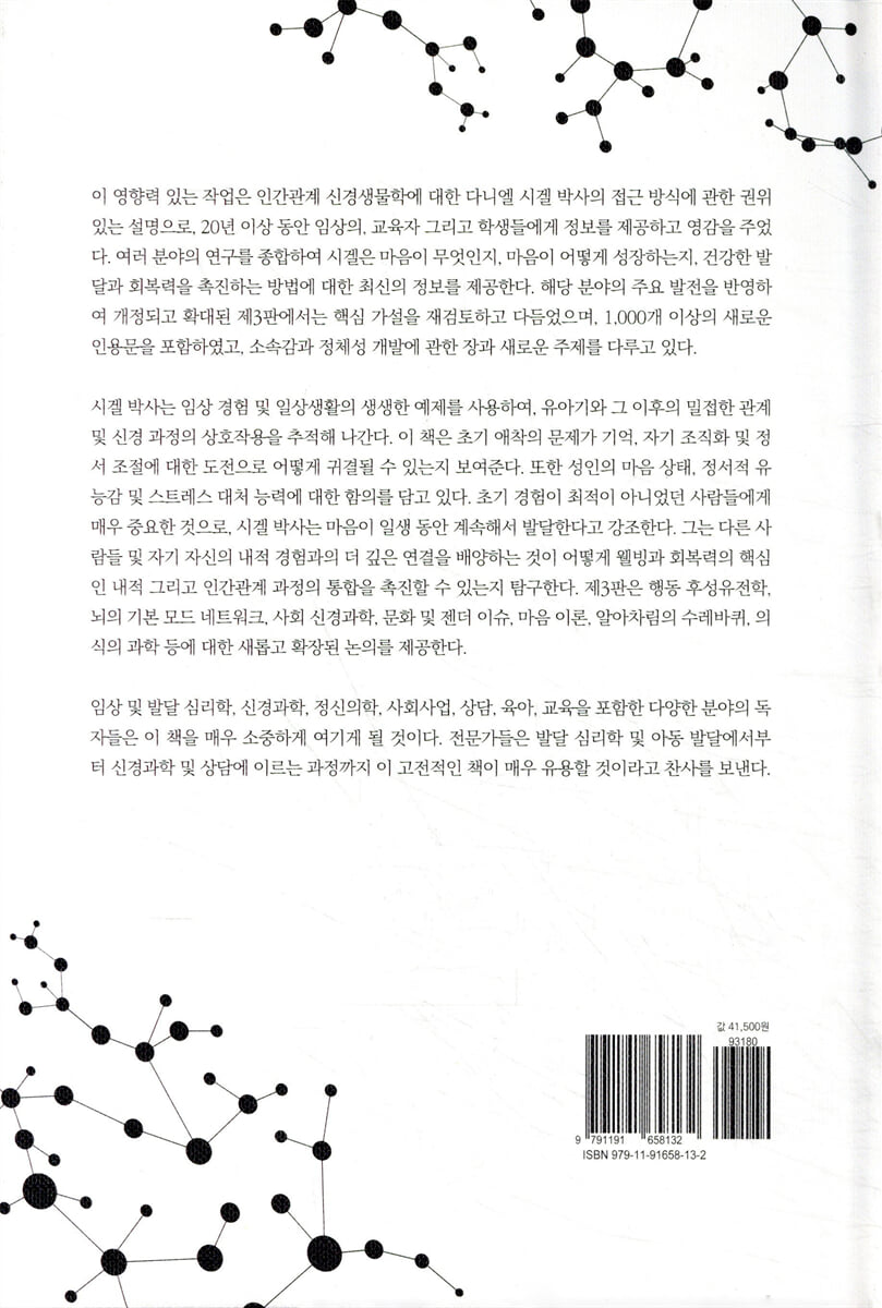역자 서문 저자 서문 감사의 글 Intro │ 마음이란 도대체 무엇인가? - 인간관계 신경생물학의 전망 01 │ 체화된 뇌, 알아차림(인식) 에너지의 본성 02 │ 마음 상태 - 응집성, 주관적 경험과 복잡계 03 │ 기억과 내러티브 04 │ 애착과 자기감 05 │ 통합의 변화로서 감정 06 │ 표상과 정신적 실재 - 처리 모드와 경험의 구성 07 │ 조절과 일관성 08 │ 인간관계 연결 그리고 관계하는 마음 09 │ 통합(내부 그리고 관계의 통합) 10 │ 소속감, “자기”, 그리고 나 더하기 우리 = 나우리로 통합된 정체성 - 통합 촉진에 관한 기초 연구 용어 설명 Notes 참고문헌 찾아보기 |