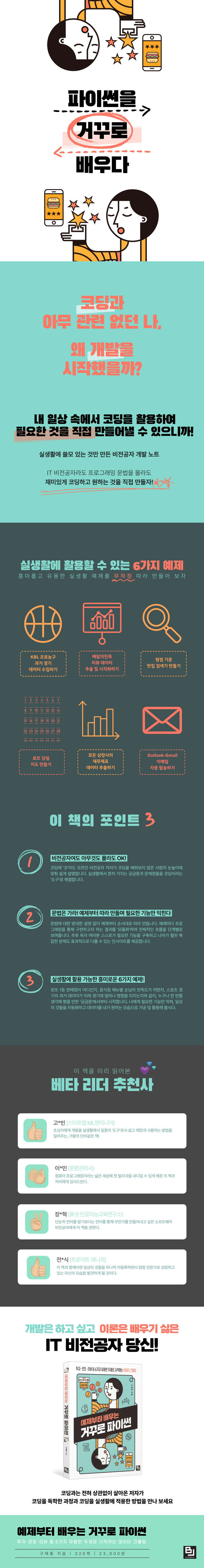 “코딩과 아무 관련 없는 나, 왜 개발을 시작했을까?”평범한 비전공자가 개발자보다 더 개발자스럽게 만든 예제를 따라 만들어 보세요퇴근 후 ‘취미’로 코딩하기! 여러분도 충분히 할 수 있습니다『예제부터 배우는 거꾸로 파이썬』은 비전공자를 위한 책입니다. 그러나 ‘개발자’가 되기 위해 봐야 하는 책은 아닙니다. 코딩 자체를 알려드리는 것에 목표를 두지 않고, 코딩을 ‘도구’로 활용하여 여러분이 코딩에 대한 경계를 없애고, 최종적으로 여러분의 삶에 코딩을 ‘활용’할 수 있도록 돕습니다. 책에서 다룬 예제들이 저자에게 왜 필요했는지, 어떤 방법으로 만들었는지, 어떤 코드를 작성했는지와 같은 순서로, 저자의 경험 그대로를 담았습니다. 코딩과는 전혀 상관없이 살아온 저자가 코딩을 독학한 과정과 코딩을 실생활에 적용한 방법을 만나 보세요.· 비전공자여도 아무것도 몰라도 OK!코딩에 ‘코’자도 모르던 비전공자 저자가 비개발자의 시선에서, 코딩을 배워보지 않은 사람의 눈높이에 맞춰 쉽게 설명합니다. 실생활에서 흔히 가지는 궁금증과 문제점들을 코딩이라는 ‘도구’로 해결하는 방법을 알려줍니다.· 문법은 가라! 예제부터 따라 만들며 필요한 기능만 익힌다문법에 대한 방대한 설명 없이 예제부터 순서대로 따라 만듭니다. 예제마다 프로그래밍을 통해 구현하고자 하는 결과를 ‘모듈화’하여 전체적인 흐름을 단계별로 보여줍니다. 전체적인 흐름을 보여주어, 추후 독자 여러분 스스로가 필요한 기능을 구축하고 나아가 훨씬 복잡한 문제도 효과적으로 다룰 수 있는 인사이트를 제공합니다.· 실생활에 활용 가능한 흥미로운 6가지 예제!책의 예제는 로또 1등 판매점이 어디인지, 음식점 메뉴별 손님의 만족도가 어떤지, 스포츠 경기의 과거 데이터가 미래 경기에 얼마나 영향을 미치는지와 같이, 누구나 한 번쯤 생각해 봤을 만한 ‘궁금증’에서부터 시작합니다. 현실 데이터를 다루는 방법을 익혀 여러분이 필요한 것을 직접 만들어 보세요!