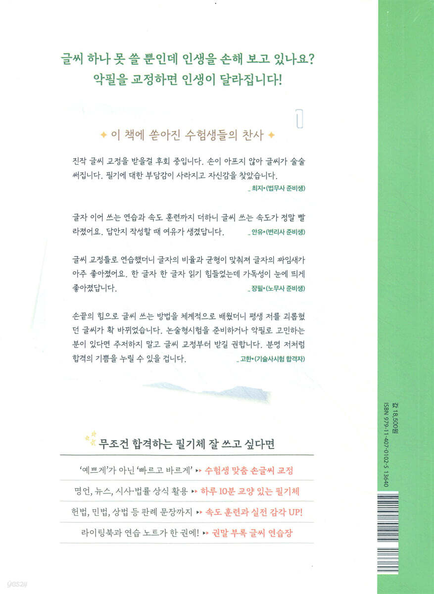 하루 10분! 빠르고 바르게 마스터하는 최단기 악필 교정 노트 컴퓨터와 패드로 업무를 처리하는 스마트 시대에 아이러니하게도 최상위 시험의 대부분은 손글씨로 답안지를 작성해야 한다는 사실을 알고 있나요? 답안지의 반도 못 썼는데 손이 아파 더 이상 글씨를 쓸 수 없다면? 나조차 알아보기 힘든 글씨 때문에 감점될까 두렵다면? 글씨 하나 못 쓸 뿐인데 인생을 손해 볼 수는 없습니다. 대한민국 대표 글씨 교정 멘토의 악필 교정 비법이 담긴 《빠른 글씨 바른 글씨》. 이 책은 바르게 쓰지 못하는 원인, 글씨를 쓸 때마다 손이 아픈 원인, 악필의 원인을 과학적으로 분석한 후 교정법을 제시합니다. 무엇보다 필속이 관건인 수험생을 위해 빠르게 써도 글자의 형태가 무너지지 않게 해주는 우상향 글씨 교정틀을 활용했습니다. 글씨의 획순은 줄이고 가독성은 높인 ‘무조건 합격하는 필기체’를 만나보세요. 시사·법률 상식부터 헌법·민법·행정법 등 판례 문장까지! 속도 훈련과 실전 감각을 동시에 키우며 누구나 교양 있는 필기체를 완성할 수 있습니다. 대한민국 No.1 글씨 교정 전문가의 악필 유형에 따른 교정법 대한민국 대표 악필 교정 마스터로 교육 1번지 대치동의 학생과 학부모는 물론 대학생과 수험생, 직장인까지 앞다퉈 찾는 글씨 교정 전문학원 ‘참바른글씨’ 대표의 15년 노하우를 담은 책이다. 잘못된 손의 모양과 힘에 따라 크게 4가지로 나뉘는 악필 유형을 과학적으로 분석하고, 그에 따른 교정 방법을 체계적으로 소개한다. 손의 힘을 모으는 방법, 손의 힘을 유지하는 방법 등 손힘을 제대로 쓰는 방법만 익혀도 통증 없이 빠르고 바르게 글씨를 쓸 수 있다. 무시무시한 악필도 바른 필기체로 바꿔줄 뿐만 아니라 느린 글씨에 속도를 붙여주는 빠른 글씨체로 글씨 자신감과 학습능력을 동시에 키워보자. 빠른 글씨도 바르게 쓸 수 있다! 가독성 좋은 글씨를 위한 6가지 키포인트 제한 시간 내에 많은 글씨를 써야 하는 수험생과 취업 준비생, 자격증을 준비하는 40~50대의 가장 큰 고민은 바로 속도와의 전쟁! 빠르게 써야 한다는 불안한 마음은 들쭉날쭉 크기가 제멋대로인 글씨, 알아볼 수 없을 정도로 날아다니는 글씨로 이어져 악필의 늪에 빠지기 쉽다. 포인트는 바른 자세에서 바른 글씨가 나온다는 것. 노트와 눈의 거리, 책상과 상체의 간격, 노트와 손의 위치 등 자세 교정부터 꼼꼼하게 체크하자. 자세가 잡혔다면 자음과 모음, 받침의 짜임새를 고려한 우상향 글씨 교정틀로 균형감 있고 안정적인 필기체를 연습한다. 그 밖에 5단계 손힘 조절법, 접필 불량과 잔선 불량 습관을 고치는 방법, 수험생에게 유리한 필기구 추천까지 유용한 팁을 만날 수 있다. 뉴스부터 시사·법률 상식까지, 하루 10분 교양 있는 필기체 완성 헌법, 민법, 행정법, 상법 등 판례 문장 따라 쓰며 실전 감각 UP! 우리가 흔히 말하는 못 쓰는 글씨는 잘 읽히지 않는 글씨다. 한마디로 가독성이 나쁜 글씨는 읽기 어려울 뿐만 아니라 내용 파악이 어려워 채점자에게 좋은 점수를 받을 수 없다. 반면 예쁜 필체인데도 산만해 보여서 눈에 들어오지 않는 글씨가 있다. 그 원인은 바로 자간과 띄어쓰기! 수험생이라면 꼭 알아야 할 시사·법률 상식과 뉴스 문장을 따라 쓰며 글자의 일정한 크기와 높이를 연습해보자. 하루 10분이면 교양 있는 필기체를 완성할 수 있다. 연습도 실전처럼 하고 싶다면 헌법, 민법, 행정법, 상법 등 판례 문장을 따라 쓰며 속도 훈련을 해보자. 표준 논술형 답안지 기준으로 16~19초 내지 20~23초 이내에 한 문장을 써내야 한다. 2차 논술시험 답안지 작성 요령까지 알차게 담아 국가고시 및 각종 자격증 시험을 준비하는 수험생의 실전 감각을 키우는 데 꼭 필요한 책이 될 것이다. [서평] 진작 글씨 교정을 받을걸 후회 중입니다. 손이 아프지 않아 글씨가 술술 써집니다. 필기에 대한 부담감이 사라지고 자신감을 찾았습니다. - 최지*(법무사 준비생) 글씨 교정틀로 연습했더니 글자의 비율과 균형이 맞춰져 글자의 짜임새가 아주 좋아졌어요. 한 글자 한 글자 읽기 힘들었는데 가독성이 눈에 띄게 좋아졌습니다. - 장필*(노무사 준비생) 글자 이어 쓰는 연습과 속도 훈련까지 더하니 글씨 쓰는 속도가 정말 빨라졌어요. 답안지 작성할 때 여유가 생겼답니다. - 안유*(변리사 준비생) 손끝의 힘으로 글씨 쓰는 방법을 체계적으로 배웠더니 평생 저를 괴롭혔던 글씨가 확 바뀌었습니다. 논술형시험을 준비하거나 악필로 고민하는 분이 있다면 주저하지 말고 글씨 교정부터 받길 권합니다. 분명 저처럼 합격의 기쁨을 누릴 수 있을 겁니다. - 고한*(기술사시험 합격자) |