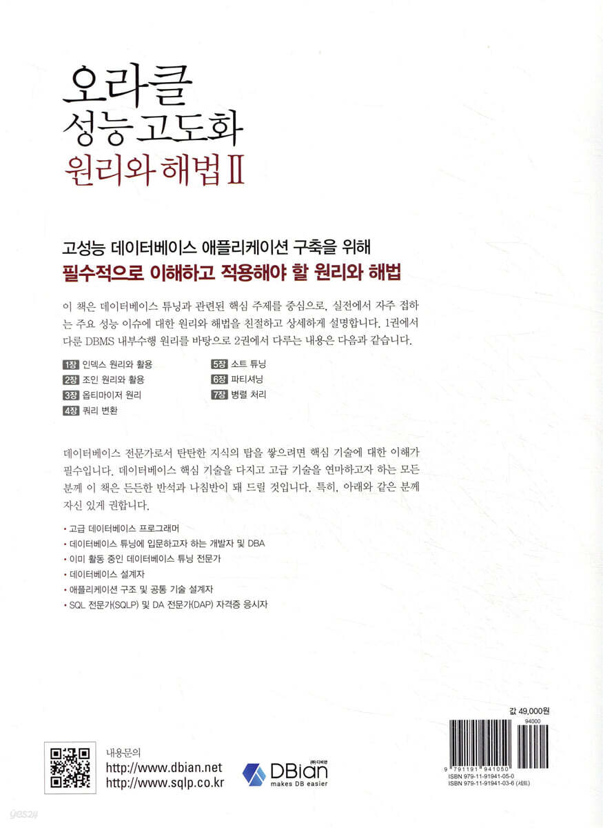 이 책은 데이터베이스 튜닝과 관련된 핵심 주제를 중심으로, 실전에서 자주 접하는 주요 성능 이슈에 대한 원리와 해법을 친절하고 상세하게 설명합니다. 1권에서 다룬 DBMS 내부수행 원리를 바탕으로 2권에서 다루는 내용은 다음과 같습니다. 1장. 인덱스 원리와 활용 2장. 조인 원리와 활용 3장. 옵티마이저 원리 4장. 쿼리 변환 5장. 소트 튜닝 6장. 파티셔닝 7장. 병렬 처리 데이터베이스 전문가로서 탄탄한 지식의 탑을 쌓으려면 핵심 기술에 대한 이해가 필수입니다. 데이터베이스 핵심 기술을 다지고 고급 기술을 연마하고자 하는 모든 분께 이 책은 든든한 반석과 나침반이 돼 드릴 것입니다. 특히, 아래와 같은 분께 자신 있게 권합니다. - 고급 데이터베이스 프로그래머 - 데이터베이스 튜닝에 입문하고자 하는 개발자 및 DBA - 이미 활동 중인 데이터베이스 튜닝 전문가 - 데이터베이스 설계자 - 애플리케이션 구조 및 공통 기술 설계자 - SQL 전문가(SQLP) 및 DA 전문가(DAP) 자격증 응시자 내용 문의 → www.dbian.net, www.sqlp.co.kr "DB 모델러, DBA, 개발자들이 DBMS 성능 문제를 스스로 진단하고 해법을 찾을 수 있는 명쾌한 제언 및 해답!" 여러 대형 차세대 시스템 구축 프로젝트와 초 대용량 데이터베이스 환경에서 실제 적용했던 주옥 같은 튜닝 사례들을 DBMS 내부 작동 메커니즘 원리와 함께 엮어 체계적으로 설명한 본서는 고성능 DBMS 개발 및 운영 환경을 위한 지침서가 될 것이고 데이터베이스 최적화 전문가를 위한 최고의 DB정석서가 될 것이라 확신한다. 단편적인 지식이나 저자 주관적인 논리보다는 원리와 실전 스토리를 중심으로 현장감 있게 이론과 해법을 전개하였으므로, 책을 읽으면서 얽히고 설킨 실타래가 풀리듯 평소 고민하던 궁금증들이 마법처럼 풀리는 느낌을 받을 것이다. 디비안 포럼 → http://www.dbian.net |