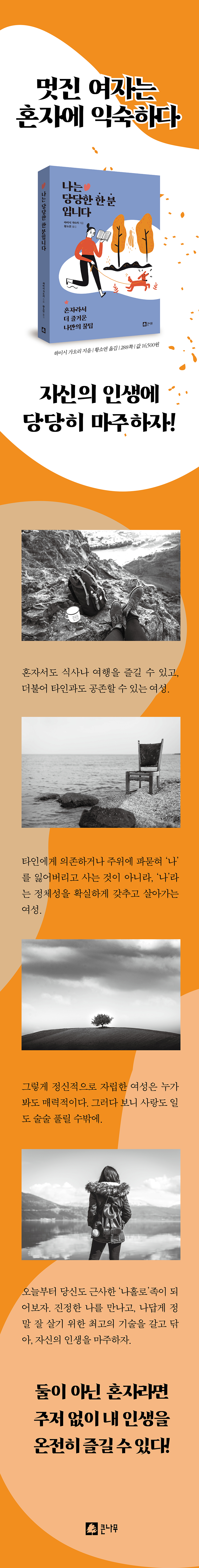 Chapter 1 ‘나홀로’족의 세계에 오신 것을 환영합니다 Lesson 01 ‘나홀로’족이 뭐예요? 10 Lesson 02 ‘나홀로’족으로 똑똑한 여자가 되자 21 Lesson 03 마음의 비타민을 마시자 32 Lesson 04 혼자서나 둘이서나 42 Lesson 05 ‘나’를 재발견한다 51 칼럼 1 ─ 혼자 즐기는 드라이브 57 Chapter 2 가까운 주변부터 출발! Lesson 06 자신에게 딱 맞는 ‘맞춤’을 60 Lesson 07 마이 룸, 마이 드림 69 Lesson 08 혼자를 위한 소품들 81 Lesson 09 오늘부터 시작하는 ‘나홀로’족 데뷔기 90 Lesson 10 데뷔는 카페에서 99 칼럼 2 ─ 혼자를 위한 인테리어 107 Chapter 3 혼자 찾아가는 맛집 Lesson 11 혼자라서 더 맛있는 맛집 고르기 110 Lesson 12 처음에는 친한 친구와 함께 122 Lesson 13 자, 문을 열고서 131 Lesson 14 반주 한 잔의 여유를 즐기는 당신은 진정한 ‘나홀로’족! 141 Lesson 15 다양한 맛집으로 진출! 148 칼럼 3 ─ 나의 ‘나홀로족’ 데뷔기 157 Chapter 4 혼자 마시는 멋, 바를 찾아서 Lesson 16 바는 이렇게 골라라 160 Lesson 17 바에서는 이렇게 행동하라 169 Lesson 18 바를 200% 활용하는 방법 181 Lesson 19 좀 더 똑똑하게 술을 마시기 위해 189 칼럼 4 ─ 혼자서는 아무것도 못 하는 ‘맨’들을 위해 201 Chapter 5 혼자 떠나는 여행으로 당신을 초대합니다 Lesson 20 조금만 발을 내딛으면 204 Lesson 21 가벼운 마음으로 떠나는 온천 여행 213 Lesson 22 호텔에서 마음의 때를 벗긴다 220 Lesson 23 나 홀로 여행을 두 배로 즐기기 위해 229 Lesson 24 꿈에 그린 펜션으로 출발! 239 칼럼 5 ─ 진정한 ‘나’를 찾고 싶다면 247 Chapter 6 시대는 ‘나홀로’족을 원한다 Lesson 25 ‘나홀로’족의 탄생 252 Lesson 26 ‘나홀로’족의 사회적 배경 256 Lesson 27 지금 왜, ‘나홀로’족인가? 265 Lesson 28 ‘나홀로’족이여, 영원하라 275 에필로그 인간이 살아가는 데 가장 중요한 ‘자립’의 필요성 284 |