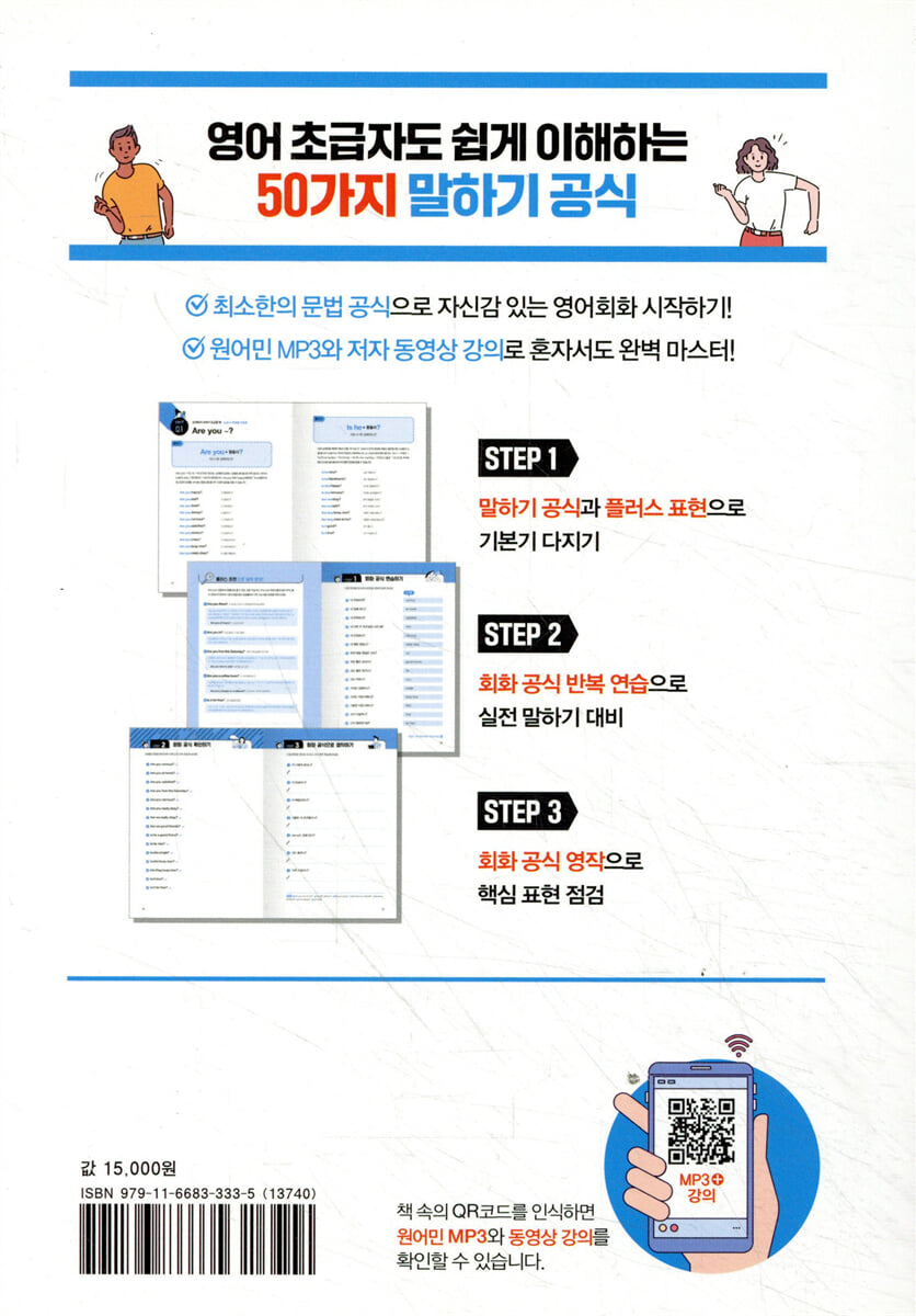 UNIT 02 I'm ~. 내가 누구인지, 나의 상태를 설명할 때: be동사 현재형 긍정문 UNIT 03 I'm not ~. 아닌 건 아니라고 말할 때: be동사 현재형 부정문 UNIT 04 Were you ~? 상대방이 과거에 어땠는지 궁금할 때: be동사 과거형 의문문 UNIT 05 I was ~. 내가 과거에 어땠는지 설명할 때: be동사 과거형 긍정문 UNIT 06 I wasn't ~. 지나간 과거에 대해 아니라고 말할 때: be동사 과거형 부정문 UNIT 07 Do you ~? 상대방이 평소에 하는 일이 궁금할 때: 일반동사 현재형 의문문 UNIT 08 I do ~. 내가 평소에 하는 일을 말할 때: 일반동사 현재형 긍정문 UNIT 09 I don't ~. 어떤 일을 하지 않는다고 말할 때: 일반동사 현재형 부정문 UNIT 10 Did you ~? 상대방이 과거에 한 일을 물어볼 때: 일반동사 과거형 의문문 UNIT 11 I did ~. 과거에 한 일을 설명할 때: 일반동사 과거형 긍정문 UNIT 12 I didn't ~. 과거에 하지 않은 일을 말할 때: 일반동사 과거형 부정문 UNIT 13 Do. 명령하고 부탁할 때: 명령문 UNIT 14 Don't ~. 하지 말라고 명령하거나 부탁할 때: 부정 명령문 UNIT 15 Let's ~. 뭔가 같이 하자고 제안할 때: 청유문 UNIT 16 Can you ~? 상대방에게 부탁할 때: 조동사 can 의문문 UNIT 17 I can ~. 할 수 있다, 해도 된다고 말할 때: 조동사 can 긍정문 UNIT 18 I can't ~. 할 수 없다, 하면 안 된다고 말할 때: 조동사 can 부정문 UNIT 19 I'll ~. 뭔가 할 거라고 의지를 표현할 때: 조동사 will 긍정문 UNIT 20 I won't ~. 하지 않을 거라고 말할 때: 조동사 will 부정문 UNIT 21 Would you ~? 상대방에게 공손하게 물어볼 때: 조동사 would 의문문 UNIT 22 I'd like to ~. 뭔가 하고 싶다고 공손하게 말할 때: would like to 긍정문 UNIT 23 Should I ~? 뭔가 해야 하는지 물어볼 때: 조동사 should, have to 의문문 UNIT 24 I should ~. 뭔가를 해야 한다고 말할 때: 조동사 should, have to 긍정문 UNIT 25 You shouldn't ~. 굳이 하지 않아도 된다고 말할 때: 조동사 should, have to 부정문 UNIT 26 Is there ~? 뭔가 있냐고 물어볼 때: Is/Are there 의문문 UNIT 27 There is ~. 뭔가 있다고 설명할 때: There is/are 긍정문 UNIT 28 There isn't any ~. 뭔가가 전혀 없다고 말할 때: There is/are 부정문 UNIT 29 Are you -ing? 상대방이 현재 뭐하고 있는지 궁금할 때: 현재진행형 의문문 UNIT 30 I'm -ing. 현재 하고 있는 일을 말할 때: 현재진행형 긍정문 UNIT 31 I'm not -ing. 현재 하고 있지 않다고 말할 때: 현재진행형 부정문 UNIT 32 Are you going to ~? 앞으로의 결심, 계획을 물어볼 때: be going to 의문문 UNIT 33 I'm going to ~. 계획을 세워 놓은 미래를 말할 때: be going to 긍정문 UNIT 34 I'm not going to ~. 뭔가를 할 계획이 없다고 말할 때: be going to 부정문 UNIT 35 Have you ever p.p.? 상대방의 경험을 물어볼 때: 현재완료형 의문문 UNIT 36 I've p.p.. 나의 경험에 대해 말할 때: 현재완료형 긍정문/부정문 UNIT 37 I've p.p. since/for ~. 그때부터 지금까지 계속 해 온 일을 말할 때: 현재완료형+since/for UNIT 38 I've just/already p.p.. 과거에 일어난 일이 현재에 영향을 줄 때: 현재완료형+just/already/not~yet UNIT 39 I've been -ing. 과거에 시작한 일을 지금도 계속 하고 있을 때: 현재완료 진행형 UNIT 40 Who+동사? ‘누구’인지 궁금할 때: Who 의문문 1 UNIT 41 Who do you ~? ‘누구를’인지가 궁금할 때: Who 의문문 2 UNIT 42 What+동사? ‘무엇’인지 궁금할 때: What 의문문 1 UNIT 43 What do you ~? ‘무엇을’인지가 궁금할 때: What 의문문 2 UNIT 44 What+명사~? ‘어떤 것’인지 궁금할 때: What 의문문 3 UNIT 45 When do you ~? ‘언제’인지 궁금할 때: When 의문문 UNIT 46 Where do you ~? ‘어디’인지 궁금할 때: Where 의문문 UNIT 47 How do I ~? ‘어떻게’인지 궁금할 때: How 의문문 1 UNIT 48 How ~? ‘얼마나’인지 궁금할 때: How 의문문 2 UNIT 49 How long ~? ‘얼마나 오래‘인지 궁금할 때: How 의문문 3 UNIT 50 Why ~? ‘왜’인지 궁금할 때: Why 의문문 |