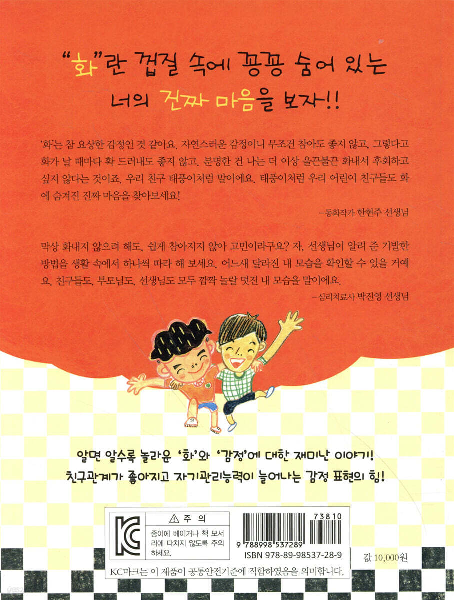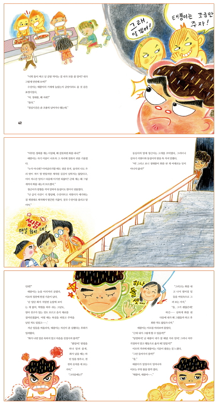 왜 내 마음을 안 알아줘?!! 나를 자꾸 열 받게 한다구! 분노의 이어달리기 태풍, 모든 아이의 적이 되다 방글방글, 방글이 이모가 나타나다! 서먹한 친구들과 한 모둠이 되다니! 태풍이의 결심 아슬아슬, 첫 번째 회의가 시작되다 울끈불끈, 화가 나! 참을 수 없어! 욱하고 화내던 태풍이가 달라졌다! **부글부글 치솟는 화! 화는 무엇으로 만들어지는 거예요? **앗, 화가 난다면 이렇게 해 봐! |