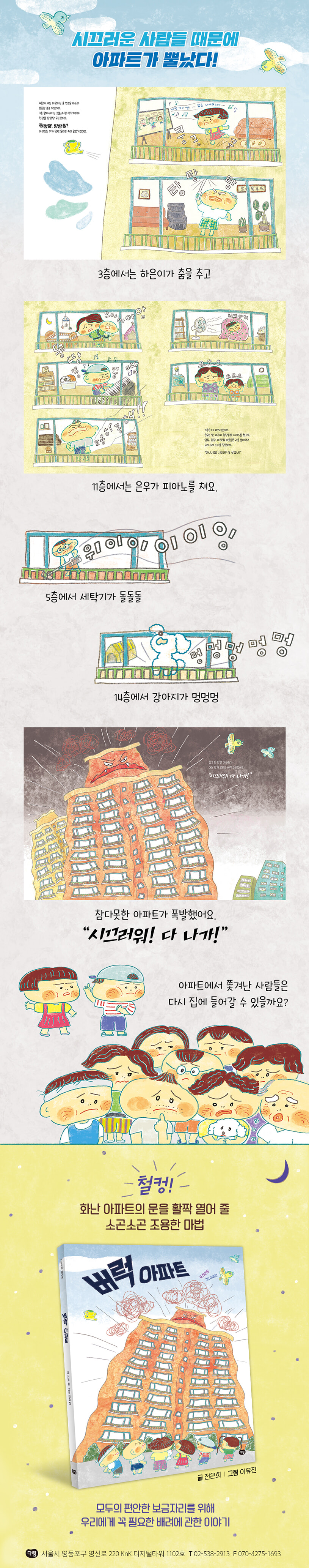 시끄러운 사람들 때문에 아파트가 뿔났다. 만약에 우리가 사는 아파트가 ‘시끄러워! 다 나가!’ 하고 소리친다면 어떻게 해야 할까요? 아침부터 밤까지 하루 종일 시끄럽게 하는 사람들 때문에 아파트는 한숨도 잘 수 없었어요. 참다못한 아파트는 버럭 소리를 지르며 사람들을 내쫓아 버리고는 문을 쾅 닫았어요. 열쇠공이 와서 문을 열어 보려 했지만 소용없었어요. 소방관도 출동했지만 마찬가지였어요. 굳게 문을 닫은 아파트를 두고 사람들은 편을 갈라 싸우기 시작했어요. 어떻게 하면 아파트의 화가 풀릴까요? 아파트에서 쫓겨난 사람들은 다시 아파트에 들어갈 수 있을까요? 화난 아파트의 마음도 사르르 녹이는 소곤소곤 맛있는 마법 집은 우리에게 편안한 쉴 곳이자 따듯한 보금자리가 되어 줘요. 그래서 많은 사람들이 함께 사는 아파트에서는 배려하는 마음이 필요해요. 나의 공간이 중요한 만큼 다른 사람의 공간도 존중해 줘야 해요. 쾅 닫힌 아파트 문을 뒤로 한 채 사람들은 한없이 아파트 문이 열리기만을 기다리고 있었어요. 그때 어디선가 맛있는 피자 냄새가 났어요. 아파트에서 춤을 추던 하은이는 피자를 사서 아랫집 할아버지에게 나눠 줬어요. 시끄럽게 피아노를 쳤던 은우도 이웃들에게 피자를 나눠 주면서 그동안 시끄럽게 해서 죄송하다고 사과를 했어요. 하은이와 은우의 작은 용기와 따듯한 마음이 점점 퍼져 나가면서 사람들의 얼굴에 미소가 가득 피어올랐어요. 함께 나눠 먹을 때 더욱 맛있는 피자처럼 마음은 나눌수록 배가 돼요. ‘그동안 죄송했어요.’, ‘이것 좀 드셔 보세요.’ 피자 한 조각에 실린 서로를 향한 마음이 아파트에게도 통한 걸까요? 철컹! 다시 아파트의 현관문이 열리고 사람들은 살금살금 아파트 안으로 들어갔어요. 함께 살아가기 위해 우리에게 필요한 건 대단한 게 아니에요. 서로를 향한 배려가 빛나는 순간 아파트의 문은 다시 활짝 열릴 거예요. |