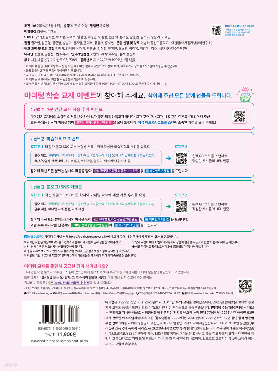 2. 2010~2021 시행 전국연합 학력평가 중요 기출문제 수록 3. 마더텅 전국연합 학력평가 기출문제집을 풀기 전에 푸는 기초 문제집 4. 이 과목을 처음 공부하는 학생이 쉽게 따라갈 수 있는 탄탄한 구성 5. 전 단원 개념 및 중요 문제 풀이 동영상 강의 무료 제공 6. 단계별로 차근차근 실력을 쌓는 체계적인 구성 step 1. 처음 이해하는 자세한 개념 step 2. 처음 이해하는 자세한 개념 step 3. 시험에 나오는 유형 문제 step 4. 실전 완성 중단원 종합 문제 7. 자세한 설명과 핵심 기본 문제로 원리를 이해하는 개념 학습 8. 다양한 실전 문제로 중간고사·기말고사 시험대비 |
