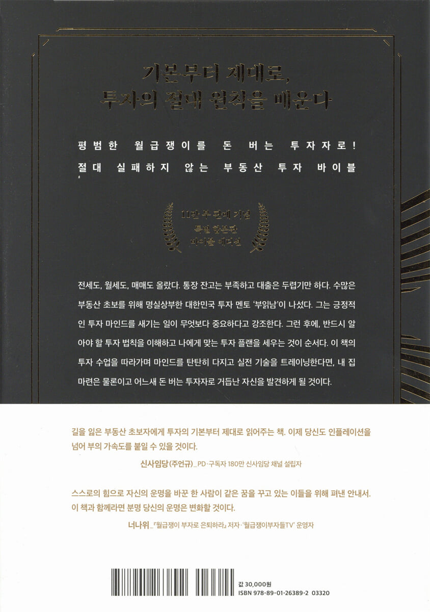 길을 잃은 부동산 초보자에게 투자의 기본부터 제대로 읽어주는 책이 드디어 출간되었다. 실전 경험과 해박한 투자 지식을 모두 갖춘 저자는 자신의 첫 저서를 통해 지금껏 쌓아올린 투자 노하우를 아낌없이 풀어놓았다. 이 책과 함께라면 분명 당신도 인플레이션을 넘어 부의 가속도를 붙일 수 있을 것이다. - 주언규 (신사임당, PD·구독자 180만 신사임당 채널 설립자)