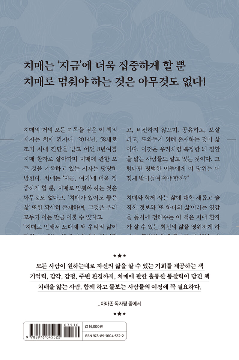 치매는 실망스러운 진단이지만, 모든 인생사가 그렇듯이 치매에도 시작과 중간, 끝이 있다. 이 병과 함께하는 여행에서 내가 어디 에 있는지 과연 누가 알겠는가. 현 시점에서 내가 보는 것은 치매를 안고 사는 내 이야기의 총량 중 한 조각일 뿐이다. 내 이야기가 다른 치매 환자가 영위하는 삶의 방식과 정말로 다른 것일까? 결국 내가 유일하게 확신하는 것은 다른 사람들과 마찬가지로 지금 의 나는 오늘만 알 수 있다는 것이다.